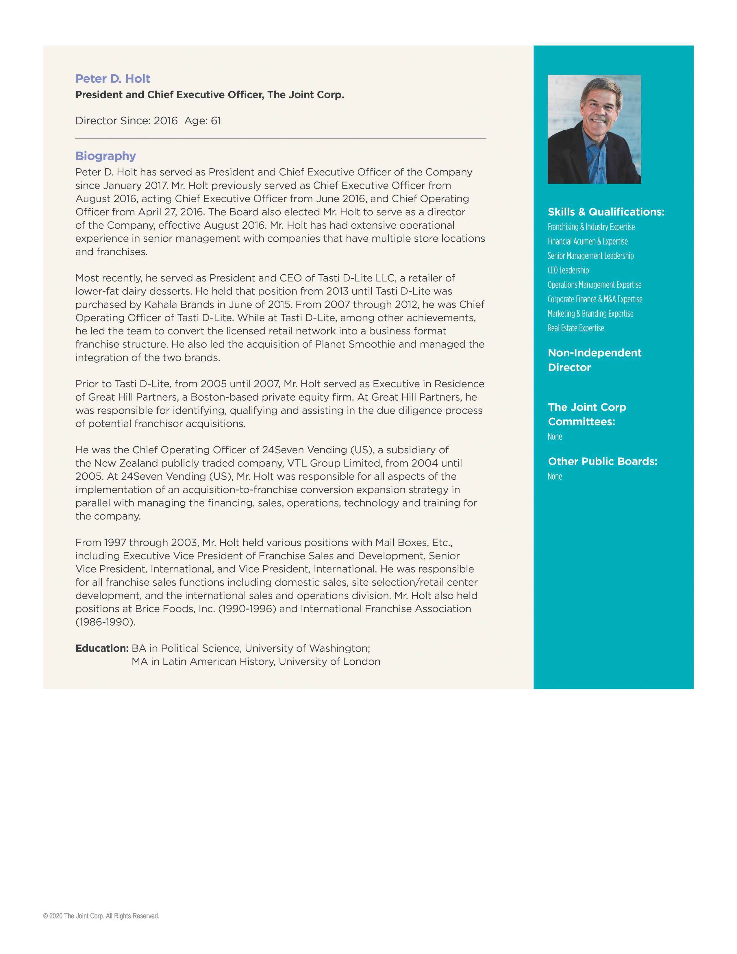 | Peter D. Holt | 61 | 2016 | President and Chief Executive Officer, The Joint Corp. | |||||