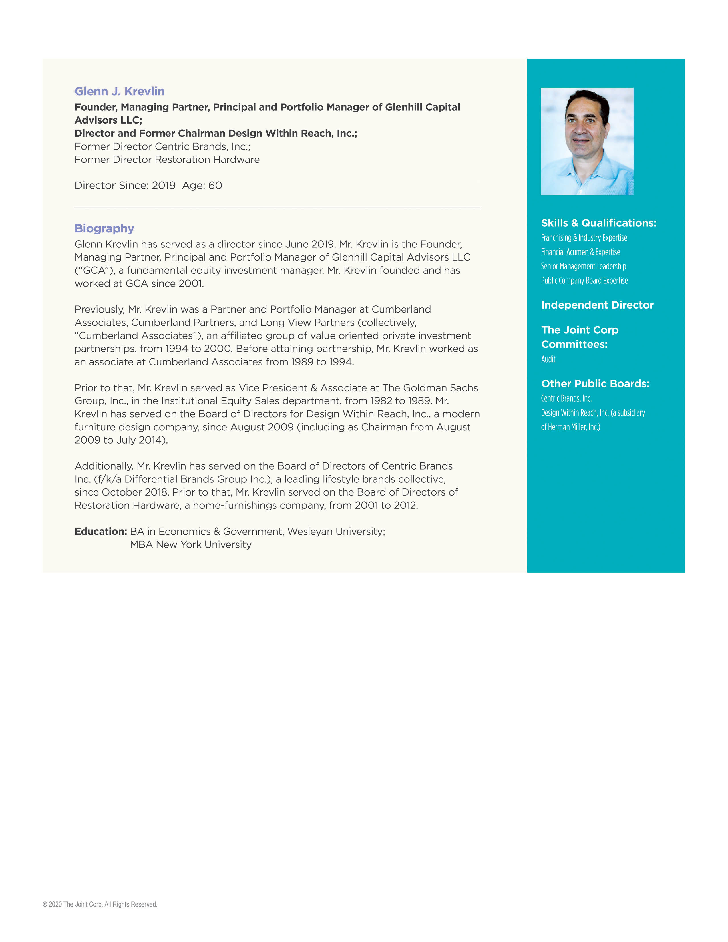 | Glenn J. Krevlin | 60 | 2019 | Founder, Managing Partner, Principal and Portfolio Manager of Glenhill Capital Advisors LLC; current director of Centric Brands, Inc. and Design Within Reach, Inc., and former director of Restoration Hardware, Inc. | · Audit |
