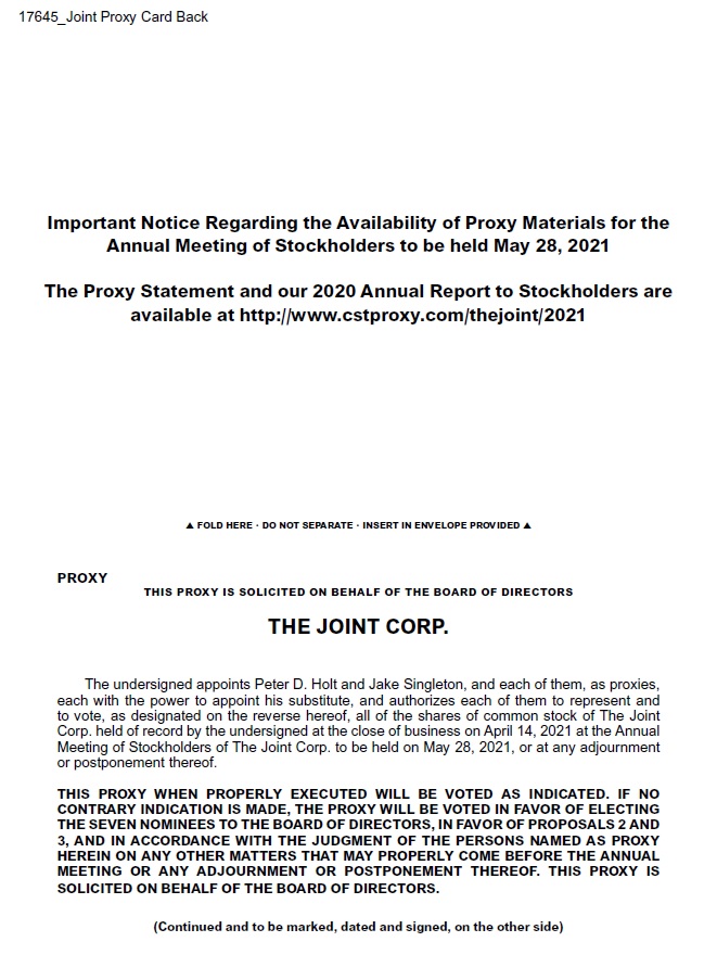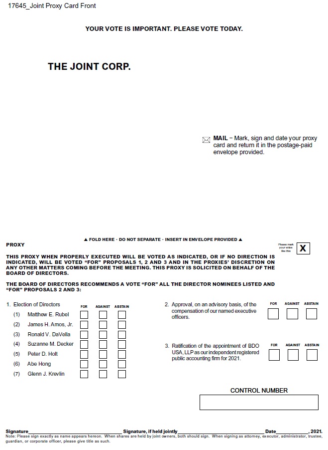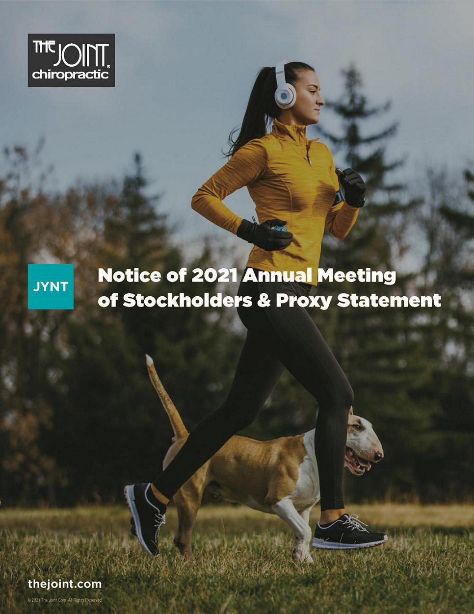 The Board of Directors of The Joint Corp. is soliciting proxies to vote shares of our stock at the 2021 Annual Meeting of Stockholders (the “Annual Meeting”) to be held on Friday, May 28, 2021, at 10:00 a.m. Mountain Standard Time at our executive offices located at 16767 N. Perimeter Drive, Suite 110, Scottsdale, Arizona 85260.