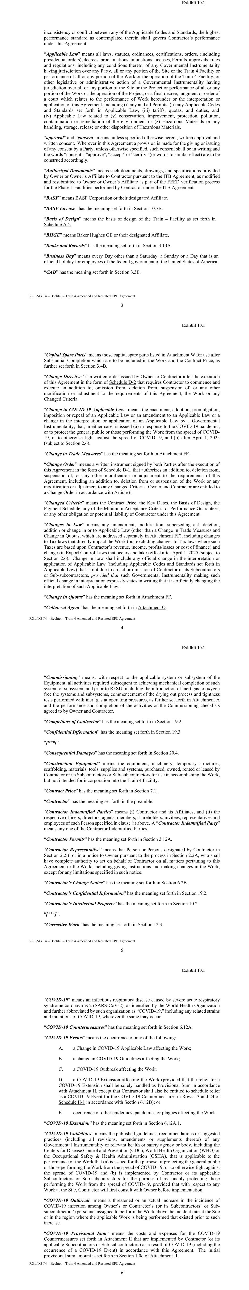 RGLNG T4 – Bechtel – Train 4 Amended and Restated EPC Agreement 3 Exhibit 10.1 inconsistency or conflict between any of the Applicable Codes and Standards, the highest performance standard as contemplated therein shall govern Contractor’s performance under this Agreement. “Applicable Law” means all laws, statutes, ordinances, certifications, orders, (including presidential orders), decrees, proclamations, injunctions, licenses, Permits, approvals, rules and regulations, including any conditions thereto, of any Governmental Instrumentality having jurisdiction over any Party, all or any portion of the Site or the Train 4 Facility or performance of all or any portion of the Work or the operation of the Train 4 Facility, or other legislative or administrative action of a Governmental Instrumentality having jurisdiction over all or any portion of the Site or the Project or performance of all or any portion of the Work or the operation of the Project, or a final decree, judgment or order of a court which relates to the performance of Work hereunder or the interpretation or application of this Agreement, including (i) any and all Permits, (ii) any Applicable Codes and Standards set forth in Applicable Law, (iii) tariffs, quotas, and duties, and (iv) Applicable Law related to (y) conservation, improvement, protection, pollution, contamination or remediation of the environment or (z) Hazardous Materials or any handling, storage, release or other disposition of Hazardous Materials. “approval” and “consent” means, unless specified otherwise herein, written approval and written consent. Wherever in this Agreement a provision is made for the giving or issuing of any consent by a Party, unless otherwise specified, such consent shall be in writing and the words “consent”, “approve”, “accept” or “certify” (or words to similar effect) are to be construed accordingly. “Authorized Documents” means such documents, drawings, and specifications provided by Owner or Owner’s Affiliate to Contractor pursuant to the ITB Agreement, as modified and resubmitted to Owner or Owner’s Affiliate as part of the FEED verification process for the Phase 1 Facilities performed by Contractor under the ITB Agreement. “BASF” means BASF Corporation or their designated Affiliate. “BASF License” has the meaning set forth in Section 10.7B. “Basis of Design” means the basis of design of the Train 4 Facility as set forth in Schedule A-2. “BHGE” means Baker Hughes GE or their designated Affiliate. “Books and Records” has the meaning set forth in Section 3.13A. “Business Day” means every Day other than a Saturday, a Sunday or a Day that is an official holiday for employees of the federal government of the United States of America. “CAD” has the meaning set forth in Section 3.3E. RGLNG T4 – Bechtel – Train 4 Amended and Restated EPC Agreement 4 Exhibit 10.1 “Capital Spare Parts” means those capital spare parts listed in Attachment W for use after Substantial Completion which are to be included in the Work and the Contract Price, as further set forth in Section 3.4B. “Change Directive” is a written order issued by Owner to Contractor after the execution of this Agreement in the form of Schedule D-2 that requires Contractor to commence and execute an addition to, omission from, deletion from, suspension of, or any other modification or adjustment to the requirements of this Agreement, the Work or any Changed Criteria. “Change in COVID-19 Applicable Law” means the enactment, adoption, promulgation, imposition or repeal of an Applicable Law or an amendment to an Applicable Law or a change in the interpretation or application of an Applicable Law by a Governmental Instrumentality, that, in either case, is issued (a) in response to the COVID-19 pandemic, or to protect the general public or those performing the Work from the spread of COVID- 19, or to otherwise fight against the spread of COVID-19, and (b) after April 1, 2025 (subject to Section 2.6). “Change in Trade Measures” has the meaning set forth in Attachment FF. “Change Order” means a written instrument signed by both Parties after the execution of this Agreement in the form of Schedule D-1, that authorizes an addition to, deletion from, suspension of, or any other modification or adjustment to the requirements of this Agreement, including an addition to, deletion from or suspension of the Work or any modification or adjustment to any Changed Criteria. Owner and Contractor are entitled to a Change Order in accordance with Article 6. “Changed Criteria” means the Contract Price, the Key Dates, the Basis of Design, the Payment Schedule, any of the Minimum Acceptance Criteria or Performance Guarantees, or any other obligation or potential liability of Contractor under this Agreement. “Changes in Law” means any amendment, modification, superseding act, deletion, addition or change in or to Applicable Law (other than a Change in Trade Measures and Change in Quotas, which are addressed separately in Attachment FF), including changes to Tax laws that directly impact the Work (but excluding changes to Tax laws where such Taxes are based upon Contractor’s revenue, income, profits/losses or cost of finance) and changes in Export Control Laws that occurs and takes effect after April 1, 2025 (subject to Section 2.6). Change in Law shall include any official change in the interpretation or application of Applicable Law (including Applicable Codes and Standards set forth in Applicable Law) that is not due to an act or omission of Contractor or its Subcontractors or Sub-subcontractors, provided that such Governmental Instrumentality making such official change in interpretation expressly states in writing that it is officially changing the interpretation of such Applicable Law. “Change in Quotas” has the meaning set forth in Attachment FF. “Collateral Agent” has the meaning set forth in Atta