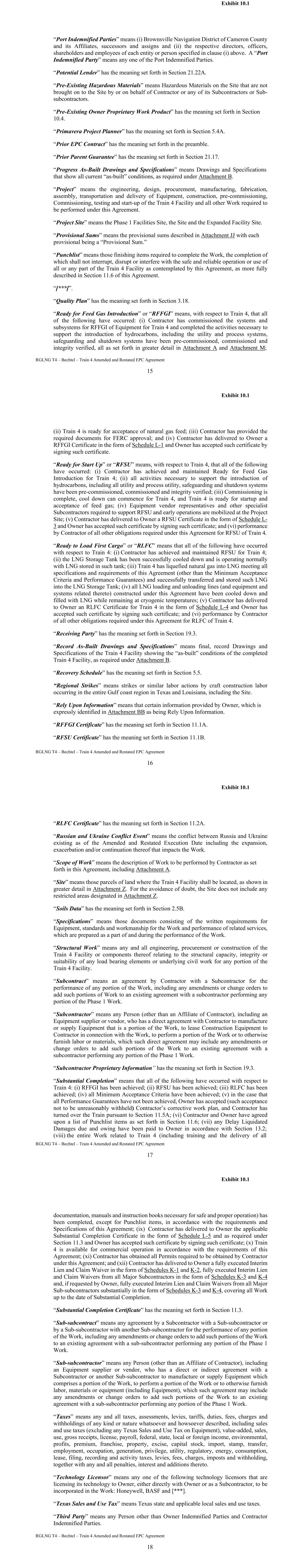 RGLNG T4 – Bechtel – Train 4 Amended and Restated EPC Agreement 11 Exhibit 10.1 “Indemnified Party” means any Owner Indemnified Party or Contractor Indemnified Party, as the context requires. “Indemnifying Party” means Owner or Contractor, as the context requires. “Independent Engineer” means the engineer(s) employed by Owner or Lender. “Information System” means any computer, hardware, software, control system, communications system, electronic device (including laptops and tablets) or microcontroller that is necessary for and an integral part of Contractor’s or its Subcontractors’ or Sub-subcontractors’ use in the prosecution of the Work. “Initial Exchange Rate” means the exchange rate set forth in Section 7.9. “Initial NTP Deadline” has the meaning set forth in Section 5.2. “Interim Lien and Claim Waiver” means the waiver and release provided to Owner by Contractor, Major Subcontractors and Major Sub-subcontractors in accordance with the requirements of Section 7.2C, which shall be in the form of Schedule K-1, Schedule K-2, Schedule K-3, and Schedule K-4. “Investment Grade” means a rating of at least A- by Standard & Poor’s and at least A3 by Moody’s Investors Service. “Invoice” means Contractor’s request for an interim payment pursuant to Section 7.2 and for final payment pursuant to Section 7.3, which invoice shall be in the form of Schedule I- 1 for interim payments and Schedule I-2 for final payment. “ISO” means the International Organization for Standardization. “Israel and Gaza Conflict” means the armed hostilities occurring anywhere in the Middle East or adjacent bodies of water as a result of or related to the conflict in Gaza between Israel and Hamas existing as of the Amended and Restated Execution Date, including the expansion, exacerbation and/or continuation thereof that impacts the Work. “ITB Agreement” means the Invitation to Bid Services Agreement between Rio Grande LNG, LLC and Bechtel Oil, Gas and Chemicals, Inc. dated August 31, 2018. “Key Dates” means the schedule of dates listed in Schedule E-1 and the Guaranteed Dates in which Contractor is required to achieve certain stages of completion of the Train 4 Facility. “Key Personnel” or “Key Persons” has the meaning set forth in Section 2.2A. “Lender” means any entity or entities providing temporary or permanent debt or equity financing to Owner for the Train 4 Facility, including interest rate hedge providers and any entity or entities involved in the refinancing of such debt or equity financing. RGLNG T4 – Bechtel – Train 4 Amended and Restated EPC Agreement 12 Exhibit 10.1 “Letter of Credit” has the meaning set forth in Section 9.2. “Limited Notice to Proceed” or “LNTP” means any limited notice to proceed issued in accordance with Schedule H-1 and Section 5.2B, authorizing and requiring Contractor to proceed with the Work identified in such LNTP. “Liquidated Damages” means Performance Liquidated Damages and Delay Liquidated Damages. “LNG” means liquefied natural gas. “LNG Storage Tank” means a full containment, double walled LNG storage tank to be constructed, with a working capacity of approximately one hundred and eighty thousand cubic meters (180,000 m3), as further defined herein. “LNG Storage Tank Pump-Out Rate Performance Test” or “LNG Storage Tank Pump- Out Rate Performance Testing” shall have the meaning set forth in Attachment S. “LNG Tanker” means any ocean-going vessel used by Owner, a customer of the Train 4 Facility or the Phase 1 Facilities or their designee for the transportation of LNG. “LNTP No. 1” has the meaning set forth in Section 5.2A. “Major Subcontract” means (i) any Subcontract having an aggregate value in excess of [***] U.S. Dollars (U.S.$[***]), (ii) multiple Subcontracts with one Subcontractor that have an aggregate value in excess of [***] U.S. Dollars (U.S.$[***]), or (iii) any Subcontract entered into with a Subcontractor for Work listed in Sections 2 and 3 of Attachment G. “Major Subcontractor” means any Subcontractor with whom Contractor enters, or intends to enter, into a Major Subcontract and the Subcontractors listed as such in Attachment G. “Major Sub-subcontract” means (i) any Sub-subcontract having an aggregate value in excess of [***] U.S. Dollars (U.S.$[***]), (ii) multiple Sub-subcontracts with one Sub- subcontractor that have an aggregate value in excess of [***] U.S. Dollars (U.S.$[***]), or (iii) any Sub-subcontract entered into with a Sub-subcontractor for Work listed in Sections 2 and 3 of Attachment G. “Major Sub-subcontractor” means any Sub-subcontractor with whom a Subcontractor or Sub-subcontractor enters, or intends to enter, into a Major Sub-subcontract and the Sub- subcontractors listed as such in Attachment G. “Maximum Cumulative Payment Schedule” has the meaning set forth in Section 7.2E. “Minimum Acceptance Criteria” or “MAC” means the minimum acceptance criteria specified in Attachment T. RGLNG T4 – Bechtel – Train 4 Amended and Restated EPC Agreement 13 Exhibit 10.1 “Minimum Acceptance Criteria Correction Period” has the meaning set forth in Section 11.5B. “Minimum Acceptance Criteria Correction Plan” has the meaning set forth in Section 11.5B. “Month” means a Gregorian calendar month; “month” means any period of thirty (30) consecutive Days. “Monthly” means an event occurring, or an action taken, once every Month. “Monthly Progress Reports” has the meaning set forth in Section 3.19A.4. “Monthly Updated CPM Schedule” has the meaning set forth in Section 5.4C. “Notice to Proceed” or “NTP” means the full notice to proceed issued in accordance with Schedule H-2 and Section 5.2D, authorizing and requiring Contractor to commence the performance of the entire Work. “OECD” has the meaning set forth in Section 21.10. “Ongoing Conflict Events” has the meaning set forth