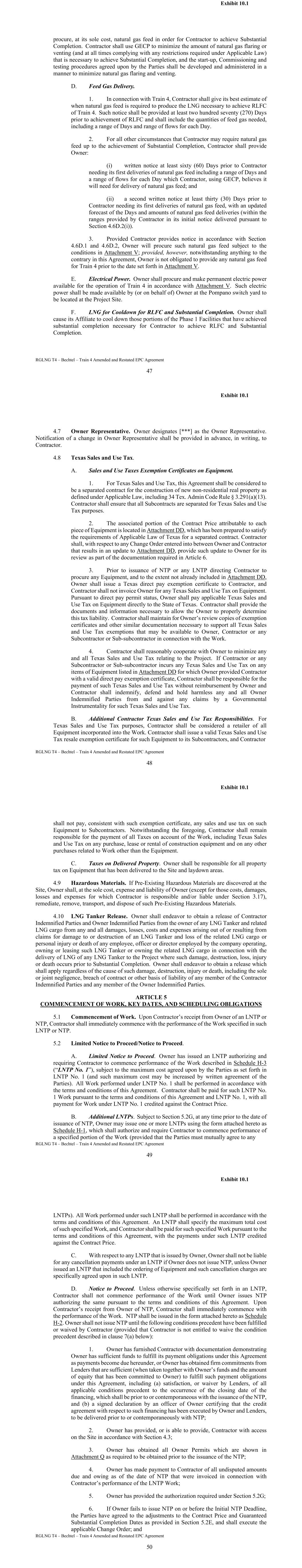 RGLNG T4 – Bechtel – Train 4 Amended and Restated EPC Agreement 47 Exhibit 10.1 procure, at its sole cost, natural gas feed in order for Contractor to achieve Substantial Completion. Contractor shall use GECP to minimize the amount of natural gas flaring or venting (and at all times complying with any restrictions required under Applicable Law) that is necessary to achieve Substantial Completion, and the start-up, Commissioning and testing procedures agreed upon by the Parties shall be developed and administered in a manner to minimize natural gas flaring and venting. D. Feed Gas Delivery. 1. In connection with Train 4, Contractor shall give its best estimate of when natural gas feed is required to produce the LNG necessary to achieve RLFC of Train 4. Such notice shall be provided at least two hundred seventy (270) Days prior to achievement of RLFC and shall include the quantities of feed gas needed, including a range of Days and range of flows for each Day. 2. For all other circumstances that Contractor may require natural gas feed up to the achievement of Substantial Completion, Contractor shall provide Owner: (i) written notice at least sixty (60) Days prior to Contractor needing its first deliveries of natural gas feed including a range of Days and a range of flows for each Day which Contractor, using GECP, believes it will need for delivery of natural gas feed; and (ii) a second written notice at least thirty (30) Days prior to Contractor needing its first deliveries of natural gas feed, with an updated forecast of the Days and amounts of natural gas feed deliveries (within the ranges provided by Contractor in its initial notice delivered pursuant to Section 4.6D.2(i)). 3. Provided Contractor provides notice in accordance with Section 4.6D.1 and 4.6D.2, Owner will procure such natural gas feed subject to the conditions in Attachment V; provided, however, notwithstanding anything to the contrary in this Agreement, Owner is not obligated to provide any natural gas feed for Train 4 prior to the date set forth in Attachment V. E. Electrical Power. Owner shall procure and make permanent electric power available for the operation of Train 4 in accordance with Attachment V. Such electric power shall be made available by (or on behalf of) Owner at the Pompano switch yard to be located at the Project Site. F. LNG for Cooldown for RLFC and Substantial Completion. Owner shall cause its Affiliate to cool down those portions of the Phase 1 Facilities that have achieved substantial completion necessary for Contractor to achieve RLFC and Substantial Completion. RGLNG T4 – Bechtel – Train 4 Amended and Restated EPC Agreement 48 Exhibit 10.1 4.7 Owner Representative. Owner designates [***] as the Owner Representative. Notification of a change in Owner Representative shall be provided in advance, in writing, to Contractor. 4.8 Texas Sales and Use Tax. A. Sales and Use Taxes Exemption Certificates on Equipment. 1. For Texas Sales and Use Tax, this Agreement shall be considered to be a separated contract for the construction of new non-residential real property as defined under Applicable Law, including 34 Tex. Admin Code Rule § 3.291(a)(13). Contractor shall ensure that all Subcontracts are separated for Texas Sales and Use Tax purposes. 2. The associated portion of the Contract Price attributable to each piece of Equipment is located in Attachment DD, which has been prepared to satisfy the requirements of Applicable Law of Texas for a separated contract. Contractor shall, with respect to any Change Order entered into between Owner and Contractor that results in an update to Attachment DD, provide such update to Owner for its review as part of the documentation required in Article 6. 3. Prior to issuance of NTP or any LNTP directing Contractor to procure any Equipment, and to the extent not already included in Attachment DD, Owner shall issue a Texas direct pay exemption certificate to Contractor, and Contractor shall not invoice Owner for any Texas Sales and Use Tax on Equipment. Pursuant to direct pay permit status, Owner shall pay applicable Texas Sales and Use Tax on Equipment directly to the State of Texas. Contractor shall provide the documents and information necessary to allow the Owner to properly determine this tax liability. Contractor shall maintain for Owner’s review copies of exemption certificates and other similar documentation necessary to support all Texas Sales and Use Tax exemptions that may be available to Owner, Contractor or any Subcontractor or Sub-subcontractor in connection with the Work. 4. Contractor shall reasonably cooperate with Owner to minimize any and all Texas Sales and Use Tax relating to the Project. If Contractor or any Subcontractor or Sub-subcontractor incurs any Texas Sales and Use Tax on any items of Equipment listed in Attachment DD for which Owner provided Contractor with a valid direct pay exemption certificate, Contractor shall be responsible for the payment of such Texas Sales and Use Tax without reimbursement by Owner and Contractor shall indemnify, defend and hold harmless any and all Owner Indemnified Parties from and against any claims by a Governmental Instrumentality for such Texas Sales and Use Tax. B. Additional Contractor Texas Sales and Use Tax Responsibilities. For Texas Sales and Use Tax purposes, Contractor shall be considered a retailer of all Equipment incorporated into the Work. Contractor shall issue a valid Texas Sales and Use Tax resale exemption certificate for such Equipment to its Subcontractors, and Contractor RGLNG T4 – Bechtel – Train 4 Amended and Restated EPC Agreement 49 Exhibit 10.1 shall not pay, consistent with such exemption certificate, any sales and use tax on such Equipment to Subcontractors. Notwithstanding the foregoing, Contractor shall remain responsible for the payment of all Taxes on account of the Work, including Texas Sales and Use Tax on any purchase, lease or rental of construction equipment and 