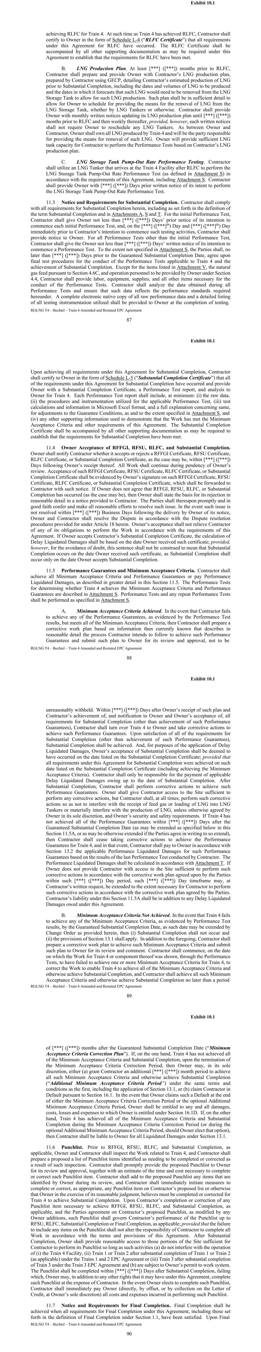 RGLNG T4 – Bechtel – Train 4 Amended and Restated EPC Agreement 87 Exhibit 10.1 achieving RLFC for Train 4. At such time as Train 4 has achieved RLFC, Contractor shall certify to Owner in the form of Schedule L-4 (“RLFC Certificate”) that all requirements under this Agreement for RLFC have occurred. The RLFC Certificate shall be accompanied by all other supporting documentation as may be required under this Agreement to establish that the requirements for RLFC have been met. B. LNG Production Plan. At least [***] ([***]) months prior to RLFC, Contractor shall prepare and provide Owner with Contractor’s LNG production plan, prepared by Contractor using GECP, detailing Contractor’s estimated production of LNG prior to Substantial Completion, including the dates and volumes of LNG to be produced and the dates in which it forecasts that such LNG would need to be removed from the LNG Storage Tank to allow for such LNG production. Such plan shall be in sufficient detail to allow for Owner to schedule for providing the means for the removal of LNG from the LNG Storage Tank, whether by LNG Tankers or otherwise. Contractor shall provide Owner with monthly written notices updating its LNG production plan until [***] ([***]) months prior to RLFC and then weekly thereafter, provided, however, such written notices shall not require Owner to reschedule any LNG Tankers. As between Owner and Contractor, Owner shall own all LNG produced by Train 4 and will be the party responsible for providing the means for removal of such LNG. Owner will provide sufficient LNG tank capacity for Contractor to perform the Performance Tests based on Contractor’s LNG production plan. C. LNG Storage Tank Pump-Out Rate Performance Testing. Contractor shall utilize an LNG Tanker that arrives at the Train 4 Facility after RLFC to perform the LNG Storage Tank Pump-Out Rate Performance Test (as defined in Attachment S) in accordance with the requirements of this Agreement, including Attachment S. Contractor shall provide Owner with [***] ([***]) Days prior written notice of its intent to perform the LNG Storage Tank Pump-Out Rate Performance Test. 11.3 Notice and Requirements for Substantial Completion. Contractor shall comply with all requirements for Substantial Completion herein, including as set forth in the definition of the term Substantial Completion and in Attachments A, S and T. For the initial Performance Test, Contractor shall give Owner not less than [***] ([***]) Days’ prior notice of its intention to commence each initial Performance Test, and, on the [***] ([***]th) Day and [***] ([***]th) Day immediately prior to Contractor’s intention to commence such testing activities, Contractor shall provide notice to Owner. For all Performance Tests other than the initial Performance Test, Contractor shall give the Owner not less than [***] ([***]) Days’ written notice of its intention to commence a Performance Test. To the extent not specified in Attachment S, the Parties shall, no later than [***] ([***]) Days prior to the Guaranteed Substantial Completion Date, agree upon final test procedures for the conduct of the Performance Tests applicable to Train 4 and the achievement of Substantial Completion. Except for the items listed in Attachment V, the natural gas feed pursuant to Section 4.6C, and operation personnel to be provided by Owner under Section 4.4, Contractor shall provide labor, equipment, supplies, and all other items necessary for the conduct of the Performance Tests. Contractor shall analyze the data obtained during all Performance Tests and ensure that such data reflects the performance standards required hereunder. A complete electronic native copy of all raw performance data and a detailed listing of all testing instrumentation utilized shall be provided to Owner at the completion of testing. RGLNG T4 – Bechtel – Train 4 Amended and Restated EPC Agreement 88 Exhibit 10.1 Upon achieving all requirements under this Agreement for Substantial Completion, Contractor shall certify to Owner in the form of Schedule L-5 (“Substantial Completion Certificate”) that all of the requirements under this Agreement for Substantial Completion have occurred and provide Owner with a Substantial Completion Certificate, a Performance Test report, and analysis to Owner for Train 4. Each Performance Test report shall include, at minimum: (i) the raw data, (ii) the procedures and instrumentation utilized for the applicable Performance Test, (iii) test calculations and information in Microsoft Excel format, and a full explanation concerning same, for adjustments to the Guarantee Conditions, as and to the extent specified in Attachment S, and (iv) any other supporting information used to demonstrate that the Work has met the Minimum Acceptance Criteria and other requirements of this Agreement. The Substantial Completion Certificate shall be accompanied by all other supporting documentation as may be required to establish that the requirements for Substantial Completion have been met. 11.4 Owner Acceptance of RFFGI, RFSU, RLFC, and Substantial Completion. Owner shall notify Contractor whether it accepts or rejects a RFFGI Certificate, RFSU Certificate, RLFC Certificate, or Substantial Completion Certificate, as the case may be, within [***] ([***]) Days following Owner’s receipt thereof. All Work shall continue during pendency of Owner’s review. Acceptance of such RFFGI Certificate, RFSU Certificate, RLFC Certificate, or Substantial Completion Certificate shall be evidenced by Owner’s signature on such RFFGI Certificate, RFSU Certificate, RLFC Certificate, or Substantial Completion Certificate, which shall be forwarded to Contractor with such notice. If Owner does not agree that RFFGI, RFSU, RLFC, or Substantial Completion has occurred (as the case may be), then Owner shall state the basis for its rejection in reasonable detail in a notice provided to Contractor. The Parties shall thereupon promptly