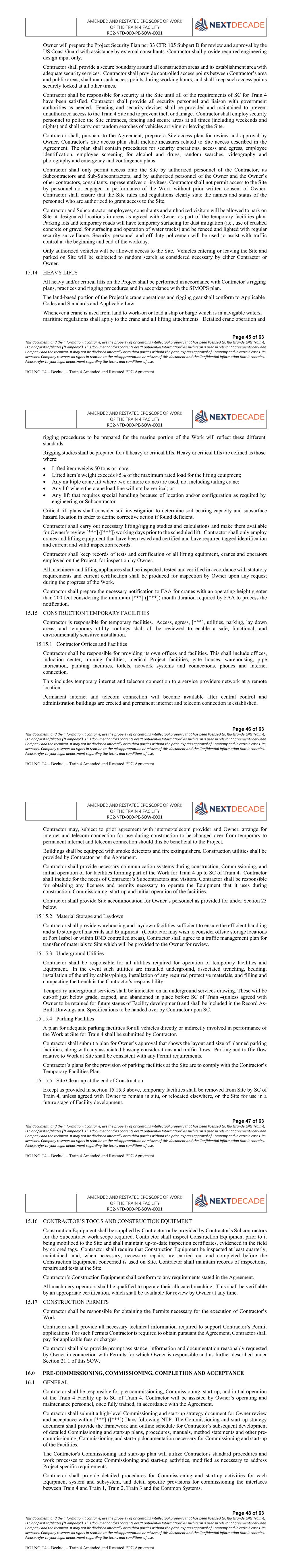 Page 5 of 63 This document, and the information it contains, are the property of or contains intellectual property that has been licensed to, Rio Grande LNG Train 4, LLC and/or its affiliates (“Company”). This document and its contents are “Confidential Information” as such term is used in relevant agreements between Company and the recipient. It may not be disclosed internally or to third parties without the prior, express approval of Company and in certain cases, its licensors. Company reserves all rights in relation to the misappropriation or misuse of this document and the Confidential Information that it contains. Please refer to your legal department regarding the terms and conditions of use. RGLNG T4 – Bechtel – Train 4 Amended and Restated EPC Agreement AMENDED AND RESTATED EPC SCOPE OF WORK OF THE TRAIN 4 FACILITY RG2-NTD-000-PE-SOW-0001 16.0 PRE-COMMISSIONING, COMMISSIONING, COMPLETION AND ACCEPTANCE ............................... 48 16.1 General ....................................................................................................................................................... 48 16.2 Commencement of Commissioning and Start-up .................................................................................... 49 16.3 Operator Training ..................................................................................................................................... 49 16.4 Operations Tests ........................................................................................................................................ 49 17.0 SIMULTANEOUS OPERATIONS ...................................................................................................................... 49 18.0 OPERATIONS AND MAINTENANCE MANAGEMENT SYSTEMS AND PROCEDURES ....................... 50 18.1 Asset Integrity Management Systems ...................................................................................................... 50 18.2 Operations Management Procedures ....................................................................................................... 50 18.3 Operations and Maintenance PROCEDURES and Manuals ................................................................. 50 19.0 PREPARATION OF PRECOMMISSIONING, COMMISSIONING, AND INITIAL START- UP PROCEDURES AND MANUALS ................................................................................................................. 51 20.0 CONTRACTOR PROVIDED TRAINING FOR OWNER PERSONNEL ....................................................... 52 20.1 Updating of Operations TrainiNg Simulator ........................................................................................... 52 20.2 Preparation of Training Materials ........................................................................................................... 52 20.3 Preparation of Training Materials for Subcontractor Equipment Packages ........................................ 52 20.4 Training Courses ....................................................................................................................................... 52 20.5 Training Courses for Vendor Equipment Packages ............................................................................... 53 21.0 ASSISTANCE TO OWNER.................................................................................................................................. 53 21.1 Required Submissions to Regulatory Agencies ....................................................................................... 53 21.2 Technical Support to Owner’s Regulatory Services Consultants .......................................................... 53 22.0 THIRD-PARTY INTERFACES ........................................................................................................................... 53 22.1 Feed Gas Supply Interface with Rio Bravo Pipeline ............................................................................... 53 22.2 NOT USED ................................................................................................................................................. 54 22.3 NOT USED ................................................................................................................................................. 54 22.4 NOT USED ................................................................................................................................................. 54 22.5 138 kV Switchyard Interface with AEP (POMPANO) ........................................................................... 54 22.6 NOT USED ................................................................................................................................................. 55 22.7 Temporary fencing and utilities for expansion options ........................................................................... 55 22.8 Brownsville Navigation District Tariff ..................................................................................................... 55 22.9 Environmental Impact Statement Division of Responsibility ................................................................. 56 23.0 FACILITIES FOR OWNER PERSONNEL ........................................................................................................ 56 23.1 Office Accommodation for Owner personnel in Contractor’s Home Office ......................................... 56 23.2 Temporary Facilities Provided at Site by Contractor for Owner’s Project Personnel ......................... 56 24.0 PERFORMANCE GUARANTEES AND PERFORMANCE TESTING .......................................................... 56 25.0 PROCESS LICENSE FEES .................................................................................................................................. 56 26.0 DOCUMENT NUMBERING ........................................................................................................