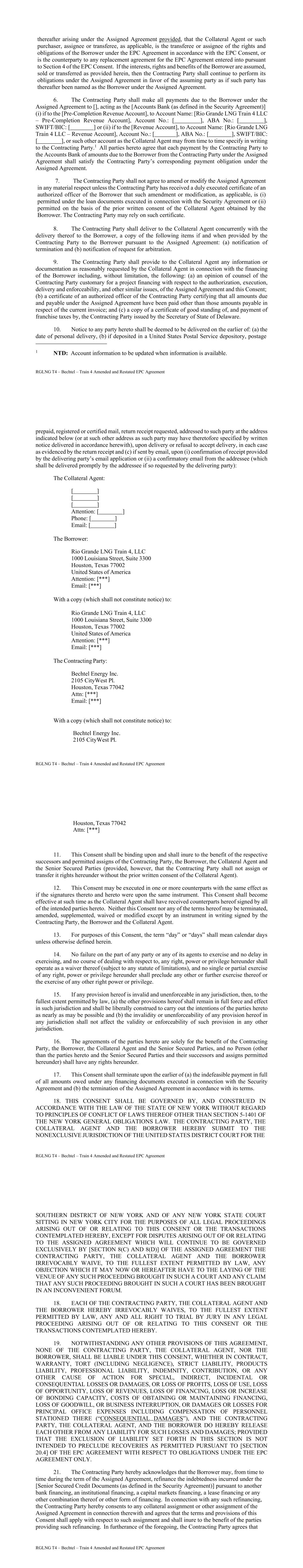 RGLNG T4 – Bechtel – Train 4 Amended and Restated EPC Agreement thereafter arising under the Assigned Agreement provided, that the Collateral Agent or such purchaser, assignee or transferee, as applicable, is the transferee or assignee of the rights and obligations of the Borrower under the EPC Agreement in accordance with the EPC Consent, or is the counterparty to any replacement agreement for the EPC Agreement entered into pursuant to Section 4 of the EPC Consent. If the interests, rights and benefits of the Borrower are assumed, sold or transferred as provided herein, then the Contracting Party shall continue to perform its obligations under the Assigned Agreement in favor of the assuming party as if such party has thereafter been named as the Borrower under the Assigned Agreement. 6. The Contracting Party shall make all payments due to the Borrower under the Assigned Agreement to [], acting as the [Accounts Bank (as defined in the Security Agreement)] (i) if to the [Pre-Completion Revenue Account], to Account Name: [Rio Grande LNG Train 4 LLC – Pre-Completion Revenue Account], Account No.: [ ], ABA No.: [ ], SWIFT/BIC: [ ] or (ii) if to the [Revenue Account], to Account Name: [Rio Grande LNG Train 4 LLC – Revenue Account], Account No.: [ ], ABA No.: [ ], SWIFT/BIC: [ ], or such other account as the Collateral Agent may from time to time specify in writing to the Contracting Party.1 All parties hereto agree that each payment by the Contracting Party to the Accounts Bank of amounts due to the Borrower from the Contracting Party under the Assigned Agreement shall satisfy the Contracting Party’s corresponding payment obligation under the Assigned Agreement. 7. The Contracting Party shall not agree to amend or modify the Assigned Agreement in any material respect unless the Contracting Party has received a duly executed certificate of an authorized officer of the Borrower that such amendment or modification, as applicable, is (i) permitted under the loan documents executed in connection with the Security Agreement or (ii) permitted on the basis of the prior written consent of the Collateral Agent obtained by the Borrower. The Contracting Party may rely on such certificate. 8. The Contracting Party shall deliver to the Collateral Agent concurrently with the delivery thereof to the Borrower, a copy of the following items if and when provided by the Contracting Party to the Borrower pursuant to the Assigned Agreement: (a) notification of termination and (b) notification of request for arbitration. 9. The Contracting Party shall provide to the Collateral Agent any information or documentation as reasonably requested by the Collateral Agent in connection with the financing of the Borrower including, without limitation, the following: (a) an opinion of counsel of the Contracting Party customary for a project financing with respect to the authorization, execution, delivery and enforceability, and other similar issues, of the Assigned Agreement and this Consent; (b) a certificate of an authorized officer of the Contracting Party certifying that all amounts due and payable under the Assigned Agreement have been paid other than those amounts payable in respect of the current invoice; and (c) a copy of a certificate of good standing of, and payment of franchise taxes by, the Contracting Party issued by the Secretary of State of Delaware. 10. Notice to any party hereto shall be deemed to be delivered on the earlier of: (a) the date of personal delivery, (b) if deposited in a United States Postal Service depository, postage 1 NTD: Account information to be updated when information is available. RGLNG T4 – Bechtel – Train 4 Amended and Restated EPC Agreement prepaid, registered or certified mail, return receipt requested, addressed to such party at the address indicated below (or at such other address as such party may have theretofore specified by written notice delivered in accordance herewith), upon delivery or refusal to accept delivery, in each case as evidenced by the return receipt and (c) if sent by email, upon (i) confirmation of receipt provided by the delivering party’s email application or (ii) a confirmatory email from the addressee (which shall be delivered promptly by the addressee if so requested by the delivering party): The Collateral Agent: [ ] [ ] [ ] Attention: [ ] Phone: [ ] Email: [ ] The Borrower: Rio Grande LNG Train 4, LLC 1000 Louisiana Street, Suite 3300 Houston, Texas 77002 United States of America Attention: [***] Email: [***] With a copy (which shall not constitute notice) to: Rio Grande LNG Train 4, LLC 1000 Louisiana Street, Suite 3300 Houston, Texas 77002 United States of America Attention: [***] Email: [***] The Contracting Party: Bechtel Energy Inc. 2105 CityWest Pl. Houston, Texas 77042 Attn: [***] Email: [***] With a copy (which shall not constitute notice) to: Bechtel Energy Inc. 2105 CityWest Pl. RGLNG T4 – Bechtel – Train 4 Amended and Restated EPC Agreement Houston, Texas 77042 Attn: [***] 11. This Consent shall be binding upon and shall inure to the benefit of the respective successors and permitted assigns of the Contracting Party, the Borrower, the Collateral Agent and the Senior Secured Parties (provided, however, that the Contracting Party shall not assign or transfer it rights hereunder without the prior written consent of the Collateral Agent). 12. This Consent may be executed in one or more counterparts with the same effect as if the signatures thereto and hereto were upon the same instrument. This Consent shall become effective at such time as the Collateral Agent shall have received counterparts hereof signed by all of the intended parties hereto. Neither this Consent nor any of the terms hereof may be terminated, amended, supplemented, waived or modified except by an instrument in writing signed by the Contracting Party, the Borrower and the Collateral Agent. 13. For purposes of this Consent, the term “day” or “days” shall