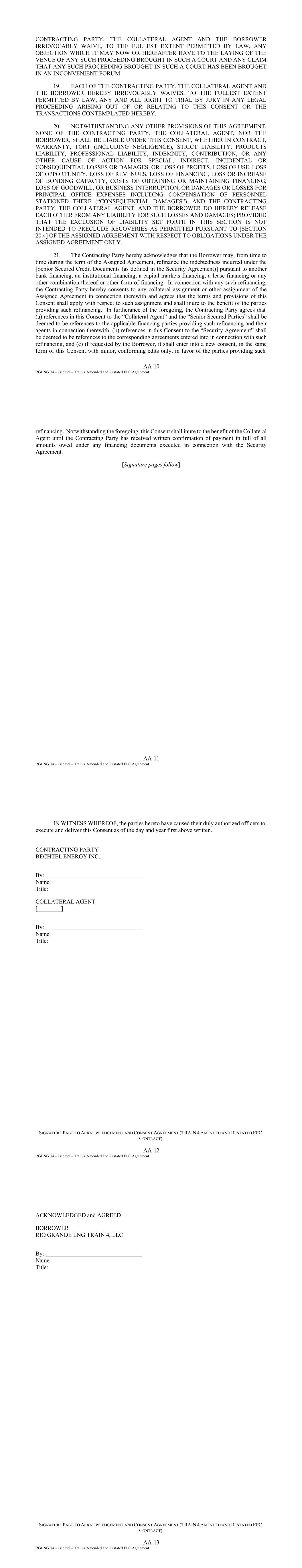 AA-10 RGLNG T4 – Bechtel – Train 4 Amended and Restated EPC Agreement CONTRACTING PARTY, THE COLLATERAL AGENT AND THE BORROWER IRREVOCABLY WAIVE, TO THE FULLEST EXTENT PERMITTED BY LAW, ANY OBJECTION WHICH IT MAY NOW OR HEREAFTER HAVE TO THE LAYING OF THE VENUE OF ANY SUCH PROCEEDING BROUGHT IN SUCH A COURT AND ANY CLAIM THAT ANY SUCH PROCEEDING BROUGHT IN SUCH A COURT HAS BEEN BROUGHT IN AN INCONVENIENT FORUM. 19. EACH OF THE CONTRACTING PARTY, THE COLLATERAL AGENT AND THE BORROWER HEREBY IRREVOCABLY WAIVES, TO THE FULLEST EXTENT PERMITTED BY LAW, ANY AND ALL RIGHT TO TRIAL BY JURY IN ANY LEGAL PROCEEDING ARISING OUT OF OR RELATING TO THIS CONSENT OR THE TRANSACTIONS CONTEMPLATED HEREBY. 20. NOTWITHSTANDING ANY OTHER PROVISIONS OF THIS AGREEMENT, NONE OF THE CONTRACTING PARTY, THE COLLATERAL AGENT, NOR THE BORROWER, SHALL BE LIABLE UNDER THIS CONSENT, WHETHER IN CONTRACT, WARRANTY, TORT (INCLUDING NEGLIGENCE), STRICT LIABILITY, PRODUCTS LIABILITY, PROFESSIONAL LIABILITY, INDEMNITY, CONTRIBUTION, OR ANY OTHER CAUSE OF ACTION FOR SPECIAL, INDIRECT, INCIDENTAL OR CONSEQUENTIAL LOSSES OR DAMAGES, OR LOSS OF PROFITS, LOSS OF USE, LOSS OF OPPORTUNITY, LOSS OF REVENUES, LOSS OF FINANCING, LOSS OR INCREASE OF BONDING CAPACITY, COSTS OF OBTAINING OR MAINTAINING FINANCING, LOSS OF GOODWILL, OR BUSINESS INTERRUPTION, OR DAMAGES OR LOSSES FOR PRINCIPAL OFFICE EXPENSES INCLUDING COMPENSATION OF PERSONNEL STATIONED THERE (“CONSEQUENTIAL DAMAGES”), AND THE CONTRACTING PARTY, THE COLLATERAL AGENT, AND THE BORROWER DO HEREBY RELEASE EACH OTHER FROM ANY LIABILITY FOR SUCH LOSSES AND DAMAGES; PROVIDED THAT THE EXCLUSION OF LIABILITY SET FORTH IN THIS SECTION IS NOT INTENDED TO PRECLUDE RECOVERIES AS PERMITTED PURSUANT TO [SECTION 20.4] OF THE ASSIGNED AGREEMENT WITH RESPECT TO OBLIGATIONS UNDER THE ASSIGNED AGREEMENT ONLY. 21. The Contracting Party hereby acknowledges that the Borrower may, from time to time during the term of the Assigned Agreement, refinance the indebtedness incurred under the [Senior Secured Credit Documents (as defined in the Security Agreement)] pursuant to another bank financing, an institutional financing, a capital markets financing, a lease financing or any other combination thereof or other form of financing. In connection with any such refinancing, the Contracting Party hereby consents to any collateral assignment or other assignment of the Assigned Agreement in connection therewith and agrees that the terms and provisions of this Consent shall apply with respect to such assignment and shall inure to the benefit of the parties providing such refinancing. In furtherance of the foregoing, the Contracting Party agrees that (a) references in this Consent to the “Collateral Agent” and the “Senior Secured Parties” shall be deemed to be references to the applicable financing parties providing such refinancing and their agents in connection therewith, (b) references in this Consent to the “Security Agreement” shall be deemed to be references to the corresponding agreements entered into in connection with such refinancing, and (c) if requested by the Borrower, it shall enter into a new consent, in the same form of this Consent with minor, conforming edits only, in favor of the parties providing such AA-11 RGLNG T4 – Bechtel – Train 4 Amended and Restated EPC Agreement refinancing. Notwithstanding the foregoing, this Consent shall inure to the benefit of the Collateral Agent until the Contracting Party has received written confirmation of payment in full of all amounts owed under any financing documents executed in connection with the Security Agreement. [Signature pages follow] SIGNATURE PAGE TO ACKNOWLEDGEMENT AND CONSENT AGREEMENT (TRAIN 4 AMENDED AND RESTATED EPC CONTRACT) AA-12 RGLNG T4 – Bechtel – Train 4 Amended and Restated EPC Agreement IN WITNESS WHEREOF, the parties hereto have caused their duly authorized officers to execute and deliver this Consent as of the day and year first above written. CONTRACTING PARTY BECHTEL ENERGY INC. By: Name: Title: COLLATERAL AGENT [ ] By: Name: Title: SIGNATURE PAGE TO ACKNOWLEDGEMENT AND CONSENT AGREEMENT (TRAIN 4 AMENDED AND RESTATED EPC CONTRACT) AA-13 RGLNG T4 – Bechtel – Train 4 Amended and Restated EPC Agreement ACKNOWLEDGED and AGREED BORROWER RIO GRANDE LNG TRAIN 4, LLC By: Name: Title:
