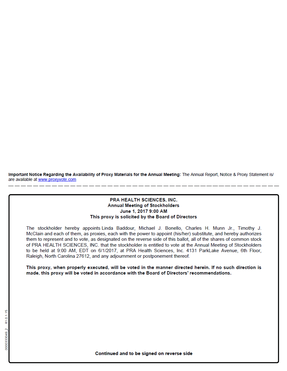 Important Notice Regarding the Availability of Proxy Materials for the Annual Meeting: The Annual Report, Notice & Proxy Statement is/ are available at www.proxyvote.com PRA HEALTH SCIENCES, INC. Annual Meeting of Stockholders June 1, 2017 9:00 AM This proxy is solicited by the Board of Directors The stockholder hereby appoints Linda Baddour, Michael J. Bonello, Charles H. Munn Jr., Timothy J. McClain and each of them, as proxies, each with the power to appoint (his/her) substitute, and hereby authorizes them to represent and to vote, as designated on the reverse side of this ballot, all of the shares of common stock of PRA HEALTH SCIENCES, INC. that the stockholder is entitled to vote at the Annual Meeting of Stockholders to be held at 9:00 AM, EDT on 6/1/2017, at PRA Health Sciences, Inc. 4131 ParkLake Avenue, 6th Floor, Raleigh, North Carolina 27612, and any adjournment or postponement thereof. 0000333049_2 R1.0.1.15 Continued and to be signed on reverse side