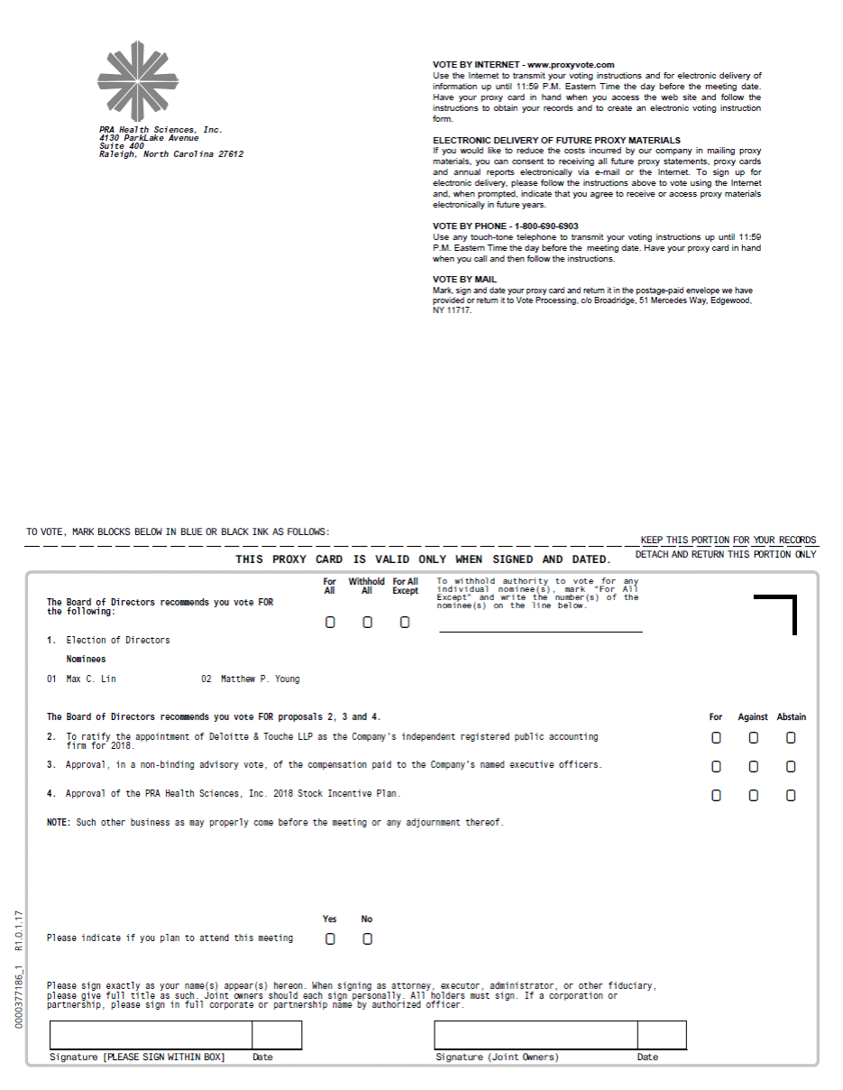 VOTE BY INTERNET - www.proxyvote.com Use the Internet to transmit your voting instructions and for electronic delivery of information up until 11:59 P.M. Eastern Time the day before the meeting date. Have your proxy card in hand when you access the web site and follow the instructions to obtain your records and to create an electronic voting instruction form. PRA Health Sciences, Inc. 4130 ParkLake Avenue ELECTRONIC DELIVERY OF FUTURE PROXY MATERIALS If you would like to reduce the costs incurred by our company in mailing proxy materials, you can consent to receiving all future proxy statements, proxy cards and annual reports electronically via e-mail or the Internet. To sign up for electronic delivery, please follow the instructions above to vote using the Internet and, when prompted, indicate that you agree to receive or access proxy materials electronically in future years. Suite 400 Raleigh, North Carolina 27612 VOTE BY PHONE - 1-800-690-6903 Use any touch-tone telephone to transmit your voting instructions up until 11:59 P.M. Eastern Time the day before the meeting date. Have your proxy card in hand when you call and then follow the instructions. VOTE BY MAIL Mark, sign and date your proxy card and return it in the postage-paid envelope we have provided or return it to Vote Processing, c/o Broadridge, 51 Mercedes Way, Edgewood, NY 11717. TO VOTE, MARK BLOCKS BELOW IN BLUE OR BLACK INK AS FOLLOWS: KEEP THIS PORTION FOR YOUR RECORDS DETACH AND RETURN THIS PORTION ONLY THIS PROXY CARD IS VALID ONLY WHEN SIGNED AND DATED. For Withhold For All Except To withhold authority to vote for any individual nominee(s), mark “For All Except” and write the number(s) of the AllAll The Board of Directors recommends you vote FOR the following: nominee(s) on the line below. 0 0 0 1. Election of Directors Nominees 01 Max C. Lin 02 Matthew P. Young The Board of Directors recommends you vote FOR proposals 2, 3 and 4. For 0 0 0 Against 0 0 0 Abstain 0 0 0 2. To ratify the appointment of Deloitte & Touche LLP as the Company's independent registered public accounting firm for 2018. Approval, in a non-binding advisory vote, of the compensation paid to the Company's named executive officers. 3. 4. Approval of the PRA Health Sciences, Inc. 2018 Stock Incentive Plan. NOTE: Such other business as may properly come before the meeting or any adjournment thereof. Yes 0 No 0 Please indicate if you plan to attend this meeting Please sign exactly as your name(s) appear(s) hereon. When signing as attorney, executor, administrator, or other fiduciary, please give full title as such. Joint owners should each sign personally. All holders must sign. If a corporation or partnership, please sign in full corporate or partnership name by authorized officer. Signature [PLEASE SIGN WITHIN BOX] Date Signature (Joint Owners) Date 0000377186_1 R1.0.1.17