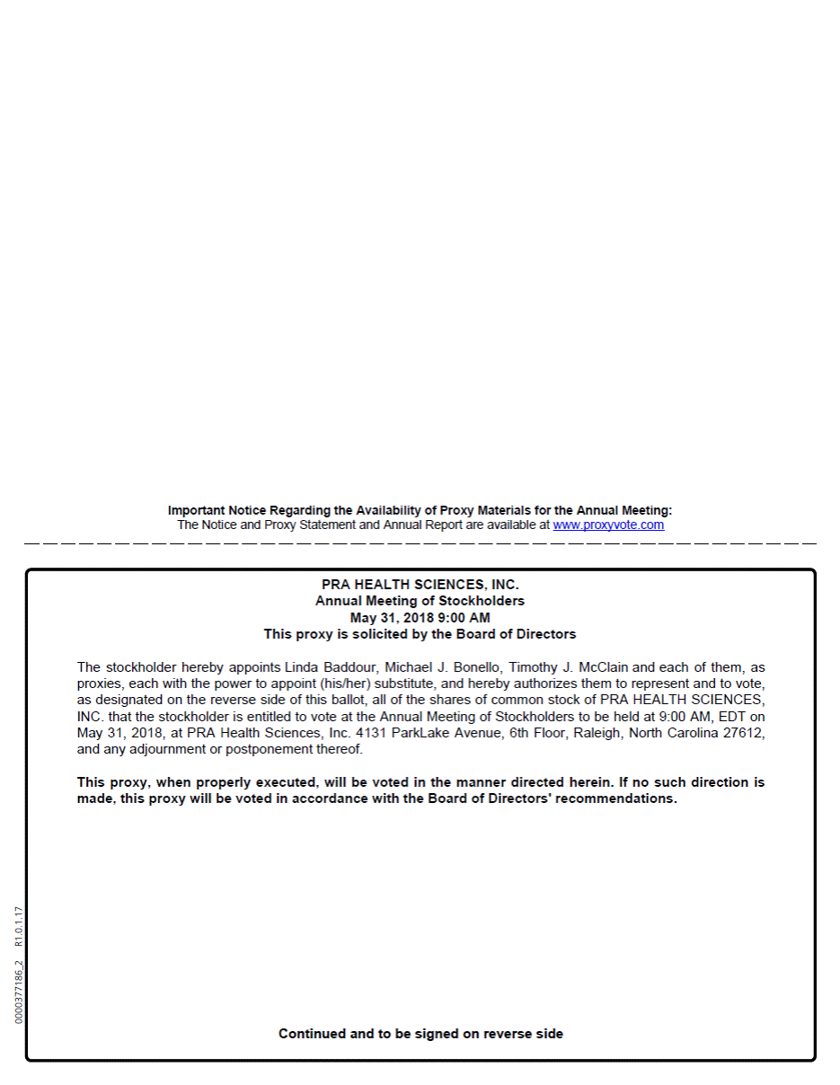 Important Notice Regarding the Availability of Proxy Materials for the Annual Meeting: The Notice and Proxy Statement and Annual Report are available at www.proxyvote.com PRA HEALTH SCIENCES, INC. Annual Meeting of Stockholders May 31, 2018 9:00 AM This proxy is solicited by the Board of Directors The stockholder hereby appoints Linda Baddour, Michael J. Bonello, Timothy J. McClain and each of them, as proxies, each with the power to appoint (his/her) substitute, and hereby authorizes them to represent and to vote, as designated on the reverse side of this ballot, all of the shares of common stock of PRA HEALTH SCIENCES, INC. that the stockholder is entitled to vote at the Annual Meeting of Stockholders to be held at 9:00 AM, EDT on May 31, 2018, at PRA Health Sciences, Inc. 4131 ParkLake Avenue, 6th Floor, Raleigh, North Carolina 27612, and any adjournment or postponement thereof. This proxy, when properly executed, will be voted in the manner directed herein. If no such direction is made, this proxy will be voted in accordance with the Board of Directors' recommendations. Continued and to be signed on reverse side 0000377186_2 R1.0.1.17
