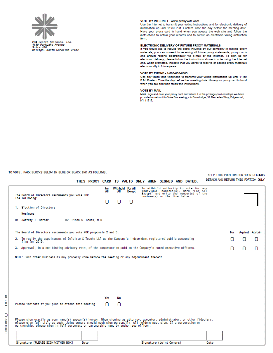 VOTE BY INTERNET - www.proxyvote.com Use the Internet to transmit your voting instructions and for electronic delivery of information up until 11:59 P.M. Eastern Time the day before the meeting date. Have your proxy card in hand when you access the web site and follow the instructions to obtain your records and to create an electronic voting instruction form. PRA Health Sciences, Inc. 4130 ParkLake Avenue ELECTRONIC DELIVERY OF FUTURE PROXY MATERIALS If you would like to reduce the costs incurred by our company in mailing proxy materials, you can consent to receiving all future proxy statements, proxy cards and annual reports electronically via e-mail or the Internet. To sign up for electronic delivery, please follow the instructions above to vote using the Internet and, when prompted, indicate that you agree to receive or access proxy materials electronically in future years. Suite 400 Raleigh, North Carolina 27612 VOTE BY PHONE - 1-800-690-6903 Use any touch-tone telephone to transmit your voting instructions up until 11:59 P.M. Eastern Time the day before the meeting date. Have your proxy card in hand when you call and then follow the instructions. VOTE BY MAIL Mark, sign and date your proxy card and return it in the postage-paid envelope we have provided or return it to Vote Processing, c/o Broadridge, 51 Mercedes Way, Edgewood, NY 11717. TO VOTE, MARK BLOCKS BELOW IN BLUE OR BLACK INK AS FOLLOWS: KEEP THIS PORTION FOR YOUR RECORDS DETACH AND RETURN THIS PORTION ONLY THIS PROXY CARD IS VALID ONLY WHEN SIGNED AND DATED. For Withhold For All Except To withhold authority to vote for any individual nominee(s), mark “For All Except” and write the number(s) of the AllAll The Board of Directors recommends you vote FOR the following: nominee(s) on the line below. 0 0 0 1. Election of Directors Nominees 01 Jeffrey T. Barber 02 Linda S. Grais, M.D. The Board of Directors recommends you vote FOR proposals 2 and 3. 2. To ratify the appointment of Deloitte & Touche LLP as the Company's independent registered public accounting firm for 2019. 3. Approval, in a non-binding advisory vote, of the compensation paid to the Company's named executive officers. For 0 0 Against 0 0 Abstain 0 0 NOTE: Such other business as may properly come before the meeting or any adjournment thereof. Yes 0 No 0 Please indicate if you plan to attend this meeting Please sign exactly as your name(s) appear(s) hereon. When signing as attorney, executor, administrator, or other fiduciary, please give full title as such. Joint owners should each sign personally. All holders must sign. If a corporation or partnership, please sign in full corporate or partnership name by authorized officer. Signature [PLEASE SIGN WITHIN BOX] Date Signature (Joint Owners) Date 0000410861_1 R1.0.1.18