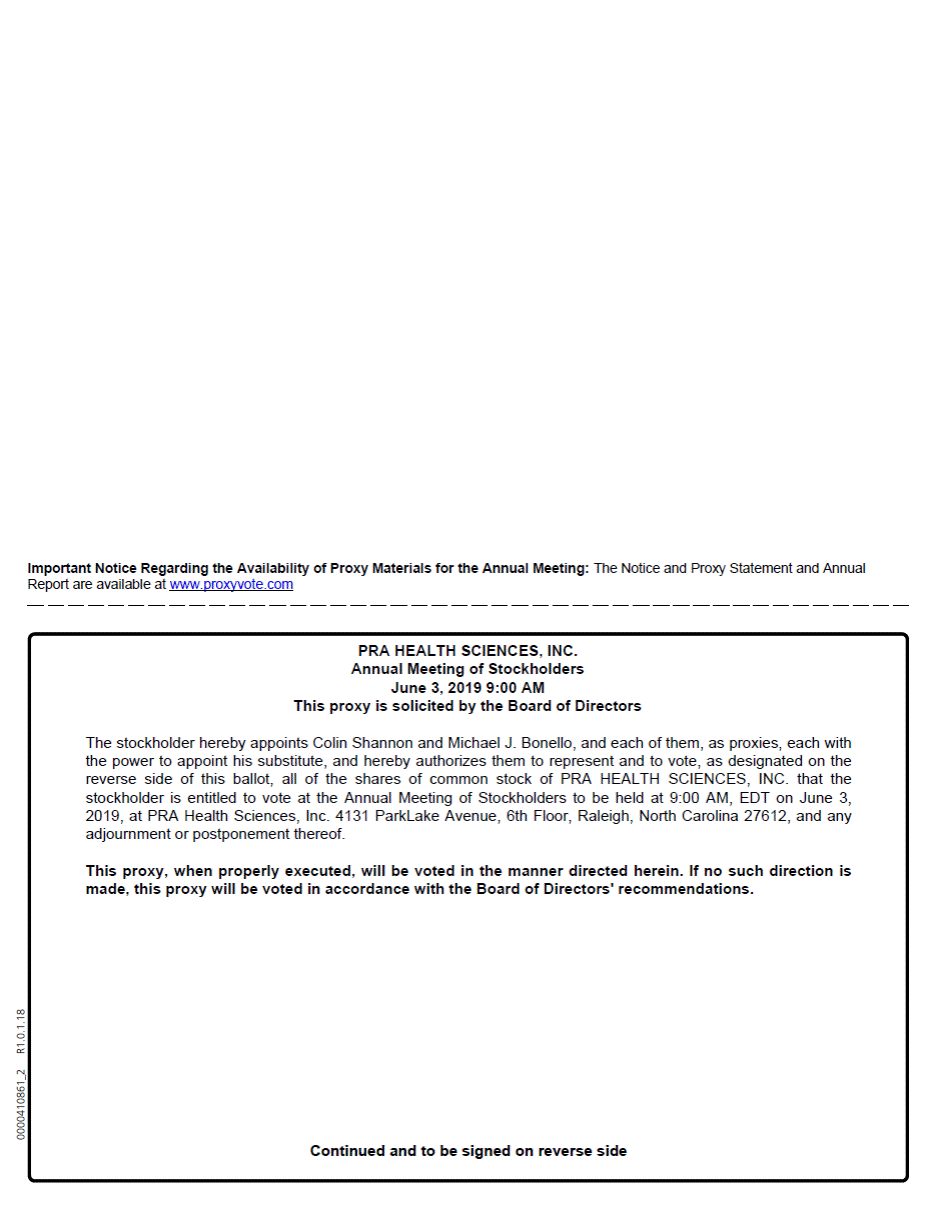 Important Notice Regarding the Availability of Proxy Materials for the Annual Meeting: The Notice and Proxy Statement and Annual Report are available at www.proxyvote.com PRA HEALTH SCIENCES, INC. Annual Meeting of Stockholders June 3, 2019 9:00 AM This proxy is solicited by the Board of Directors The stockholder hereby appoints Colin Shannon and Michael J. Bonello, and each of them, as proxies, each with the power to appoint his substitute, and hereby authorizes them to represent and to vote, as designated on the reverse side of this ballot, all of the shares of common stock of PRA HEALTH SCIENCES, INC. that the stockholder is entitled to vote at the Annual Meeting of Stockholders to be held at 9:00 AM, EDT on June 3, 2019, at PRA Health Sciences, Inc. 4131 ParkLake Avenue, 6th Floor, Raleigh, North Carolina 27612, and any adjournment or postponement thereof. This proxy, when properly executed, will be voted in the manner directed herein. If no such direction is made, this proxy will be voted in accordance with the Board of Directors' recommendations. Continued and to be signed on reverse side 0000410861_2 R1.0.1.18