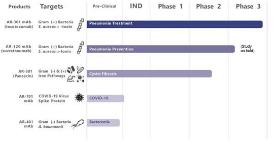 We are a late-stage biopharmaceutical company focused on the discovery and development of targeted immunotherapy using fully human monoclonal antibodies, or mAbs, to treat life-threatening infections. mAbs represent a fundamentally new treatment approach in the infectious disease market and are designed to overcome key issues associated with current therapies, including drug resistance, short duration of response, tolerability, negative impact on the human microbiome, and lack of differentiation between treatment alternatives. Our proprietary product pipeline is comprised of fully human mAbs targeting specific pathogens associated with life-threatening bacterial and viral infections, primarily hospital-acquired pneumonia, or HAP, ventilator-associated pneumonia, or VAP and cystic fibrosis. Our clinical stage product candidates have exhibited promising preclinical data and clinical data. Our lead product candidates, AR-301 and AR-320, target the alpha toxin produced by gram-positive bacteria Staphylococcus aureus, or S. aureus, a common pathogen associated with HAP and VAP. AR-501 is a broad spectrum small molecule anti-infective we are developing in addition to our targeted mAb product candidates.