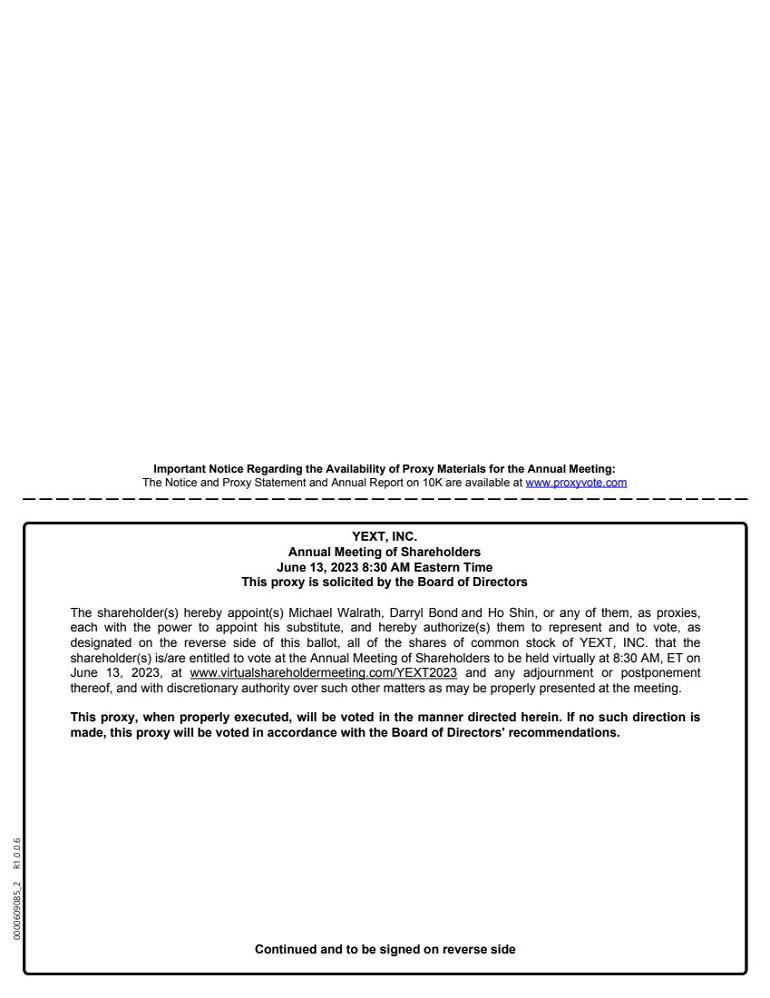 THIS PROXY CARD IS VALID ONLY WHEN SIGNED AND DATED. KEEP THIS PORTION FOR YOUR RECORDS DETACH AND RETURN THIS PORTION ONLY TO VOTE, MARK BLOCKS BELOW IN BLUE OR BLACK INK AS FOLLOWS: Signature [PLEASE SIGN WITHIN BOX] Date Signature (Joint Owners) Date SCAN TO VIEW MATERIALS & VOTE To withhold authority to vote for any individual nominee(s), mark For All Except and write the number(s) of the nominee(s) on the line below. 0 0 0 0 0 0 0 0 0 0000609085_1 R1.0.0.6 For Withhold For All All All Except The Board of Directors recommends you vote FOR the following: 1. Election of Class III Directors Nominees 01) Andrew Sheehan 02) Jesse Lipson 03) Tamar Yehoshua YEXT, INC. C/O BROADRIDGE CORPORATE ISSUER SOLUTIONS, INC. P.O. BOX 1342 BRENTWOOD, NY 11717 VOTE BY INTERNET - www.proxyvote.com or scan the QR Barcode above Use the Internet to transmit your voting instructions and for electronic delivery of information. Vote by 11:59 P.M. ET on 06/12/2023. Have your proxy card in hand when you access the web site and follow the instructions to obtain your records and to create an electronic voting instruction form. During The Meeting - Go to www.virtualshareholdermeeting.com/YEXT2023 You may attend the meeting via the Internet and vote during the meeting. Have the control number that is printed in the box marked by the arrow available and follow the instructions. VOTE BY PHONE - 1-800-690-6903 Use any touch-tone telephone to transmit your voting instructions. Vote by 11:59 P.M. ET on 06/12/2023. Have your proxy card in hand when you call and then follow the instructions. VOTE BY MAIL Mark, sign and date your proxy card and return it in the postage-paid envelope we have provided or return it to Vote Processing, c/o Broadridge, 51 Mercedes Way, Edgewood, NY 11717. The Board of Directors recommends you vote FOR proposals 2 and 3. For Against Abstain 2. Ratify the appointment of Ernst & Young LLP as Yext, Inc.'s independent registered public accounting firm for the fiscal year ending January 31, 2024. 3. Approve, on an advisory basis, the compensation of Yext, Inc.'s named executive officers. NOTE: Such other business as may properly come before the meeting or any adjournment thereof. Please sign exactly as your name(s) appear(s) hereon. When signing as attorney, executor, administrator, or other fiduciary, please give full title as such. Joint owners should each sign personally. All holders must sign. If a corporation or partnership, please sign in full corporate or partnership name by authorized officer.