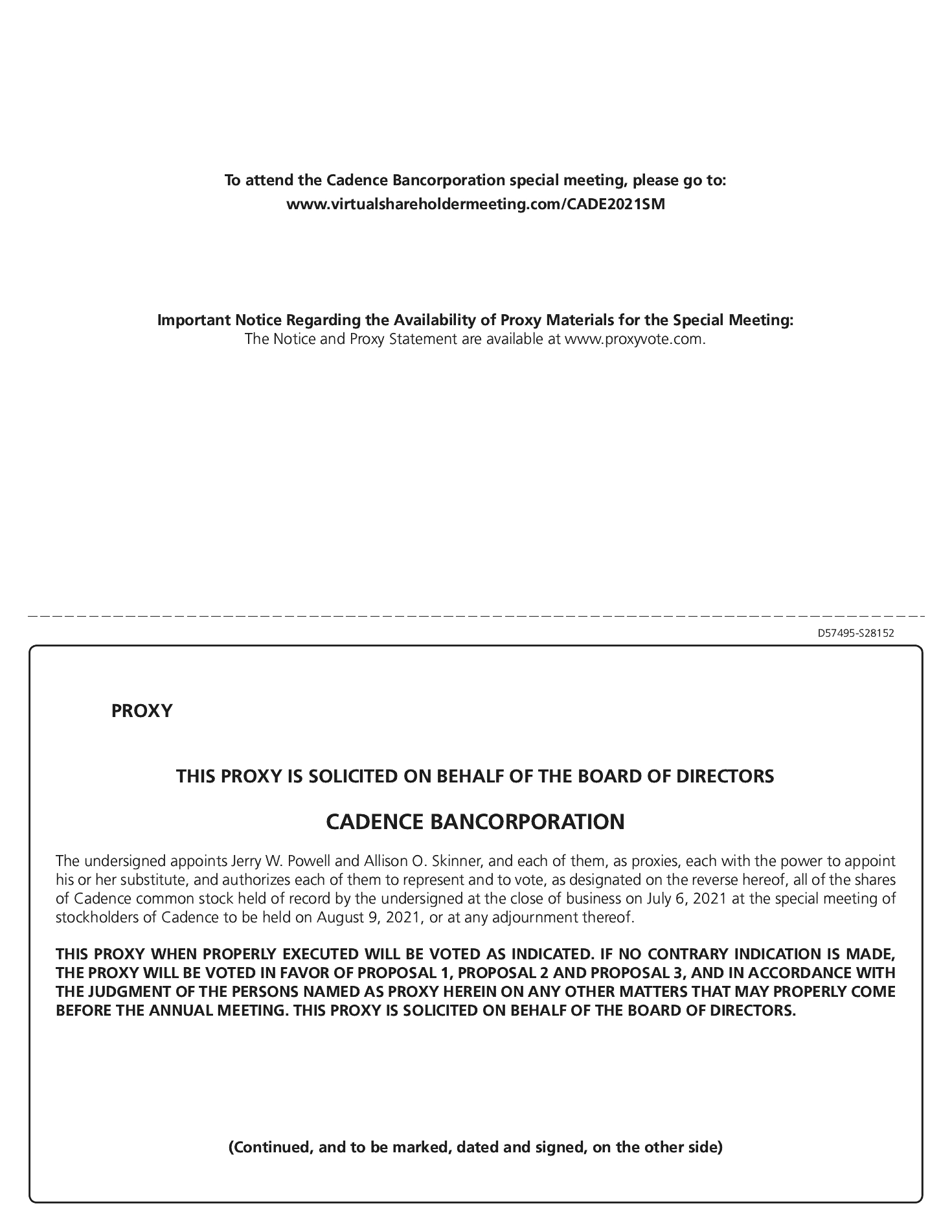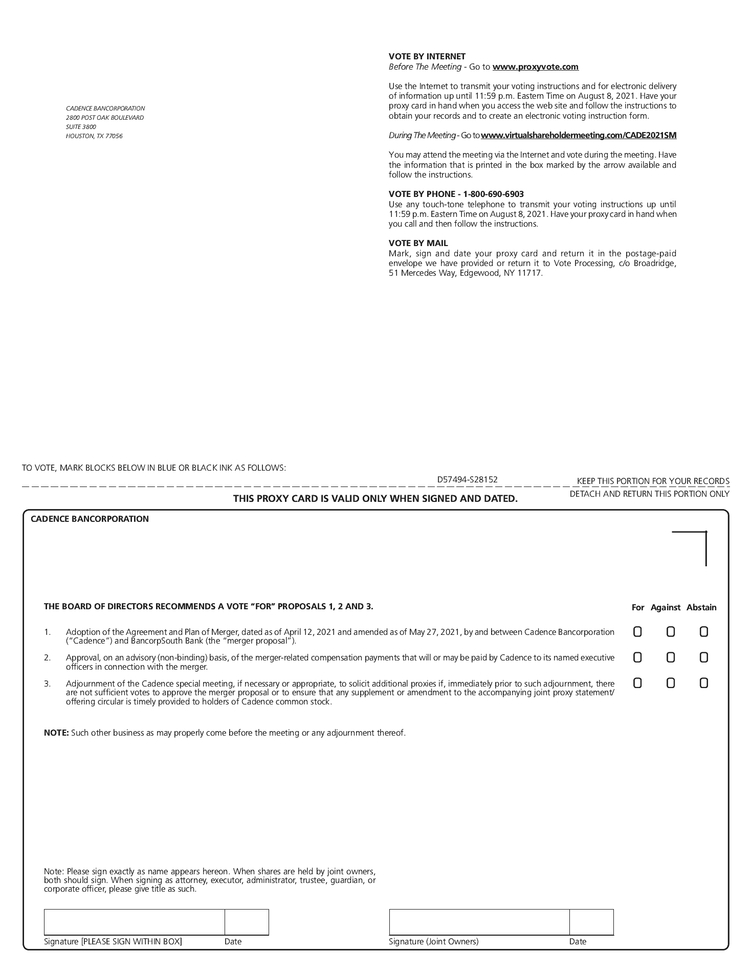 On March 9, 2021, the Cadence board held a dinner meeting with the BancorpSouth board and certain members of the management teams of Cadence and BancorpSouth in Atlanta, Georgia.