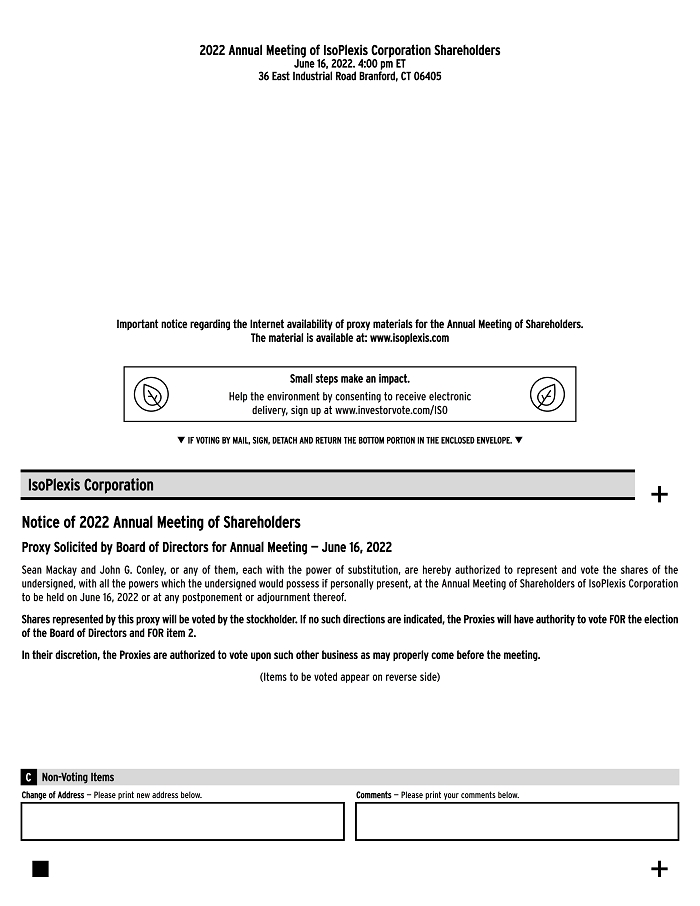 03N0QB 1 U P X + Important notice regarding the Internet availability of proxy materials for the Annual Meeting of Shareholders. The material is available at: www.isoplexis.com q IF VOTING BY MAIL, SIGN, DETACH AND RETURN THE BOTTOM PORTION IN THE ENCLOSED ENVELOPE. q IsoPlexis Corporation Notice of 2022 Annual Meeting of Shareholders Proxy Solicited by Board of Directors for Annual Meeting — June 16, 2022 Sean Mackay and John G. Conley, or any of them, each with the power of substitution, are hereby authorized to represent and vote the shares of the undersigned, with all the powers which the undersigned would possess if personally present, at the Annual Meeting of Shareholders of IsoPlexis Corporation to be held on June 16, 2022 or at any postponement or adjournment thereof. Shares represented by this proxy will be voted by the stockholder. If no such directions are indicated, the Proxies will have authority to vote FOR the election of the Board of Directors and FOR item 2. In their discretion, the Proxies are authorized to vote upon such other business as may properly come before the meeting. (Items to be voted appear on reverse side)