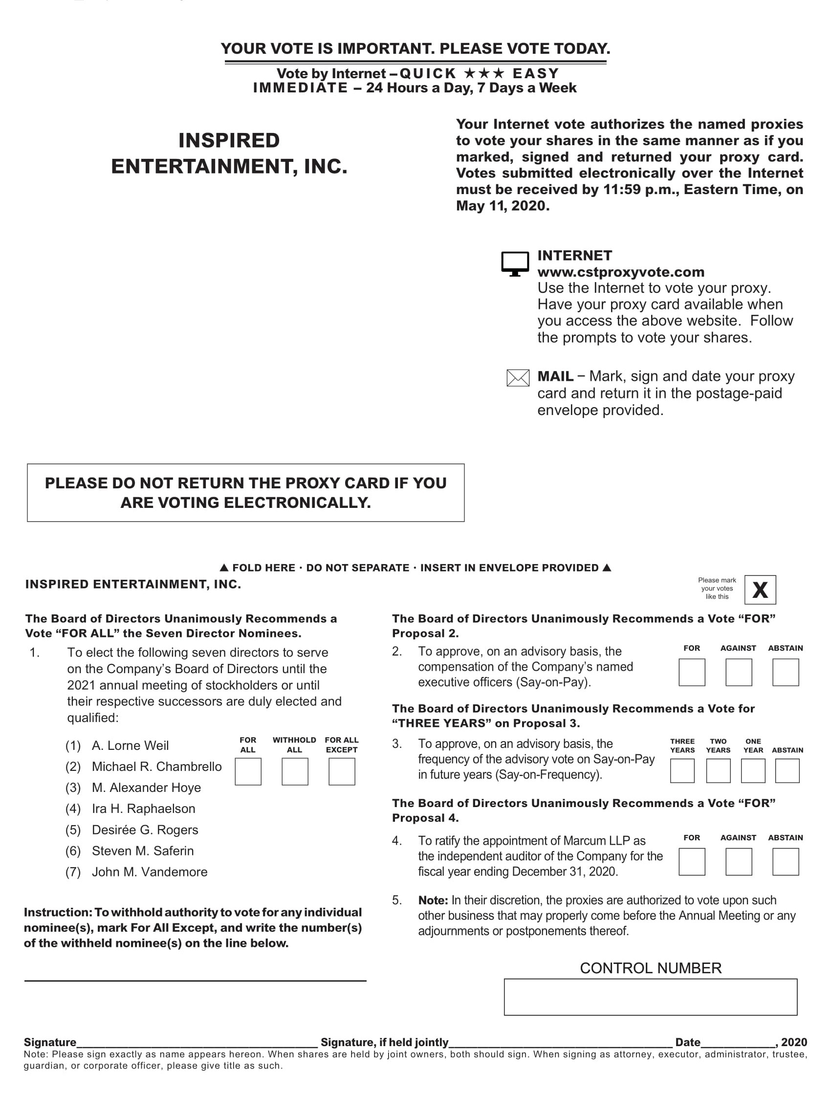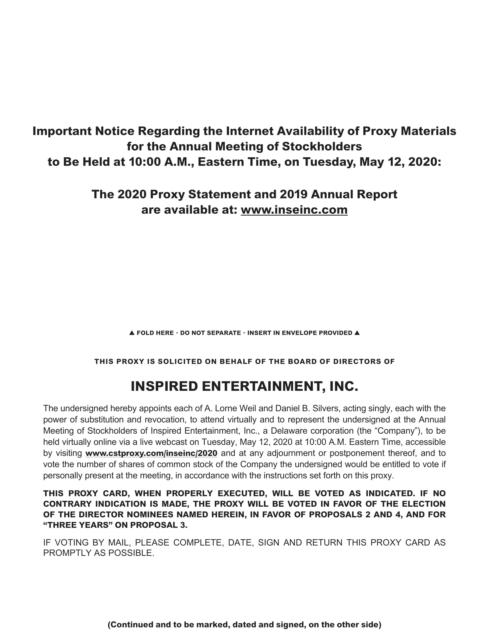 You are hereby given notice of the 2020 Annual Meeting of Stockholders (the “Annual Meeting”) of Inspired Entertainment, Inc. (the “Company”), to be held on Tuesday, May 12, 2020, at 10:00 A.M., Eastern Time in virtual format via the internet at www.cstproxy.com/inseinc/2020. To be admitted to the Annual Meeting, you must enter the control number found on your proxy card.