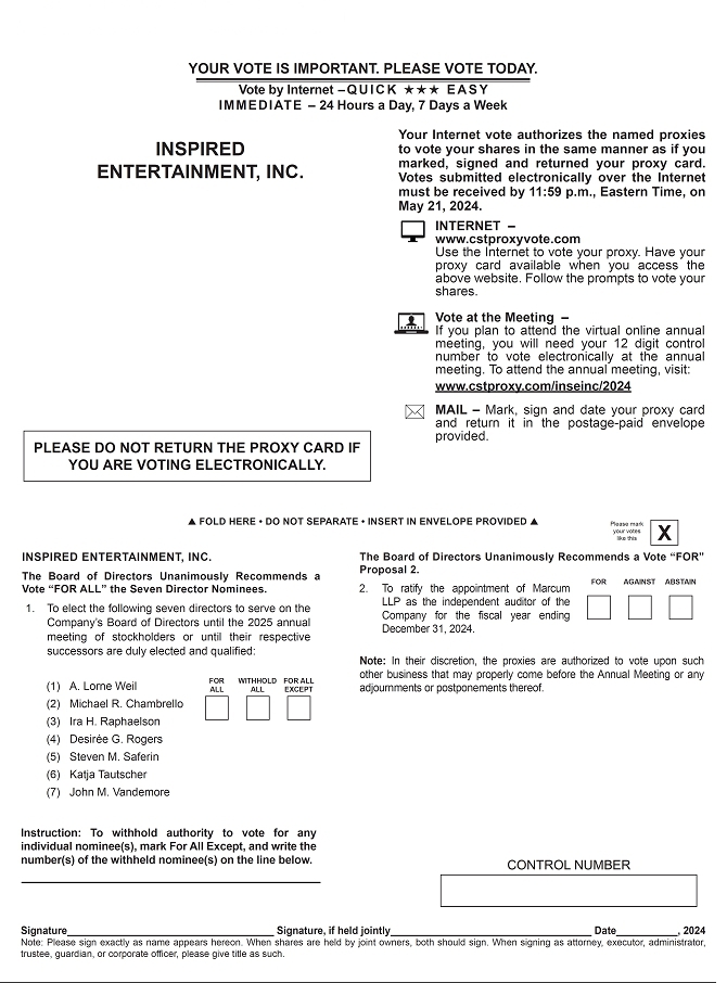You are hereby given notice of the 2024 Annual Meeting of Stockholders (the “Annual Meeting”) of Inspired Entertainment, Inc. (the “Company”), to be held on Wednesday, May 22, 2024, at 9:00 A.M., Eastern Time in virtual format via the internet at www.cstproxy.com/inseinc/2024. Please refer to page 1 of the proxy statement for detailed instructions on how to attend the Annual Meeting.