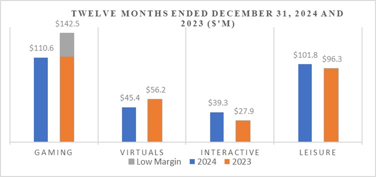 For the year ended December 31, 2024, our Gaming segment generated revenue and Adjusted EBITDA of $110.6 million and $45.3 million, respectively, as compared to the year ended December 31, 2023, during which we generated $142.5 million and $42.8 million in revenue and Adjusted EBITDA, respectively. Revenue in 2024 reduced versus prior year due to significant one-off low margin sales in 2023 of c.$30.6 million. These sales related to approximately 6,400 LBO Vantage terminals which formed part of long-term contract renewals with Betfred and Paddy Power.