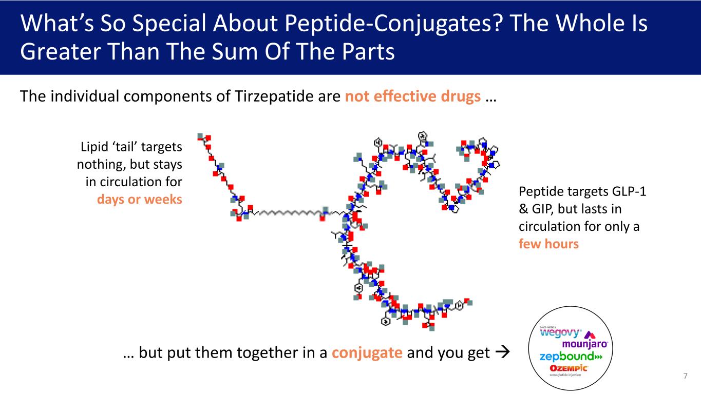 What’s So Special About Peptide-Conjugates? The Whole Is Greater Than The Sum Of The Parts Peptide targets GLP-1 & GIP, but lasts in circulation for only a few hours Lipid ‘tail’ targets nothing, but stays in circulation for days or weeks … but put them together in a conjugate and you get The individual components of Tirzepatide are not effective drugs … 7