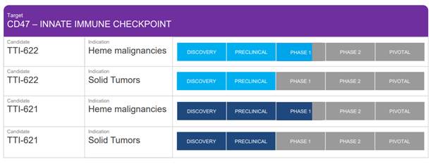 | · | Rapidly advance the clinical development of TTI-622 and TTI-621. We are currently in the process of identifying the maximum tolerated or recommended phase 2 doses for both TTI-621 and TTI-622, and plan to rapidly advance both molecules into phase 1b/2 studies. |