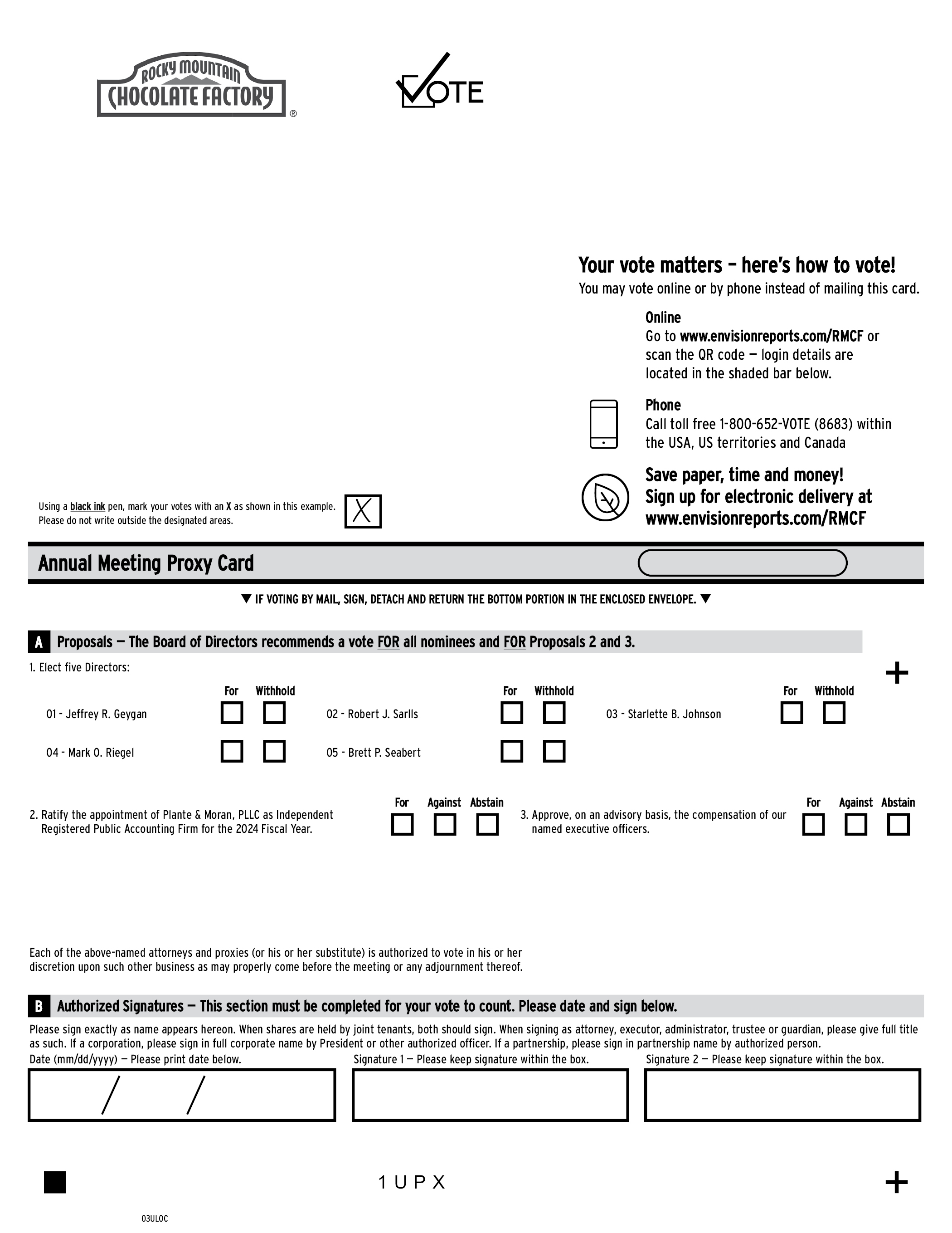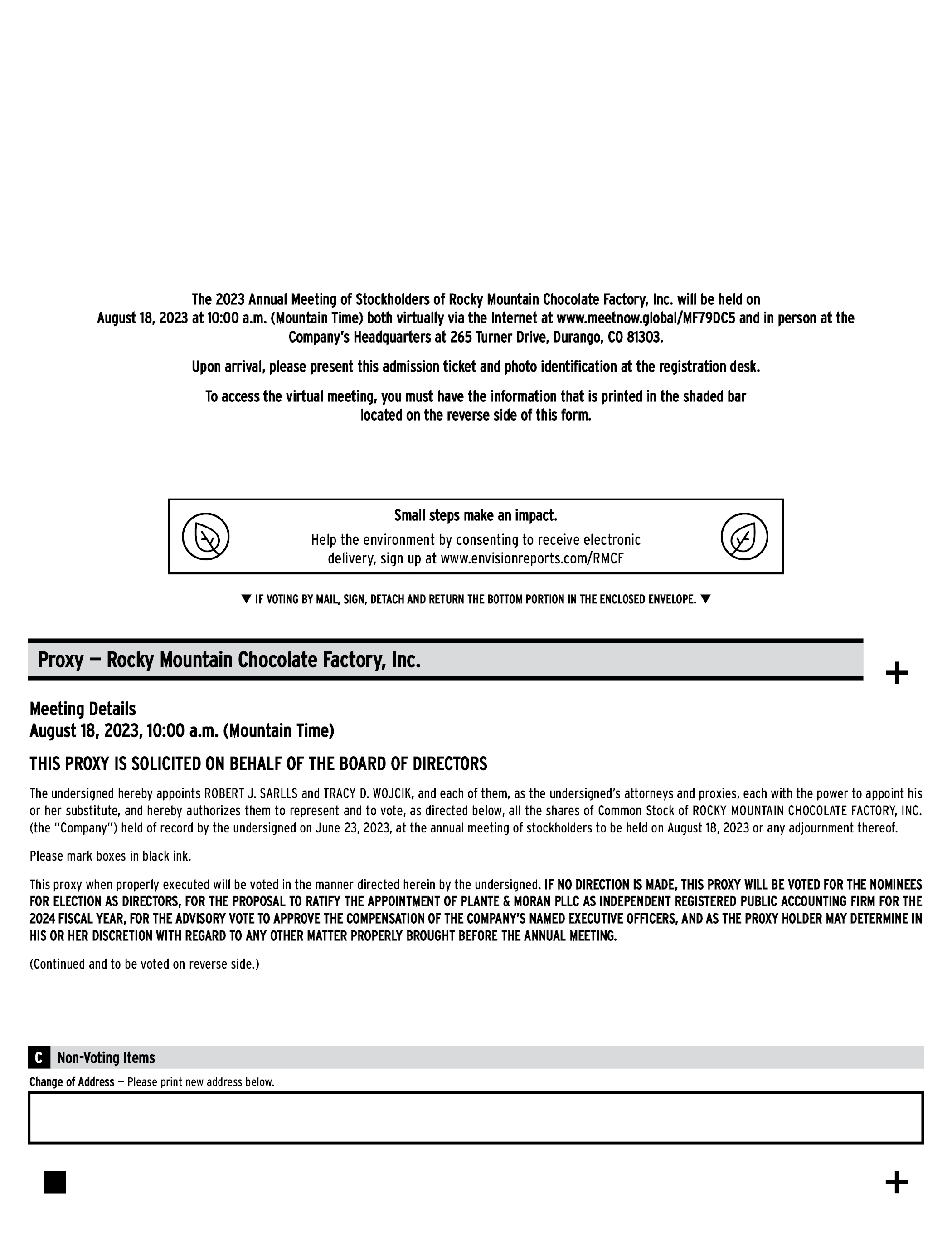 The 2023 Annual Meeting of Stockholders of Rocky Mountain Chocolate Factory, Inc. will be held on August 18, 2023 at 10:00 a.m. (Mountain Time) both virtually via the Internet at www.meetnow.global/MF79DC5 and in person at the Company’s Headquarters at 265 Turner Drive, Durango, CO 81303. Upon arrival, please present this admission ticket and photo identification at the registration desk. To access the virtual meeting, you must have the information that is printed in the shaded bar located on the reverse side of this form. Small steps make an impact. Help the environment by consenting to receive electronic delivery, sign up at www.envisionreports.com/RMCF IF VOTING BY MAIL, SIGN, DETACH AND RETURN THE BOTTOM PORTION IN THE ENCLOSED ENVELOPE. Proxy — Rocky Mountain Chocolate Factory, Inc. Meeting Details August 18, 2023, 10:00 a.m. (Mountain Time) THIS PROXY IS SOLICITED ON BEHALF OF THE BOARD OF DIRECTORS The undersigned hereby appoints ROBERT J. SARLLS and TRACY D. WOJCIK, and each of them, as the undersigned’s attorneys and proxies, each with the power to appoint his or her substitute, and hereby authorizes them to represent and to vote, as directed below, all the shares of Common Stock of ROCKY MOUNTAIN CHOCOLATE FACTORY, INC. (the “Company”) held of record by the undersigned on June 23, 2023, at the annual meeting of stockholders to be held on August 18, 2023 or any adjournment thereof. Please mark boxes in black ink. This proxy when properly executed will be voted in the manner directed herein by the undersigned. IF NO DIRECTION IS MADE, THIS PROXY WILL BE VOTED FOR THE NOMINEES FOR ELECTION AS DIRECTORS, FOR THE PROPOSAL TO RATIFY THE APPOINTMENT OF PLANTE & MORAN PLLC AS INDEPENDENT REGISTERED PUBLIC ACCOUNTING FIRM FOR THE 2024 FISCAL YEAR, FOR THE ADVISORY VOTE TO APPROVE THE COMPENSATION OF THE COMPANY’S NAMED EXECUTIVE OFFICERS, AND AS THE PROXY HOLDER MAY DETERMINE IN HIS OR HER DISCRETION WITH REGARD TO ANY OTHER MATTER PROPERLY BROUGHT BEFORE THE ANNUAL MEETING. (Continued and to be voted on reverse side.) C Non-Voting Items Change of Address — Please print new address below.