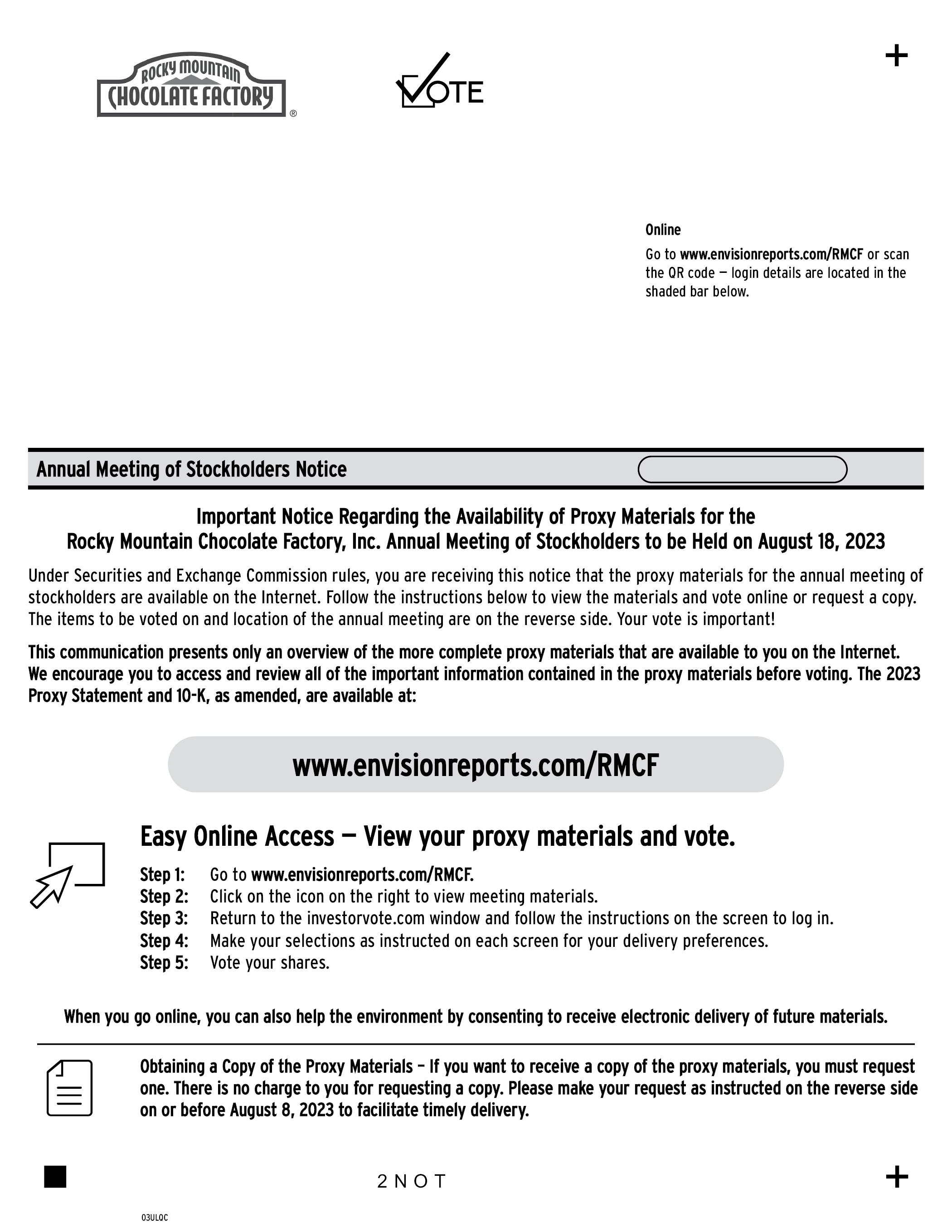 ROCKY MOUNTAIN CHOCOLATE FACTORY VOTE Online Go to www.envisionreports.com/RMCF or scan the QR code — login details are located in the shaded bar below. Annual Meeting of Stockholders Notice Important Notice Regarding the Availability of Proxy Materials for the Rocky Mountain Chocolate Factory, Inc. Annual Meeting of Stockholders to be Held on August 18, 2023 Under Securities and Exchange Commission rules, you are receiving this notice that the proxy materials for the annual meeting of stockholders are available on the Internet. Follow the instructions below to view the materials and vote online or request a copy. The items to be voted on and location of the annual meeting are on the reverse side. Your vote is important! This communication presents only an overview of the more complete proxy materials that are available to you on the Internet. We encourage you to access and review all of the important information contained in the proxy materials before voting. The 2023 Proxy Statement and 10-K, as amended, are available at: www.envisionreports.com/RMCF Easy Online Access — View your proxy materials and vote. Step 1: Go to www.envisionreports.com/RMCF. Step 2: Click on the icon on the right to view meeting materials. Step 3: Return to the investorvote.com window and follow the instructions on the screen to log in. Step 4: Make your selections as instructed on each screen for your delivery preferences. Step 5: Vote your shares. When you go online, you can also help the environment by consenting to receive electronic delivery of future materials. Obtaining a Copy of the Proxy Materials – If you want to receive a copy of the proxy materials, you must request one. There is no charge to you for requesting a copy. Please make your request as instructed on the reverse side on or before August 8, 2023 to facilitate timely delivery. 2 N O T