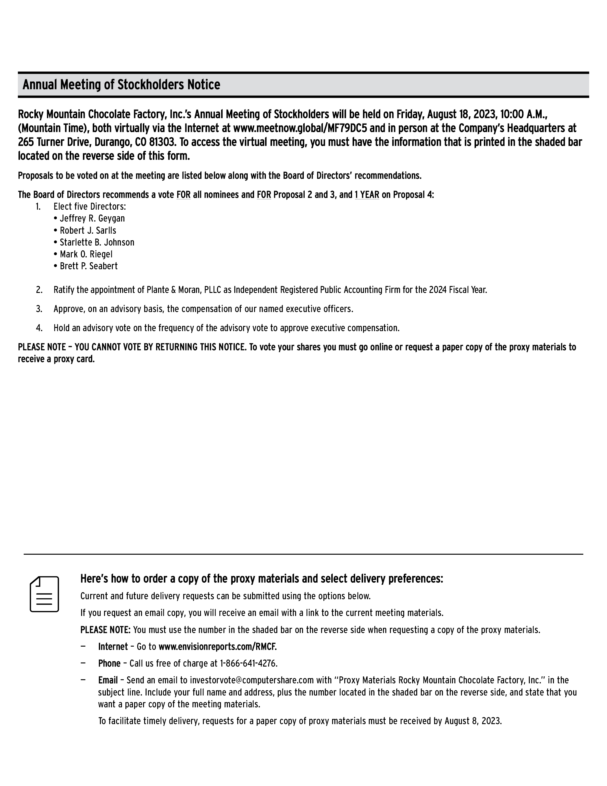 Annual Meeting of Stockholders Notice Rocky Mountain Chocolate Factory, Inc.’s Annual Meeting of Stockholders will be held on Friday, August 18, 2023, 10:00 A.M., (Mountain Time), both virtually via the Internet at www.meetnow.global/MF79DC5 and in person at the Company’s Headquarters at 265 Turner Drive, Durango, CO 81303. To access the virtual meeting, you must have the information that is printed in the shaded bar located on the reverse side of this form. Proposals to be voted on at the meeting are listed below along with the Board of Directors’ recommendations. The Board of Directors recommends a vote FOR all nominees and FOR Proposal 2 and 3, and 1 YEAR on Proposal 4: 1. Elect five Directors: Jeffrey R. Geygan Robert J. Sarlls Starlette B. Johnson Mark O. Riegel Brett P. Seabert 2. Ratify the appointment of Plante & Moran, PLLC as Independent Registered Public Accounting Firm for the 2024 Fiscal Year. 3. Approve, on an advisory basis, the compensation of our named executive officers. 4. Hold an advisory vote on the frequency of the advisory vote to approve executive compensation. PLEASE NOTE – YOU CANNOT VOTE BY RETURNING THIS NOTICE. To vote your shares you must go online or request a paper copy of the proxy materials to receive a proxy card. Here’s how to order a copy of the proxy materials and select delivery preferences: Current and future delivery requests can be submitted using the options below. If you request an email copy, you will receive an email with a link to the current meeting materials. PLEASE NOTE: You must use the number in the shaded bar on the reverse side when requesting a copy of the proxy materials. — Internet – Go to www.envisionreports.com/RMCF. — Phone – Call us free of charge at 1-866-641-4276. — Email – Send an email to investorvote@computershare.com with “Proxy Materials Rocky Mountain Chocolate Factory, Inc.” in the subject line. Include your full name and address, plus the number located in the shaded bar on the reverse side, and state that you want a paper copy of the meeting materials. To facilitate timely delivery, requests for a paper copy of proxy materials must be received by August 8, 2023.