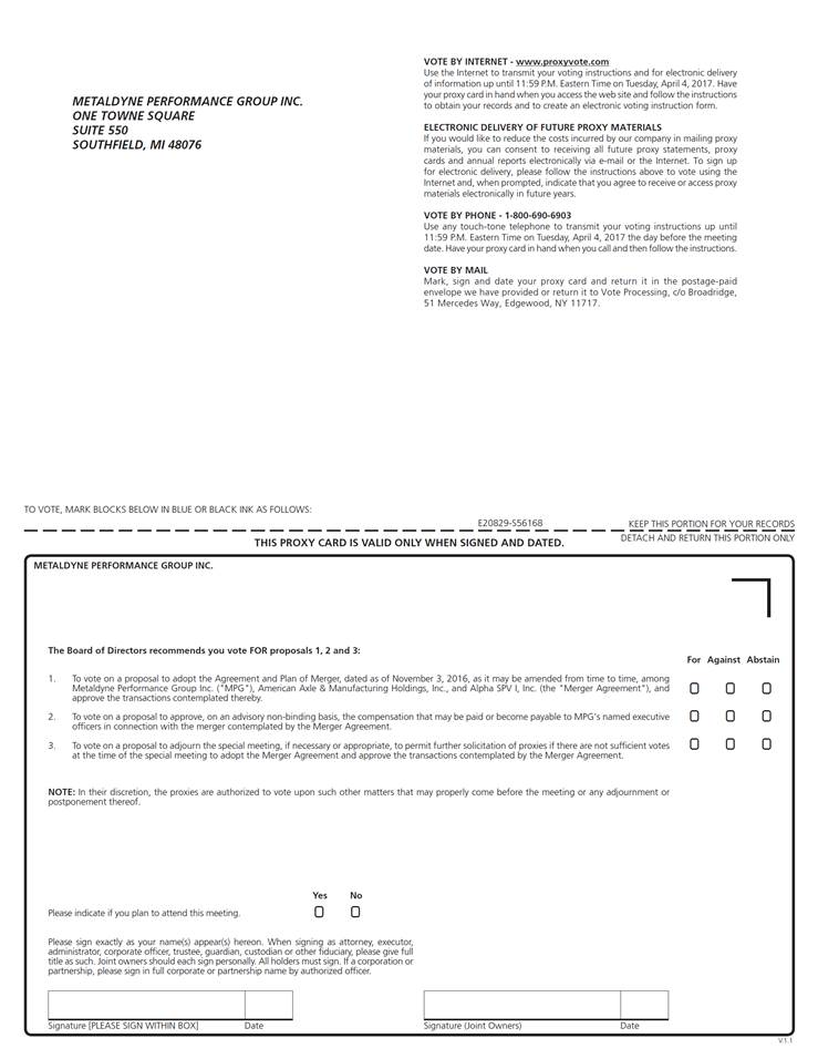 VOTE BY INTERNET - www.proxyvote.com Use the Internet to transmit your voting instructions and for electronic delivery of information up until 11:59 P.M. Eastern Time on Tuesday, April 4, 2017. Have your proxy card in hand when you access the web site and follow the instructions to obtain your records and to create an electronic voting instruction form. METALDYNE PERFORMANCE GROUP INC. ONE TOWNE SQUARE SUITE 550 SOUTHFIELD, MI 48076 ELECTRONIC DELIVERY OF FUTURE PROXY MATERIALS If you would like to reduce the costs incurred by our company in mailing proxy materials, you can consent to receiving all future proxy statements, proxy cards and annual reports electronically via e-mail or the Internet. To sign up for electronic delivery, please follow the instructions above to vote using the Internet and, when prompted, indicate that you agree to receive or access proxy materials electronically in future years. VOTE BY PHONE - 1-800-690-6903 Use any touch-tone telephone to transmit your voting instructions up until 11:59 P.M. Eastern Time on Tuesday, April 4, 2017 the day before the meeting date. Have your proxy card in hand when you call and then follow the instructions. VOTE BY MAIL Mark, sign and date your proxy card and return it in the postage-paid envelope we have provided or return it to Vote Processing, c/o Broadridge, 51 Mercedes Way, Edgewood, NY 11717. TO VOTE, MARK BLOCKS BELOW IN BLUE OR BLACK INK AS FOLLOWS: E20829-S56168 KEEP THIS PORTION FOR YOUR RECORDS DETACH AND RETURN THIS PORTION ONLY THIS PROXY CARD IS VALID ONLY WHEN SIGNED AND DATED. METALDYNE PERFORMANCE GROUP INC. The Board of Directors recommends you vote FOR proposals 1, 2 and 3: For Against Abstain 1. To vote on a proposal to adopt the Agreement and Plan of Merger, dated as of November 3, 2016, as it may be amended from time to time, among Metaldyne Performance Group Inc. ("MPG"), American Axle & Manufacturing Holdings, Inc., and Alpha SPV I, Inc. (the "Merger Agreement"), and approve the transactions contemplated thereby. To vote on a proposal to approve, on an advisory non-binding basis, the compensation that may be paid or become payable to MPG's named executive officers in connection with the merger contemplated by the Merger Agreement. ! ! ! ! ! ! ! ! ! 2. 3. To vote on a proposal to adjourn the special meeting, if necessary or appropriate, to permit further solicitation of proxies if there are not sufficient votes at the time of the special meeting to adopt the Merger Agreement and approve the transactions contemplated by the Merger Agreement. NOTE: In their discretion, the proxies are authorized to vote upon such other matters that may properly come before the meeting or any adjournment or postponement thereof. Yes ! No ! Please indicate if you plan to attend this meeting. Please sign exactly as your name(s) appear(s) hereon. When signing as attorney, executor, administrator, corporate officer, trustee, guardian, custodian or other fiduciary, please give full title as such. Joint owners should each sign personally. All holders must sign. If a corporation or partnership, please sign in full corporate or partnership name by authorized officer. Signature [PLEASE SIGN WITHIN BOX] Date Signature (Joint Owners) Date V.1.1