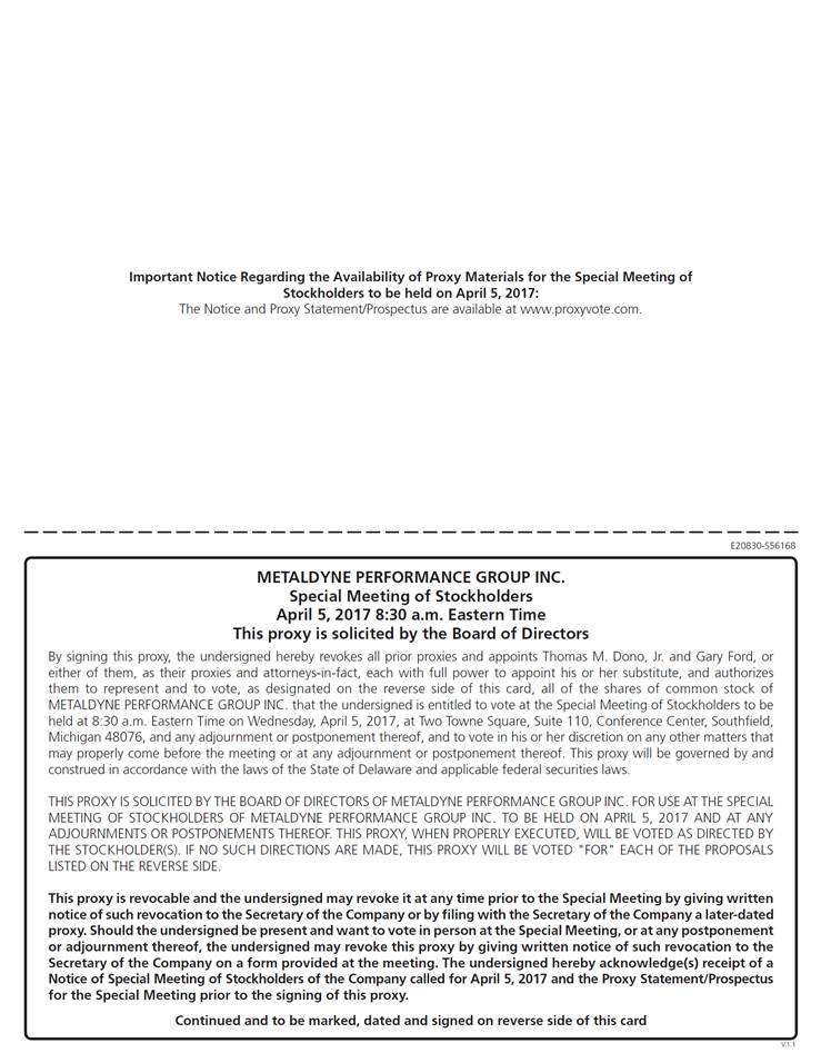 Important Notice Regarding the Availability of Proxy Materials for the Special Meeting of Stockholders to be held on April 5, 2017: The Notice and Proxy Statement/Prospectus are available at www.proxyvote.com. E20830-S56168 METALDYNE PERFORMANCE GROUP INC. Special Meeting of Stockholders April 5, 2017 8:30 a.m. Eastern Time This proxy is solicited by the Board of Directors By signing this proxy, the undersigned hereby revokes all prior proxies and appoints Thomas M. Dono, Jr. and Gary Ford, or either of them, as their proxies and attorneys-in-fact, each with full power to appoint his or her substitute, and authorizes them to represent and to vote, as designated on the reverse side of this card, all of the shares of common stock of METALDYNE PERFORMANCE GROUP INC. that the undersigned is entitled to vote at the Special Meeting of Stockholders to be held at 8:30 a.m. Eastern Time on Wednesday, April 5, 2017, at Two Towne Square, Suite 110, Conference Center, Southfield, Michigan 48076, and any adjournment or postponement thereof, and to vote in his or her discretion on any other matters that may properly come before the meeting or at any adjournment or postponement thereof. This proxy will be governed by and construed in accordance with the laws of the State of Delaware and applicable federal securities laws. THIS PROXY IS SOLICITED BY THE BOARD OF DIRECTORS OF METALDYNE PERFORMANCE GROUP INC. FOR USE AT THE SPECIAL MEETING OF STOCKHOLDERS OF METALDYNE PERFORMANCE GROUP INC. TO BE HELD ON APRIL 5, 2017 AND AT ANY ADJOURNMENTS OR POSTPONEMENTS THEREOF. THIS PROXY, WHEN PROPERLY EXECUTED, WILL BE VOTED AS DIRECTED BY THE STOCKHOLDER(S). IF NO SUCH DIRECTIONS ARE MADE, THIS PROXY WILL BE VOTED "FOR" EACH OF THE PROPOSALS LISTED ON THE REVERSE SIDE. This proxy is revocable and the undersigned may revoke it at any time prior to the Special Meeting by giving written notice of such revocation to the Secretary of the Company or by filing with the Secretary of the Company a later-dated proxy. Should the undersigned be present and want to vote in person at the Special Meeting, or at any postponement or adjournment thereof, the undersigned may revoke this proxy by giving written notice of such revocation to the Secretary of the Company on a form provided at the meeting. The undersigned hereby acknowledge(s) receipt of a Notice of Special Meeting of Stockholders of the Company called for April 5, 2017 and the Proxy Statement/Prospectus for the Special Meeting prior to the signing of this proxy. Continued and to be marked, dated and signed on reverse side of this card V.1.1