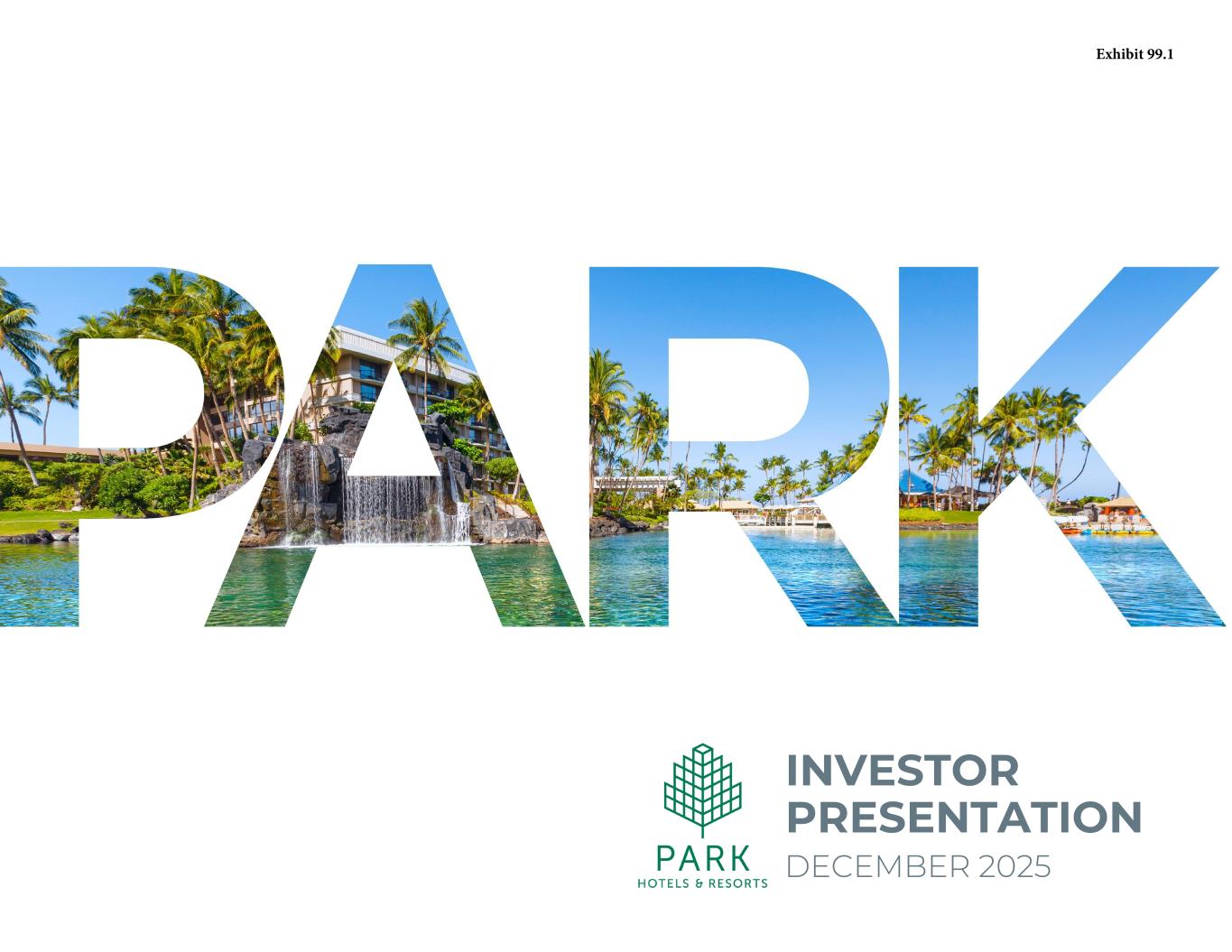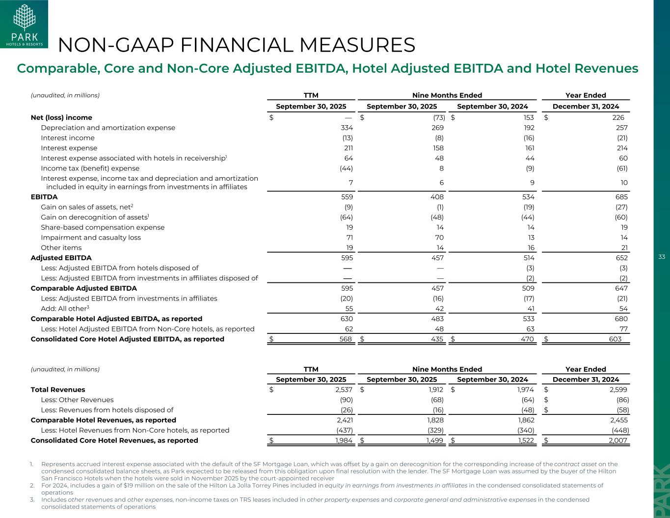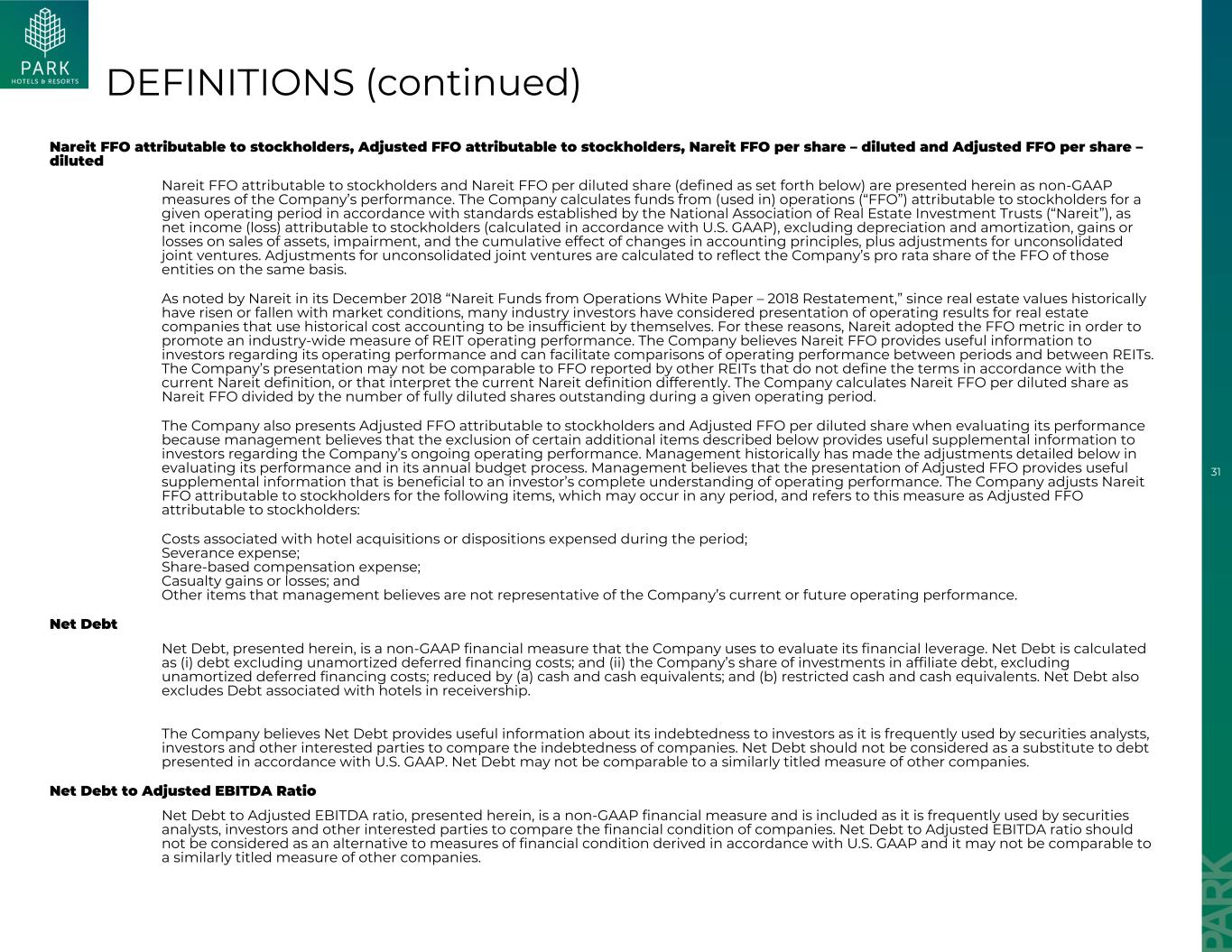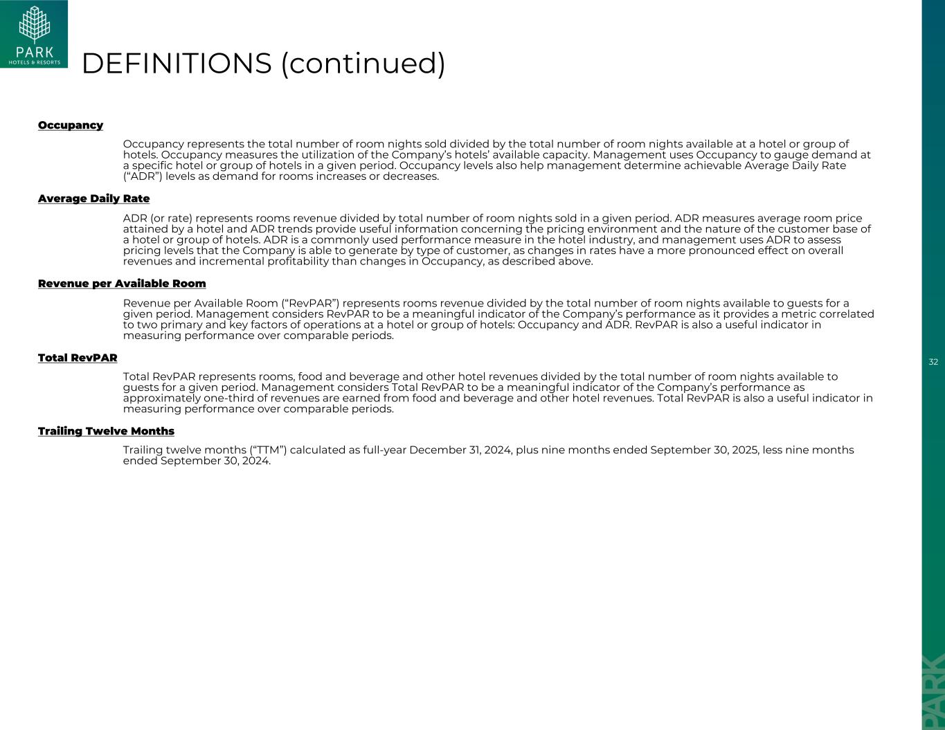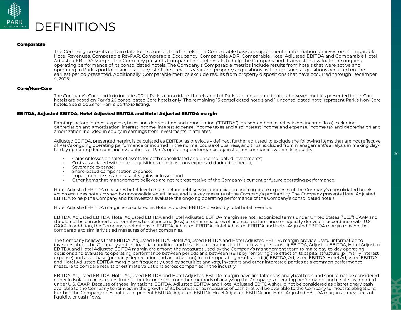 30 Comparable The Company presents certain data for its consolidated hotels on a Comparable basis as supplemental information for investors: Comparable Hotel Revenues, Comparable RevPAR, Comparable Occupancy, Comparable ADR, Comparable Hotel Adjusted EBITDA and Comparable Hotel Adjusted EBITDA Margin. The Company presents Comparable hotel results to help the Company and its investors evaluate the ongoing operating performance of its consolidated hotels. The Company’s Comparable metrics include results from hotels that were active and operating in Park’s portfolio since January 1st of the previous year and property acquisitions as though such acquisitions occurred on the earliest period presented. Additionally, Comparable metrics exclude results from property dispositions that have occurred through December 4, 2025. Core/Non-Core The Company’s Core portfolio includes 20 of Park’s consolidated hotels and 1 of Park’s unconsolidated hotels; however, metrics presented for its Core hotels are based on Park’s 20 consolidated Core hotels only. The remaining 15 consolidated hotels and 1 unconsolidated hotel represent Park’s Non-Core hotels. See slide 29 for Park’s portfolio listing. EBITDA, Adjusted EBITDA, Hotel Adjusted EBITDA and Hotel Adjusted EBITDA margin Earnings before interest expense, taxes and depreciation and amortization (“EBITDA”), presented herein, reflects net income (loss) excluding depreciation and amortization, interest income, interest expense, income taxes and also interest income and expense, income tax and depreciation and amortization included in equity in earnings from investments in affiliates. Adjusted EBITDA, presented herein, is calculated as EBITDA, as previously defined, further adjusted to exclude the following items that are not reflective of Park’s ongoing operating performance or incurred in the normal course of business, and thus, excluded from management’s analysis in making day- to-day operating decisions and evaluations of Park’s operating performance against other companies within its industry: • Gains or losses on sales of assets for both consolidated and unconsolidated investments; • Costs associated with hotel acquisitions or dispositions expensed during the period; • Severance expense; • Share-based compensation expense; • Impairment losses and casualty gains or losses; and • Other items that management believes are not representative of the Company’s current or future operating performance. Hotel Adjusted EBITDA measures hotel-level results before debt service, depreciation and corporate expenses of the Company’s consolidated hotels, which excludes hotels owned by unconsolidated affiliates, and is a key measure of the Company’s profitability. The Company presents Hotel Adjusted EBITDA to help the Company and its investors evaluate the ongoing operating performance of the Company’s consolidated hotels. Hotel Adjusted EBITDA margin is calculated as Hotel Adjusted EBITDA divided by total hotel revenue. EBITDA, Adjusted EBITDA, Hotel Adjusted EBITDA and Hotel Adjusted EBITDA margin are not recognized terms under United States (“U.S.”) GAAP and should not be considered as alternatives to net income (loss) or other measures of financial performance or liquidity derived in accordance with U.S. GAAP. In addition, the Company’s definitions of EBITDA, Adjusted EBITDA, Hotel Adjusted EBITDA and Hotel Adjusted EBITDA margin may not be comparable to similarly titled measures of other companies. The Company believes that EBITDA, Adjusted EBITDA, Hotel Adjusted EBITDA and Hotel Adjusted EBITDA margin provide useful information to investors about the Company and its financial condition and results of operations for the following reasons: (i) EBITDA, Adjusted EBITDA, Hotel Adjusted EBITDA and Hotel Adjusted EBITDA margin are among the measures used by the Company’s management team to make day-to-day operating decisions and evaluate its operating performance between periods and between REITs by removing the effect of its capital structure (primarily interest expense) and asset base (primarily depreciation and amortization) from its operating results; and (ii) EBITDA, Adjusted EBITDA, Hotel Adjusted EBITDA and Hotel Adjusted EBITDA margin are frequently used by securities analysts, investors and other interested parties as a common performance measure to compare results or estimate valuations across companies in the industry. EBITDA, Adjusted EBITDA, Hotel Adjusted EBITDA and Hotel Adjusted EBITDA margin have limitations as analytical tools and should not be considered either in isolation or as a substitute for net income (loss) or other methods of analyzing the Company’s operating performance and results as reported under U.S. GAAP. Because of these limitations, EBITDA, Adjusted EBITDA and Hotel Adjusted EBITDA should not be considered as discretionary cash available to the Company to reinvest in the growth of its business or as measures of cash that will be available to the Company to meet its obligations. Further, the Company does not use or present EBITDA, Adjusted EBITDA, Hotel Adjusted EBITDA and Hotel Adjusted EBITDA margin as measures of liquidity or cash flows. DEFINITIONS