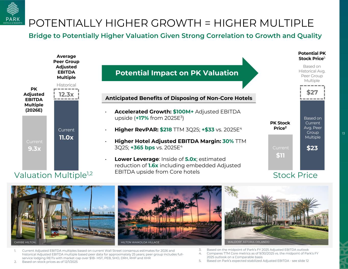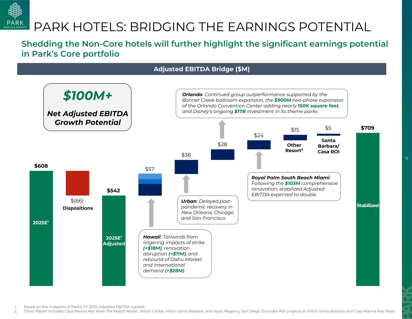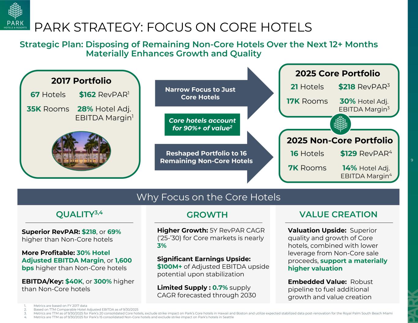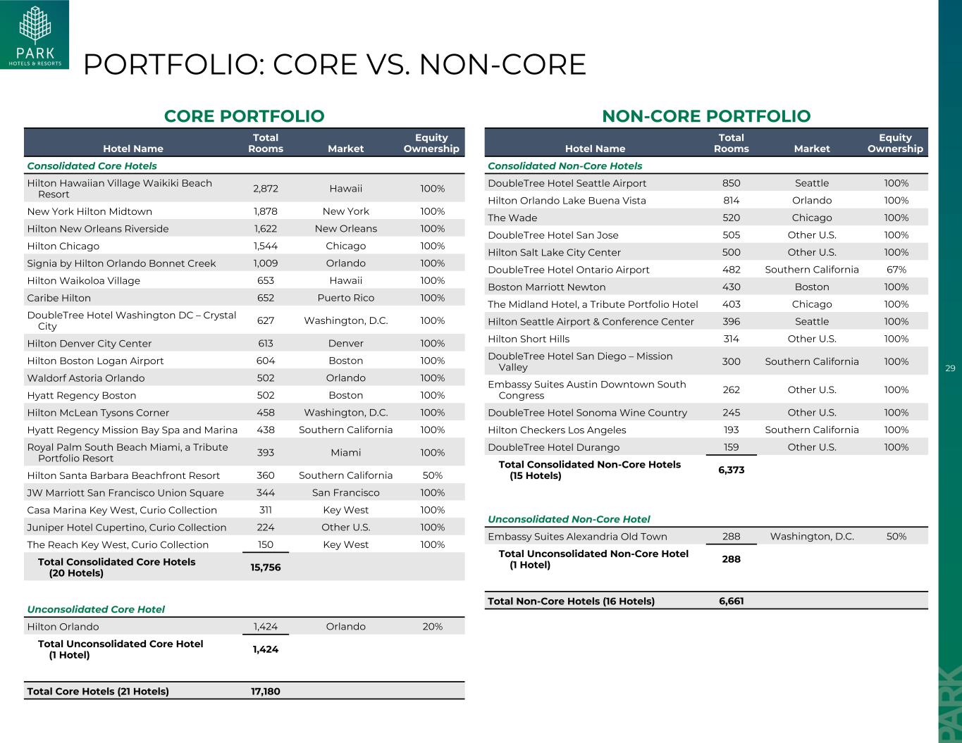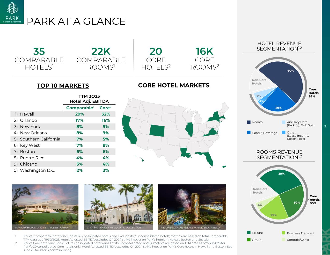 30 Comparable The Company presents certain data for its consolidated hotels on a Comparable basis as supplemental information for investors: Comparable Hotel Revenues, Comparable RevPAR, Comparable Occupancy, Comparable ADR, Comparable Hotel Adjusted EBITDA and Comparable Hotel Adjusted EBITDA Margin. The Company presents Comparable hotel results to help the Company and its investors evaluate the ongoing operating performance of its consolidated hotels. The Company’s Comparable metrics include results from hotels that were active and operating in Park’s portfolio since January 1st of the previous year and property acquisitions as though such acquisitions occurred on the earliest period presented. Additionally, Comparable metrics exclude results from property dispositions that have occurred through December 4, 2025. Core/Non-Core The Company’s Core portfolio includes 20 of Park’s consolidated hotels and 1 of Park’s unconsolidated hotels; however, metrics presented for its Core hotels are based on Park’s 20 consolidated Core hotels only. The remaining 15 consolidated hotels and 1 unconsolidated hotel represent Park’s Non-Core hotels. See slide 29 for Park’s portfolio listing. EBITDA, Adjusted EBITDA, Hotel Adjusted EBITDA and Hotel Adjusted EBITDA margin Earnings before interest expense, taxes and depreciation and amortization (“EBITDA”), presented herein, reflects net income (loss) excluding depreciation and amortization, interest income, interest expense, income taxes and also interest income and expense, income tax and depreciation and amortization included in equity in earnings from investments in affiliates. Adjusted EBITDA, presented herein, is calculated as EBITDA, as previously defined, further adjusted to exclude the following items that are not reflective of Park’s ongoing operating performance or incurred in the normal course of business, and thus, excluded from management’s analysis in making day- to-day operating decisions and evaluations of Park’s operating performance against other companies within its industry: • Gains or losses on sales of assets for both consolidated and unconsolidated investments; • Costs associated with hotel acquisitions or dispositions expensed during the period; • Severance expense; • Share-based compensation expense; • Impairment losses and casualty gains or losses; and • Other items that management believes are not representative of the Company’s current or future operating performance. Hotel Adjusted EBITDA measures hotel-level results before debt service, depreciation and corporate expenses of the Company’s consolidated hotels, which excludes hotels owned by unconsolidated affiliates, and is a key measure of the Company’s profitability. The Company presents Hotel Adjusted EBITDA to help the Company and its investors evaluate the ongoing operating performance of the Company’s consolidated hotels. Hotel Adjusted EBITDA margin is calculated as Hotel Adjusted EBITDA divided by total hotel revenue. EBITDA, Adjusted EBITDA, Hotel Adjusted EBITDA and Hotel Adjusted EBITDA margin are not recognized terms under United States (“U.S.”) GAAP and should not be considered as alternatives to net income (loss) or other measures of financial performance or liquidity derived in accordance with U.S. GAAP. In addition, the Company’s definitions of EBITDA, Adjusted EBITDA, Hotel Adjusted EBITDA and Hotel Adjusted EBITDA margin may not be comparable to similarly titled measures of other companies. The Company believes that EBITDA, Adjusted EBITDA, Hotel Adjusted EBITDA and Hotel Adjusted EBITDA margin provide useful information to investors about the Company and its financial condition and results of operations for the following reasons: (i) EBITDA, Adjusted EBITDA, Hotel Adjusted EBITDA and Hotel Adjusted EBITDA margin are among the measures used by the Company’s management team to make day-to-day operating decisions and evaluate its operating performance between periods and between REITs by removing the effect of its capital structure (primarily interest expense) and asset base (primarily depreciation and amortization) from its operating results; and (ii) EBITDA, Adjusted EBITDA, Hotel Adjusted EBITDA and Hotel Adjusted EBITDA margin are frequently used by securities analysts, investors and other interested parties as a common performance measure to compare results or estimate valuations across companies in the industry. EBITDA, Adjusted EBITDA, Hotel Adjusted EBITDA and Hotel Adjusted EBITDA margin have limitations as analytical tools and should not be considered either in isolation or as a substitute for net income (loss) or other methods of analyzing the Company’s operating performance and results as reported under U.S. GAAP. Because of these limitations, EBITDA, Adjusted EBITDA and Hotel Adjusted EBITDA should not be considered as discretionary cash available to the Company to reinvest in the growth of its business or as measures of cash that will be available to the Company to meet its obligations. Further, the Company does not use or present EBITDA, Adjusted EBITDA, Hotel Adjusted EBITDA and Hotel Adjusted EBITDA margin as measures of liquidity or cash flows. DEFINITIONS