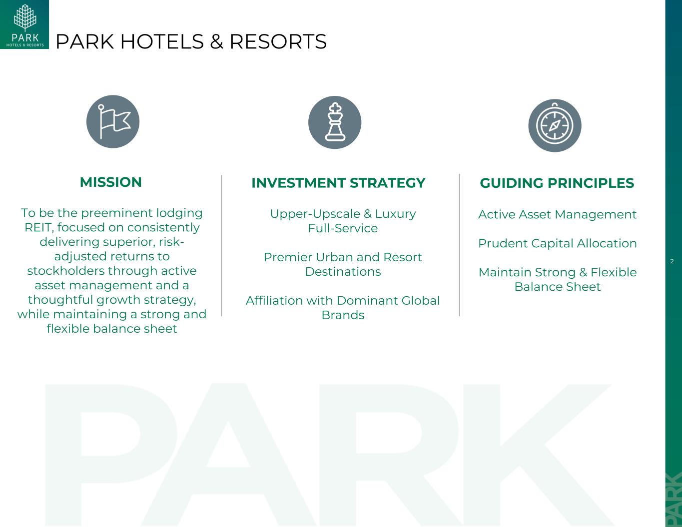 2 PARK HOTELS & RESORTS MISSION INVESTMENT STRATEGY GUIDING PRINCIPLES To be the preeminent lodging REIT, focused on consistently delivering superior, risk- adjusted returns to stockholders through active asset management and a thoughtful growth strategy, while maintaining a strong and flexible balance sheet Upper-Upscale & Luxury Full-Service Premier Urban and Resort Destinations Affiliation with Dominant Global Brands Active Asset Management Prudent Capital Allocation Maintain Strong & Flexible Balance Sheet