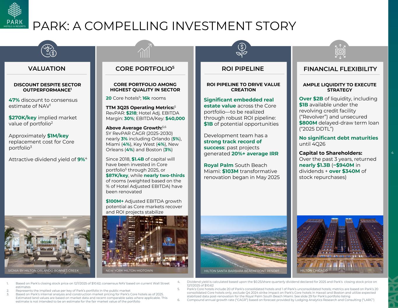 3 TTM 3Q25 Hotel Adj. EBITDA Comparable1 Core2 1) Hawaii 29% 32% 2) Orlando 17% 16% 3) New York 8% 9% 4) New Orleans 8% 9% 5) Southern California 7% 5% 6) Key West 7% 8% 7) Boston 6% 6% 8) Puerto Rico 4% 4% 9) Chicago 3% 4% 10) Washington D.C. 2% 3% Contract/Other Leisure Group Business Transient PARK AT A GLANCE 35 COMPARABLE HOTELS1 22K COMPARABLE ROOMS1 ROOMS REVENUE SEGMENTATION1,2 HOTEL REVENUE SEGMENTATION1,2 TOP 10 MARKETS Rooms Food & Beverage Ancillary Hotel (Parking, Golf, Spa) Other (Lease Income, Resort Fees) 60% 29% 4% 7% Non-Core Hotels 39% 30% 25% 6% Non-Core Hotels 1. Park’s Comparable hotels include its 35 consolidated hotels and exclude its 2 unconsolidated hotels; metrics are based on total Comparable TTM data as of 9/30/2025. Hotel Adjusted EBITDA excludes Q4 2024 strike impact on Park’s hotels in Hawaii, Boston and Seattle 2. Park’s Core hotels include 20 of its consolidated hotels and 1 of its unconsolidated hotels; metrics are based on TTM data as of 9/30/2025 for Park’s 20 consolidated Core hotels only. Hotel Adjusted EBITDA excludes Q4 2024 strike impact on Park’s Core hotels in Hawaii and Boston. See slide 29 for Park’s portfolio listing SIGNIA BY HILTON ORLANDO BONNET CREEK CASA MARINA KEY WEST, CURIO COLLECTION HILTON HAWAIIAN VILLAGE WAIKIKI BEACH RESORT 20 CORE HOTELS2 16K CORE ROOMS2 Core Hotels 82% Core Hotels 80% CORE HOTEL MARKETS