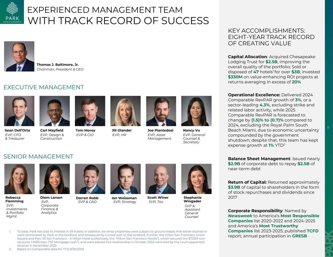 4 PARK: A COMPELLING INVESTMENT STORY VALUATION CORE PORTFOLIO5 FINANCIAL FLEXIBILITYROI PIPELINE CORE PORTFOLIO AMONG HIGHEST QUALITY IN SECTOR ROI PIPELINE TO DRIVE VALUE CREATION DISCOUNT DESPITE SECTOR OUTPERFORMANCE1 AMPLE LIQUIDITY TO EXECUTE STRATEGY 47% discount to consensus estimate of NAV1 $270K/key implied market value of portfolio2 Approximately $1M/key replacement cost for Core portfolio3 Attractive dividend yield of 9%4 Significant embedded real estate value across the Core portfolio—to be realized through robust ROI pipeline: $1B of potential opportunities Development team has a strong track record of success: past projects generated 20%+ average IRR Royal Palm South Beach Miami: $103M transformative renovation began in May 2025 20 Core hotels5; 16k rooms TTM 3Q25 Operating Metrics:5 RevPAR: $218; Hotel Adj. EBITDA Margin: 30%; EBITDA/Key: $40,000 Above Average Growth:5,6 5Y RevPAR CAGR (2025-2030) nearly 3% including Orlando (5%), Miami (4%), Key West (4%), New Orleans (4%) and Boston (3%) Since 2018, $1.4B of capital will have been invested in Core portfolio5 through 2025, or $87K/key, while nearly two-thirds of rooms (weighted based on the % of Hotel Adjusted EBITDA) have been renovated $100M+ Adjusted EBITDA growth potential as Core markets recover and ROI projects stabilize Over $2B of liquidity, including $1B available under the revolving credit facility (“Revolver”) and unsecured $800M delayed-draw term loan (“2025 DDTL”) No significant debt maturities until 4Q26 Capital to Shareholders: Over the past 3 years, returned nearly $1.3B (~$940M in dividends + over $340M of stock repurchases) 4. Dividend yield is calculated based upon the $0.25/share quarterly dividend declared for 2025 and Park’s closing stock price on 12/1/2025 of $10.62 5. Park’s Core hotels include 20 of Park’s consolidated hotels and 1 of Park’s unconsolidated hotels; metrics are based on Park’s 20 consolidated Core hotels only, exclude Q4 2024 strike impact on Park’s Core hotels in Hawaii and Boston and utilize expected stabilized data post-renovation for the Royal Palm South Beach Miami. See slide 29 for Park’s portfolio listing 6. Compound annual growth rate (“CAGR”) based on forecast provided by Lodging Analytics Research and Consulting (“LARC”) 1. Based on Park’s closing stock price on 12/1/2025 of $10.62; consensus NAV based on current Wall Street estimates 2. Represents the implied value per key of Park’s portfolio in the public market 3. Based on Park’s internal analysis and construction market pricing for Park’s Core hotels as of 2025. Estimated land values are based on market data and recent comparable sales where applicable. This estimate is not intended to be an estimate for the fair market value of the portfolio SIGNIA BY HILTON ORLANDO BONNET CREEK NEW YORK HILTON MIDTOWN HILTON SANTA BARBARA BEACHFRONT RESORT HILTON CHICAGO