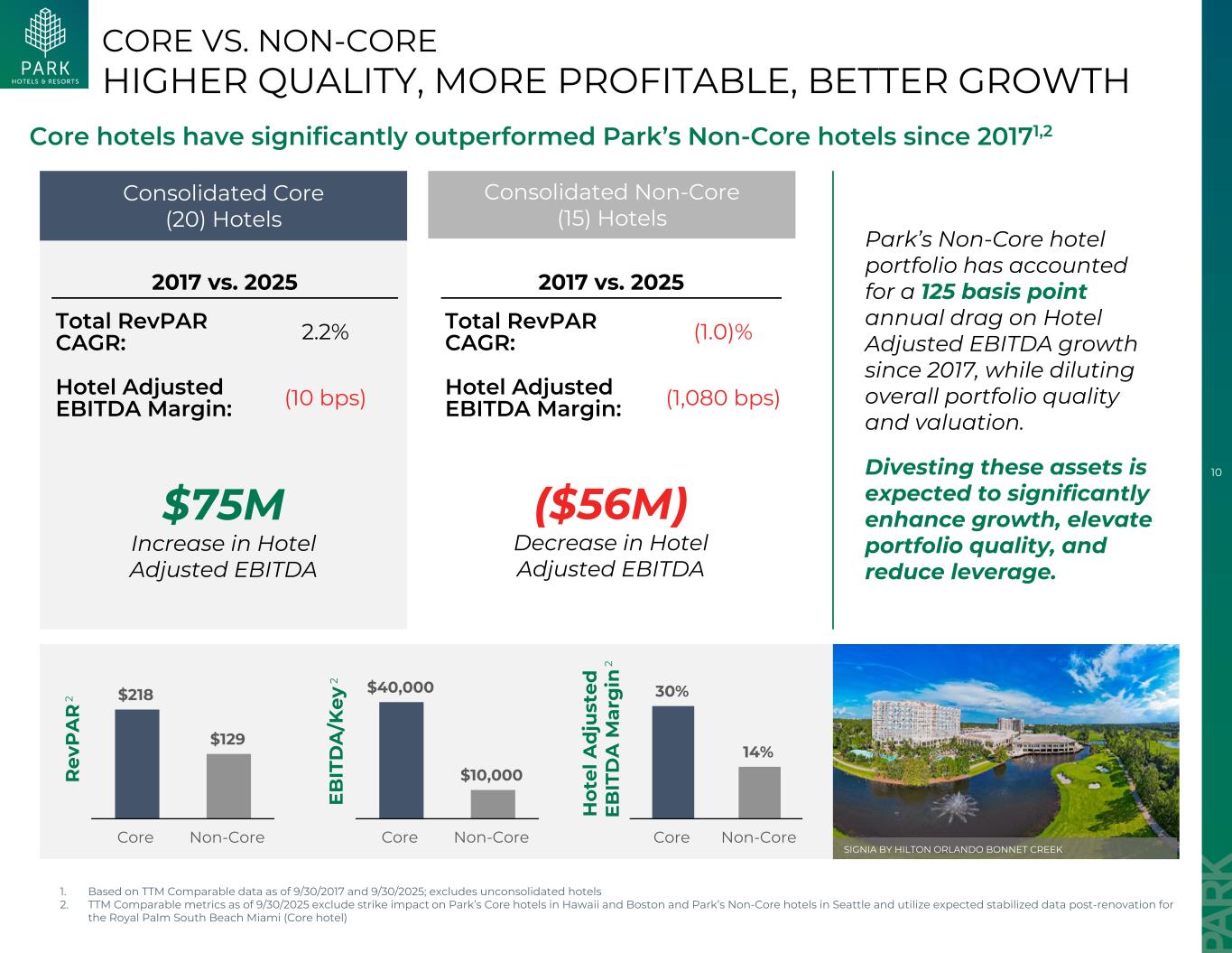 9 PARK STRATEGY: FOCUS ON CORE HOTELS Strategic Plan: Disposing of Remaining Non-Core Hotels Over the Next 12+ Months Materially Enhances Growth and Quality Why Focus on the Core Hotels 2017 Portfolio Narrow Focus to Just Core Hotels 2025 Core Portfolio 2025 Non-Core Portfolio 21 Hotels 17K Rooms 16 Hotels 7K Rooms $129 RevPAR4 14% Hotel Adj. EBITDA Margin4 67 Hotels 35K Rooms $162 RevPAR1 28% Hotel Adj. EBITDA Margin1 Core hotels account for 90%+ of value2 Reshaped Portfolio to 16 Remaining Non-Core Hotels $218 RevPAR3 30% Hotel Adj. EBITDA Margin3 Superior RevPAR: $218, or 69% higher than Non-Core hotels More Profitable: 30% Hotel Adjusted EBITDA Margin, or 1,600 bps higher than Non-Core hotels EBITDA/Key: $40K, or 300% higher than Non-Core hotels Higher Growth: 5Y RevPAR CAGR (‘25-’30) for Core markets is nearly 3% Significant Earnings Upside: $100M+ of Adjusted EBITDA upside potential upon stabilization Limited Supply : 0.7% supply CAGR forecasted through 2030 Valuation Upside: Superior quality and growth of Core hotels, combined with lower leverage from Non-Core sale proceeds, support a materially higher valuation Embedded Value: Robust pipeline to fuel additional growth and value creation QUALITY3,4 GROWTH VALUE CREATION 1. Metrics are based on FY 2017 data 2. Based on TTM Comparable Hotel Adjusted EBITDA as of 9/30/2025 3. Metrics are TTM as of 9/30/2025 for Park’s 20 consolidated Core hotels, exclude strike impact on Park’s Core hotels in Hawaii and Boston and utilize expected stabilized data post-renovation for the Royal Palm South Beach Miami 4. Metrics are TTM as of 9/30/2025 for Park’s 15 consolidated Non-Core hotels and exclude strike impact on Park’s hotels in Seattle