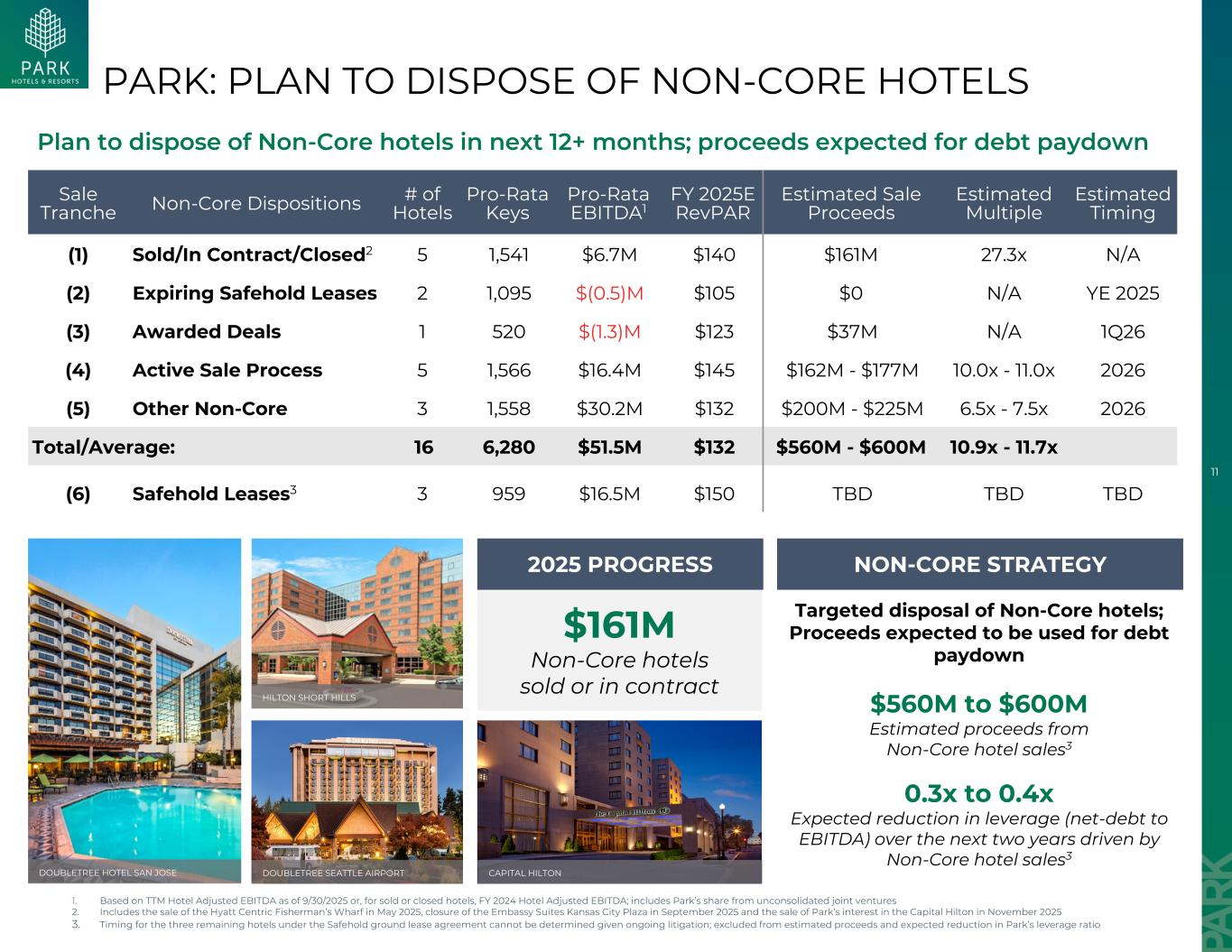 10 1. Based on TTM Comparable data as of 9/30/2017 and 9/30/2025; excludes unconsolidated hotels 2. TTM Comparable metrics as of 9/30/2025 exclude strike impact on Park’s Core hotels in Hawaii and Boston and Park’s Non-Core hotels in Seattle and utilize expected stabilized data post-renovation for the Royal Palm South Beach Miami (Core hotel) CORE VS. NON-CORE HIGHER QUALITY, MORE PROFITABLE, BETTER GROWTH Consolidated Core (20) Hotels Core hotels have significantly outperformed Park’s Non-Core hotels since 20171,2 SIGNIA BY HILTON ORLANDO BONNET CREEK Consolidated Non-Core (15) Hotels ($56M) Decrease in Hotel Adjusted EBITDA $75M Increase in Hotel Adjusted EBITDA Park’s Non-Core hotel portfolio has accounted for a 125 basis point annual drag on Hotel Adjusted EBITDA growth since 2017, while diluting overall portfolio quality and valuation. Divesting these assets is expected to significantly enhance growth, elevate portfolio quality, and reduce leverage. 2017 vs. 2025 Total RevPAR CAGR: 2.2% Hotel Adjusted EBITDA Margin: (10 bps) R ev P A R $218 $129 Core Non-Core E B IT D A /K ey $40,000 $10,000 Core Non-Core H ot el A d ju st ed EB IT D A M ar g in 30% 14% Core Non-Core 2017 vs. 2025 Total RevPAR CAGR: (1.0)% Hotel Adjusted EBITDA Margin: (1,080 bps) 2 2 2