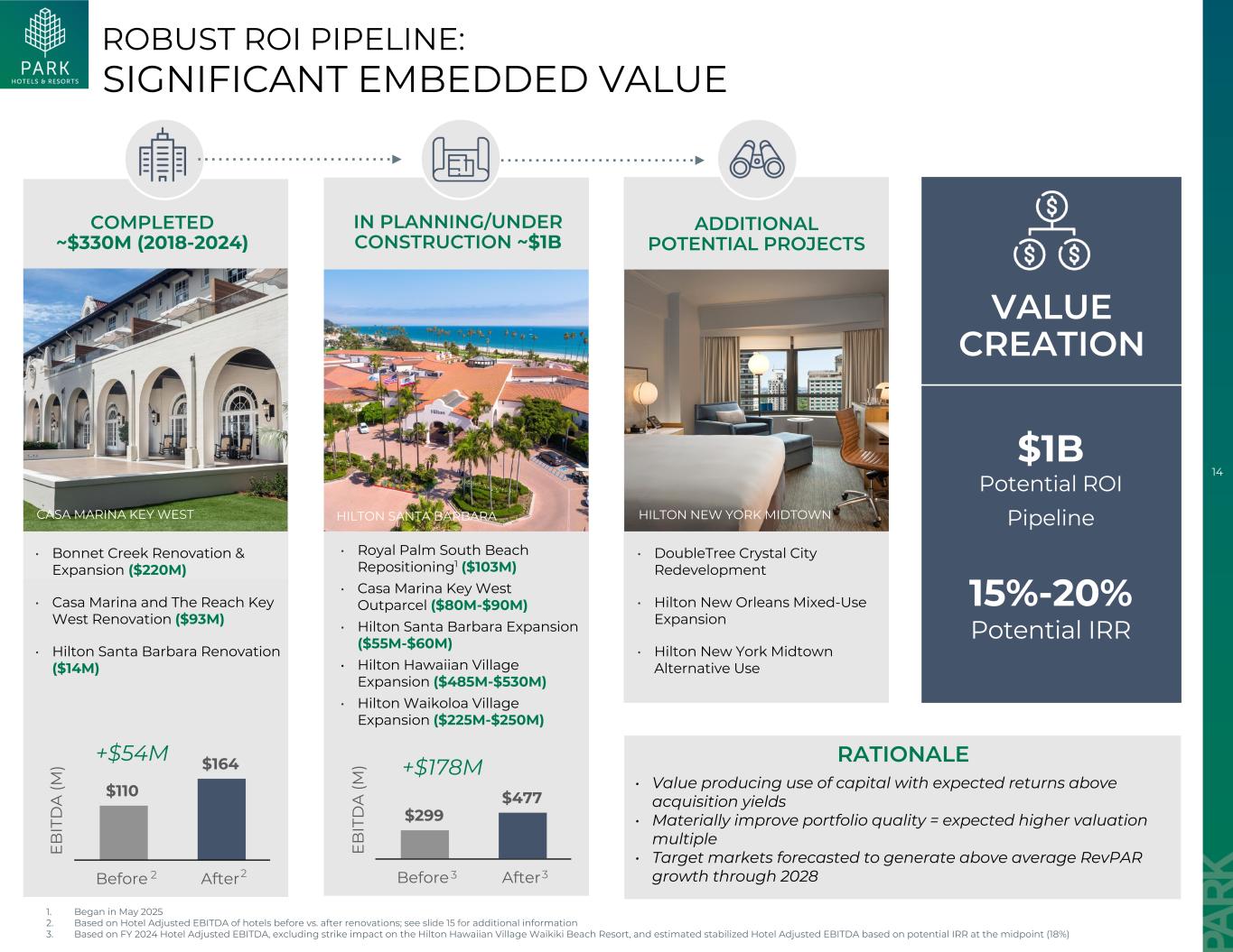 13 POTENTIALLY HIGHER GROWTH = HIGHER MULTIPLE 1. Bridge to Potentially Higher Valuation Given Strong Correlation to Growth and Quality Valuation Multiple1,2 9.3x 11.0x PK Adjusted EBITDA Multiple (2026E) Average Peer Group Adjusted EBITDA Multiple Stock Price $11 $23 PK Stock Price2 Potential PK Stock Price5 • Accelerated Growth: $100M+ Adjusted EBITDA upside (+17% from 2025E3) • Higher RevPAR: $218 TTM 3Q25; +$33 vs. 2025E4 • Higher Hotel Adjusted EBITDA Margin: 30% TTM 3Q25; +365 bps vs. 2025E4 • Lower Leverage: Inside of 5.0x; estimated reduction of 1.6x including embedded Adjusted EBITDA upside from Core hotels Potential Impact on PK Valuation CARIBE HILTON HILTON WAIKOLOA VILLAGE 1. Current Adjusted EBITDA multiples based on current Wall Street consensus estimates for 2026 and historical Adjusted EBITDA multiple based peer data for approximately 25 years; peer group includes full- service lodging REITs with market cap over $1B- HST, PEB, SHO, DRH, RHP and XHR 2. Based on stock prices as of 12/1/2025 Anticipated Benefits of Disposing of Non-Core Hotels WALDORF ASTORIA ORLANDO Current 12.3x Based on Current Avg. Peer Group Multiple Current Current $27 Historical Based on Historical Avg. Peer Group Multiple 3. Based on the midpoint of Park’s FY 2025 Adjusted EBITDA outlook 4. Compares TTM Core metrics as of 9/30/2025 vs. the midpoint of Park’s FY 2025 outlook on a Comparable basis 5. Based on Park’s expected stabilized Adjusted EBITDA - see slide 12