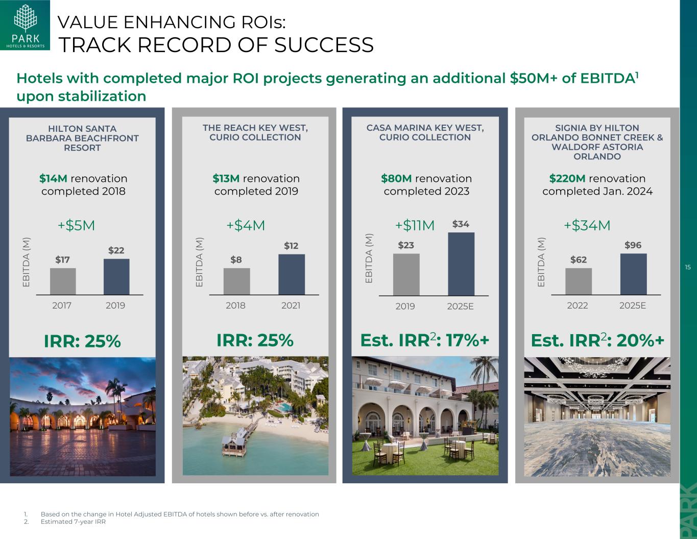 14 COMPLETED ~$330M (2018-2024) IN PLANNING/UNDER CONSTRUCTION ~$1B ADDITIONAL POTENTIAL PROJECTS VALUE CREATION $1B Potential ROI Pipeline 15%-20% Potential IRR SIGNIFICANT EMBEDDED VALUE ROBUST ROI PIPELINE: HILTON NEW YORK MIDTOWN • Bonnet Creek Renovation & Expansion ($220M) • Casa Marina and The Reach Key West Renovation ($93M) • Hilton Santa Barbara Renovation ($14M) • Royal Palm South Beach Repositioning1 ($103M) • Casa Marina Key West Outparcel ($80M-$90M) • Hilton Santa Barbara Expansion ($55M-$60M) • Hilton Hawaiian Village Expansion ($485M-$530M) • Hilton Waikoloa Village Expansion ($225M-$250M) • DoubleTree Crystal City Redevelopment • Hilton New Orleans Mixed-Use Expansion • Hilton New York Midtown Alternative Use HILTON SANTA BARBARACASA MARINA KEY WEST • Value producing use of capital with expected returns above acquisition yields • Materially improve portfolio quality = expected higher valuation multiple • Target markets forecasted to generate above average RevPAR growth through 2028 1. Began in May 2025 2. Based on Hotel Adjusted EBITDA of hotels before vs. after renovations; see slide 15 for additional information 3. Based on FY 2024 Hotel Adjusted EBITDA, excluding strike impact on the Hilton Hawaiian Village Waikiki Beach Resort, and estimated stabilized Hotel Adjusted EBITDA based on potential IRR at the midpoint (18%) RATIONALE E B IT D A (M ) $110 $164 Before After +$54M 22 E B IT D A (M ) $299 $477 Before After +$178M 33