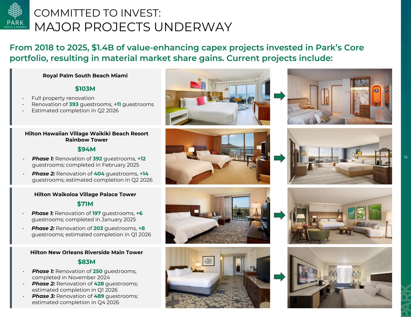 15 HILTON SANTA BARBARA BEACHFRONT RESORT THE REACH KEY WEST, CURIO COLLECTION CASA MARINA KEY WEST, CURIO COLLECTION TRACK RECORD OF SUCCESS VALUE ENHANCING ROIs: Hotels with completed major ROI projects generating an additional $50M+ of EBITDA1 upon stabilization $14M renovation completed 2018 IRR: 25% IRR: 25% Est. IRR2: 17%+ Est. IRR2: 20%+ SIGNIA BY HILTON ORLANDO BONNET CREEK & WALDORF ASTORIA ORLANDO E B IT D A (M ) $17 $22 2017 2019 +$5M $13M renovation completed 2019 E B IT D A (M ) $8 $12 2018 2021 +$4M $80M renovation completed 2023 E B IT D A (M ) $23 $34 2019 2025E +$11M $220M renovation completed Jan. 2024 E B IT D A (M ) $62 $96 2022 2025E +$34M 1. Based on the change in Hotel Adjusted EBITDA of hotels shown before vs. after renovation 2. Estimated 7-year IRR