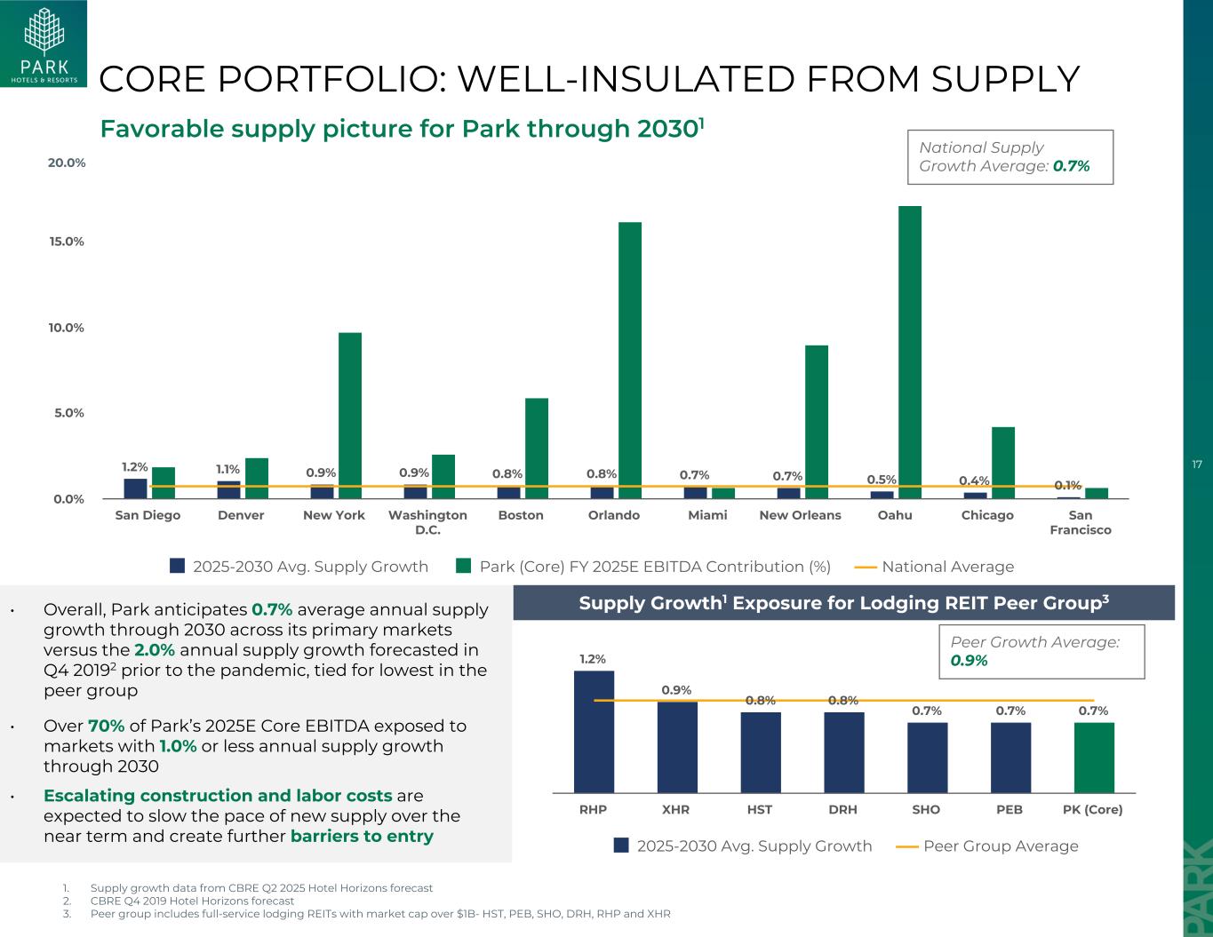 17 • Overall, Park anticipates 0.7% average annual supply growth through 2030 across its primary markets versus the 2.0% annual supply growth forecasted in Q4 20192 prior to the pandemic, tied for lowest in the peer group • Over 70% of Park’s 2025E Core EBITDA exposed to markets with 1.0% or less annual supply growth through 2030 • Escalating construction and labor costs are expected to slow the pace of new supply over the near term and create further barriers to entry CORE PORTFOLIO: WELL-INSULATED FROM SUPPLY 1.2% 1.1% 0.9% 0.9% 0.8% 0.8% 0.7% 0.7% 0.5% 0.4% 0.1% 2025-2030 Avg. Supply Growth Park (Core) FY 2025E EBITDA Contribution (%) National Average San Diego Denver New York Washington D.C. Boston Orlando Miami New Orleans Oahu Chicago San Francisco 0.0% 5.0% 10.0% 15.0% 1. Supply growth data from CBRE Q2 2025 Hotel Horizons forecast 2. CBRE Q4 2019 Hotel Horizons forecast 3. Peer group includes full-service lodging REITs with market cap over $1B- HST, PEB, SHO, DRH, RHP and XHR National Supply Growth Average: 0.7% Favorable supply picture for Park through 20301 20.0% Supply Growth1 Exposure for Lodging REIT Peer Group3 1.2% 0.9% 0.8% 0.8% 0.7% 0.7% 0.7% 2025-2030 Avg. Supply Growth Peer Group Average RHP XHR HST DRH SHO PEB PK (Core) Peer Growth Average: 0.9%