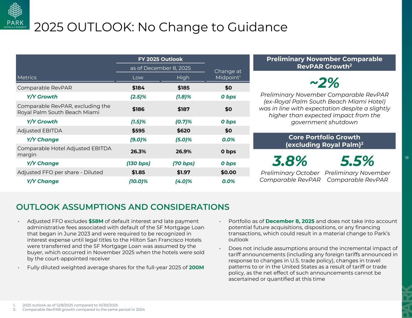 18 • Adjusted FFO excludes $58M of default interest and late payment administrative fees associated with default of the SF Mortgage Loan that began in June 2023 and were required to be recognized in interest expense until legal titles to the Hilton San Francisco Hotels were transferred and the SF Mortgage Loan was assumed by the buyer, which occurred in November 2025 when the hotels were sold by the court-appointed receiver • Fully diluted weighted average shares for the full-year 2025 of 200M 2025 OUTLOOK: No Change to Guidance OUTLOOK ASSUMPTIONS AND CONSIDERATIONS FY 2025 Outlook as of December 8, 2025 Change at Midpoint1Metrics Low High Comparable RevPAR $184 $185 $0 Y/Y Growth (2.5)% (1.8)% 0 bps Comparable RevPAR, excluding the Royal Palm South Beach Miami $186 $187 $0 Y/Y Growth (1.5)% (0.7)% 0 bps Adjusted EBITDA $595 $620 $0 Y/Y Change (9.0)% (5.0)% 0.0% Comparable Hotel Adjusted EBITDA margin 26.3% 26.9% 0 bps Y/Y Change (130 bps) (70 bps) 0 bps Adjusted FFO per share - Diluted $1.85 $1.97 $0.00 Y/Y Change (10.0)% (4.0)% 0.0% • Portfolio as of December 8, 2025 and does not take into account potential future acquisitions, dispositions, or any financing transactions, which could result in a material change to Park’s outlook • Does not include assumptions around the incremental impact of tariff announcements (including any foreign tariffs announced in response to changes in U.S. trade policy), changes in travel patterns to or in the United States as a result of tariff or trade policy, as the net effect of such announcements cannot be ascertained or quantified at this time 1. 2025 outlook as of 12/8/2025 compared to 10/30/2025 2. Comparable RevPAR growth compared to the same period in 2024 Core Portfolio Growth (excluding Royal Palm)2 3.8% Preliminary October Comparable RevPAR 5.5% Preliminary November Comparable RevPAR Preliminary November Comparable RevPAR Growth2 ~2% Preliminary November Comparable RevPAR (ex-Royal Palm South Beach Miami Hotel) was in line with expectation despite a slightly higher than expected impact from the government shutdown
