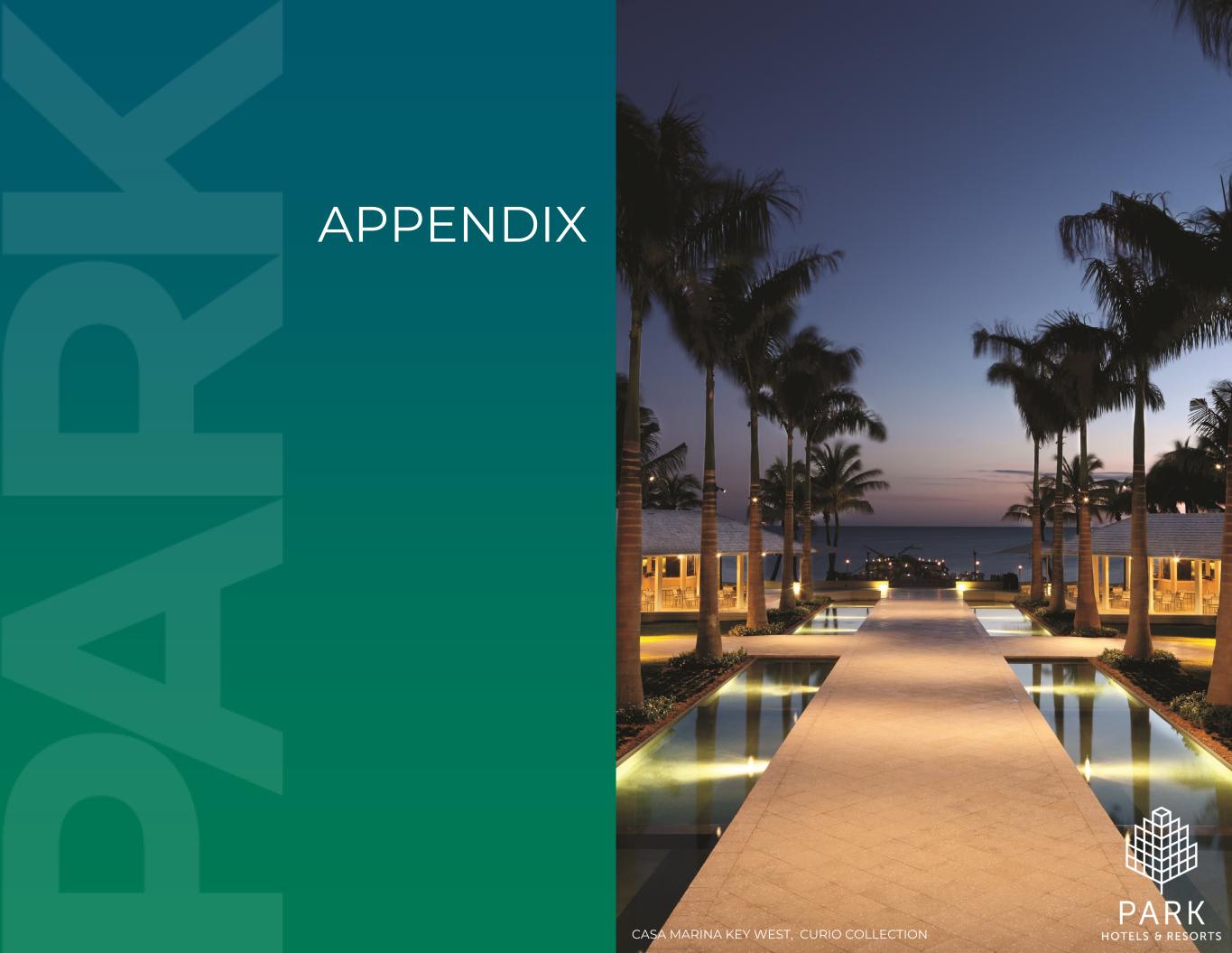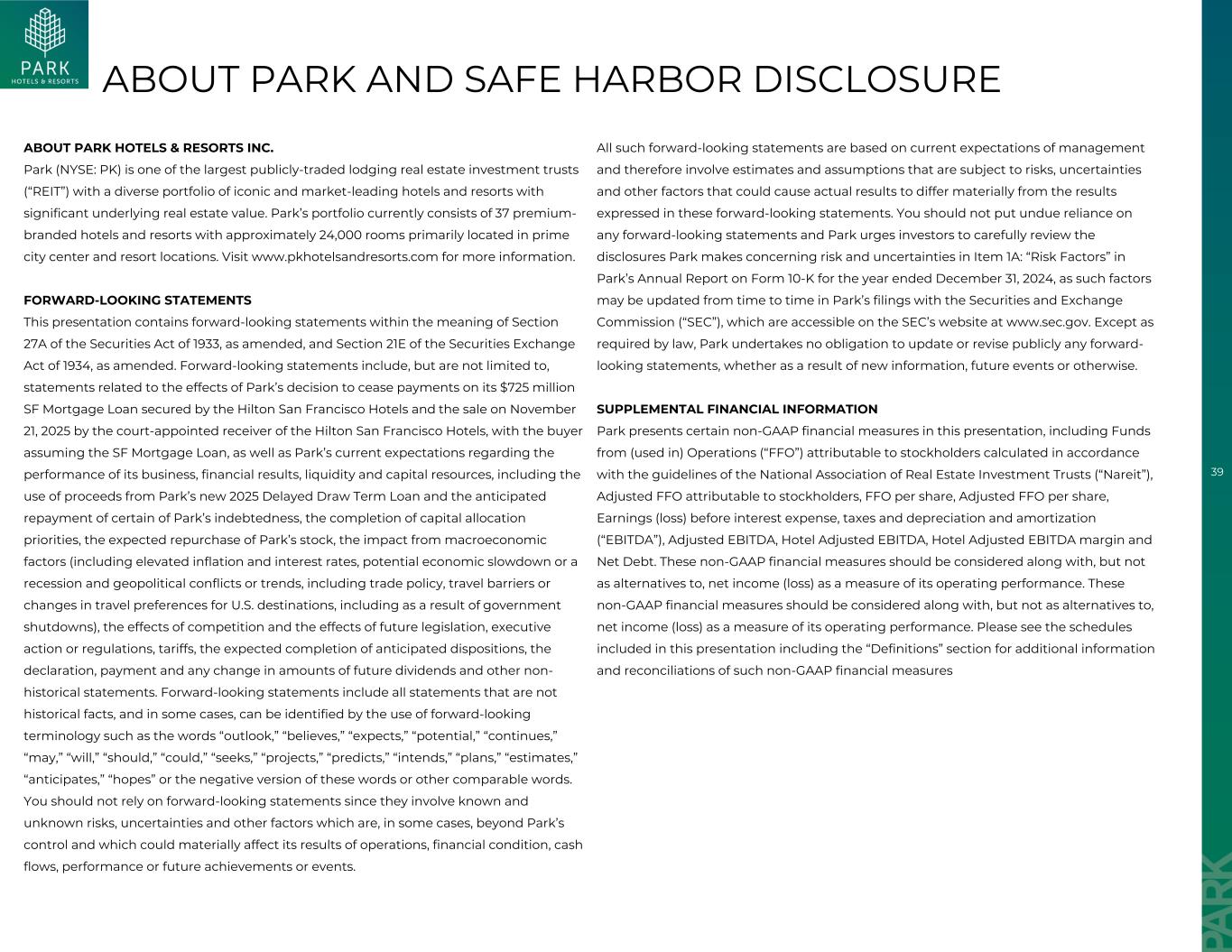 39 ABOUT PARK AND SAFE HARBOR DISCLOSURE ABOUT PARK HOTELS & RESORTS INC. Park (NYSE: PK) is one of the largest publicly-traded lodging real estate investment trusts (“REIT”) with a diverse portfolio of iconic and market-leading hotels and resorts with significant underlying real estate value. Park’s portfolio currently consists of 37 premium- branded hotels and resorts with approximately 24,000 rooms primarily located in prime city center and resort locations. Visit www.pkhotelsandresorts.com for more information. FORWARD-LOOKING STATEMENTS This presentation contains forward-looking statements within the meaning of Section 27A of the Securities Act of 1933, as amended, and Section 21E of the Securities Exchange Act of 1934, as amended. Forward-looking statements include, but are not limited to, statements related to the effects of Park’s decision to cease payments on its $725 million SF Mortgage Loan secured by the Hilton San Francisco Hotels and the sale on November 21, 2025 by the court-appointed receiver of the Hilton San Francisco Hotels, with the buyer assuming the SF Mortgage Loan, as well as Park’s current expectations regarding the performance of its business, financial results, liquidity and capital resources, including the use of proceeds from Park’s new 2025 Delayed Draw Term Loan and the anticipated repayment of certain of Park’s indebtedness, the completion of capital allocation priorities, the expected repurchase of Park’s stock, the impact from macroeconomic factors (including elevated inflation and interest rates, potential economic slowdown or a recession and geopolitical conflicts or trends, including trade policy, travel barriers or changes in travel preferences for U.S. destinations, including as a result of government shutdowns), the effects of competition and the effects of future legislation, executive action or regulations, tariffs, the expected completion of anticipated dispositions, the declaration, payment and any change in amounts of future dividends and other non- historical statements. Forward-looking statements include all statements that are not historical facts, and in some cases, can be identified by the use of forward-looking terminology such as the words “outlook,” “believes,” “expects,” “potential,” “continues,” “may,” “will,” “should,” “could,” “seeks,” “projects,” “predicts,” “intends,” “plans,” “estimates,” “anticipates,” “hopes” or the negative version of these words or other comparable words. You should not rely on forward-looking statements since they involve known and unknown risks, uncertainties and other factors which are, in some cases, beyond Park’s control and which could materially affect its results of operations, financial condition, cash flows, performance or future achievements or events. All such forward-looking statements are based on current expectations of management and therefore involve estimates and assumptions that are subject to risks, uncertainties and other factors that could cause actual results to differ materially from the results expressed in these forward-looking statements. You should not put undue reliance on any forward-looking statements and Park urges investors to carefully review the disclosures Park makes concerning risk and uncertainties in Item 1A: “Risk Factors” in Park’s Annual Report on Form 10-K for the year ended December 31, 2024, as such factors may be updated from time to time in Park’s filings with the Securities and Exchange Commission (“SEC”), which are accessible on the SEC’s website at www.sec.gov. Except as required by law, Park undertakes no obligation to update or revise publicly any forward- looking statements, whether as a result of new information, future events or otherwise. SUPPLEMENTAL FINANCIAL INFORMATION Park presents certain non-GAAP financial measures in this presentation, including Funds from (used in) Operations (“FFO”) attributable to stockholders calculated in accordance with the guidelines of the National Association of Real Estate Investment Trusts (“Nareit”), Adjusted FFO attributable to stockholders, FFO per share, Adjusted FFO per share, Earnings (loss) before interest expense, taxes and depreciation and amortization (“EBITDA”), Adjusted EBITDA, Hotel Adjusted EBITDA, Hotel Adjusted EBITDA margin and Net Debt. These non-GAAP financial measures should be considered along with, but not as alternatives to, net income (loss) as a measure of its operating performance. These non-GAAP financial measures should be considered along with, but not as alternatives to, net income (loss) as a measure of its operating performance. Please see the schedules included in this presentation including the “Definitions” section for additional information and reconciliations of such non-GAAP financial measures