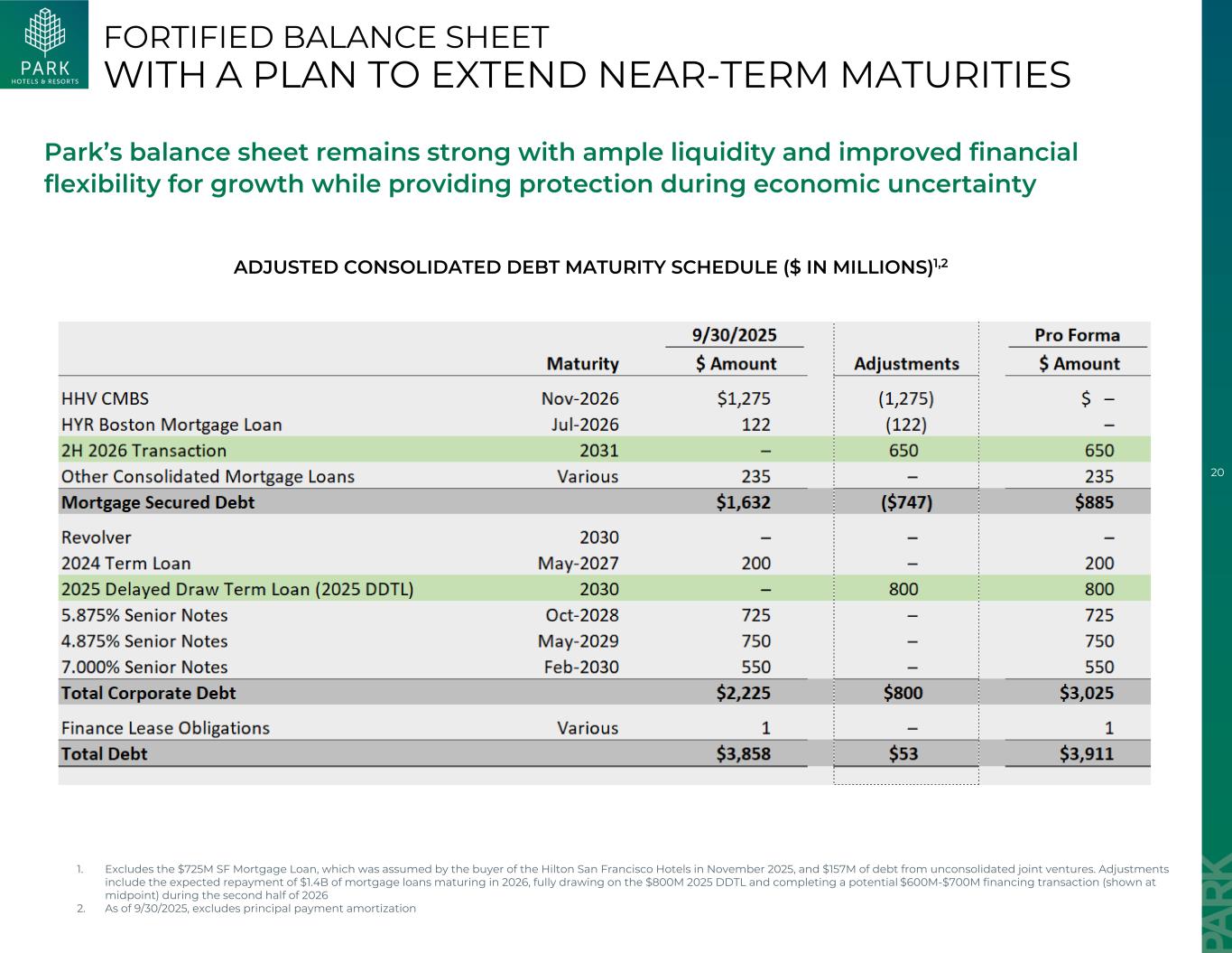 21 $725 $750 $550$200$154 $30$51 $1,000 $800 $650 Senior Notes 2024 Term Loan Cons JV Debt Property Mortgages Revolver 2025 DDTL 1H 2026 Transaction 2026 2027 2028 2029 2030 2031 FORTIFIED BALANCE SHEET FOCUS ON 2026 Park has taken steps towards a more comprehensive recapitalization to transform the balance sheet CONSOLIDATED DEBT MATURITY SCHEDULE ($ IN MILLIONS)1 $725 $750 $550$200 $1,448 $154 $30 $1,000 $800 Senior Notes 2024 Term Loan Property Mortgages Cons JV Debt Revolver 2025 DDTL 2026 2027 2028 2029 2030 2031 1. Excludes the $725M SF Mortgage Loan, which was assumed by the buyer of the Hilton San Francisco Hotels in November 2025, and $157M of debt from unconsolidated joint ventures. Adjustments include the expected repayment of $1.4B of mortgage loans maturing in 2026, fully drawing on the $800M 2025 DDTL and completing a potential $600M-$700M financing transaction (shown at the midpoint) during the second half of 2026 2 4 As of September 30, 2025 Adjusted1 2. $51M loan secured by the Hilton Denver City Center matures in 2042 but is callable by the lender with six months of notice. As of 9/30/2025, Park had not received notice from the lender 3. Includes $157M of debt from unconsolidated joint ventures 4. $1.0B Revolver assumes fully-extended maturity to September 2030 5. $800M 2025 DDTL assumes fully-extended maturity to January 2031 6. 2H 2026 Transaction amount reflects midpoint of $600M-$700M range of potential proceeds 2 5,64 5 Actual Adjusted 3Q251 3Q251 % of Debt Maturing through 20272 48% 11% % of Fixed Rate Debt 95% 58% % of Secured Debt 42% 23% Liquidity Available $2.1B $1.3B Net Debt3 $3.7B $3.7B Corporate Credit Rating (S&P/Moody's) BB-/B1 BB-/B1 • Amended and restated Park’s credit facility in September 2025, increasing the Revolver to $1.0B and adding an $800M 2025 DDTL to assist in addressing $1.4B of mortgage debt maturing in the second half of 2026 • Currently exploring secured debt options with execution expected in the second half of 2026 • Q3 2025 Net Debt to TTM Comparable Adjusted EBITDA was 6.23x3 COMMENTARY