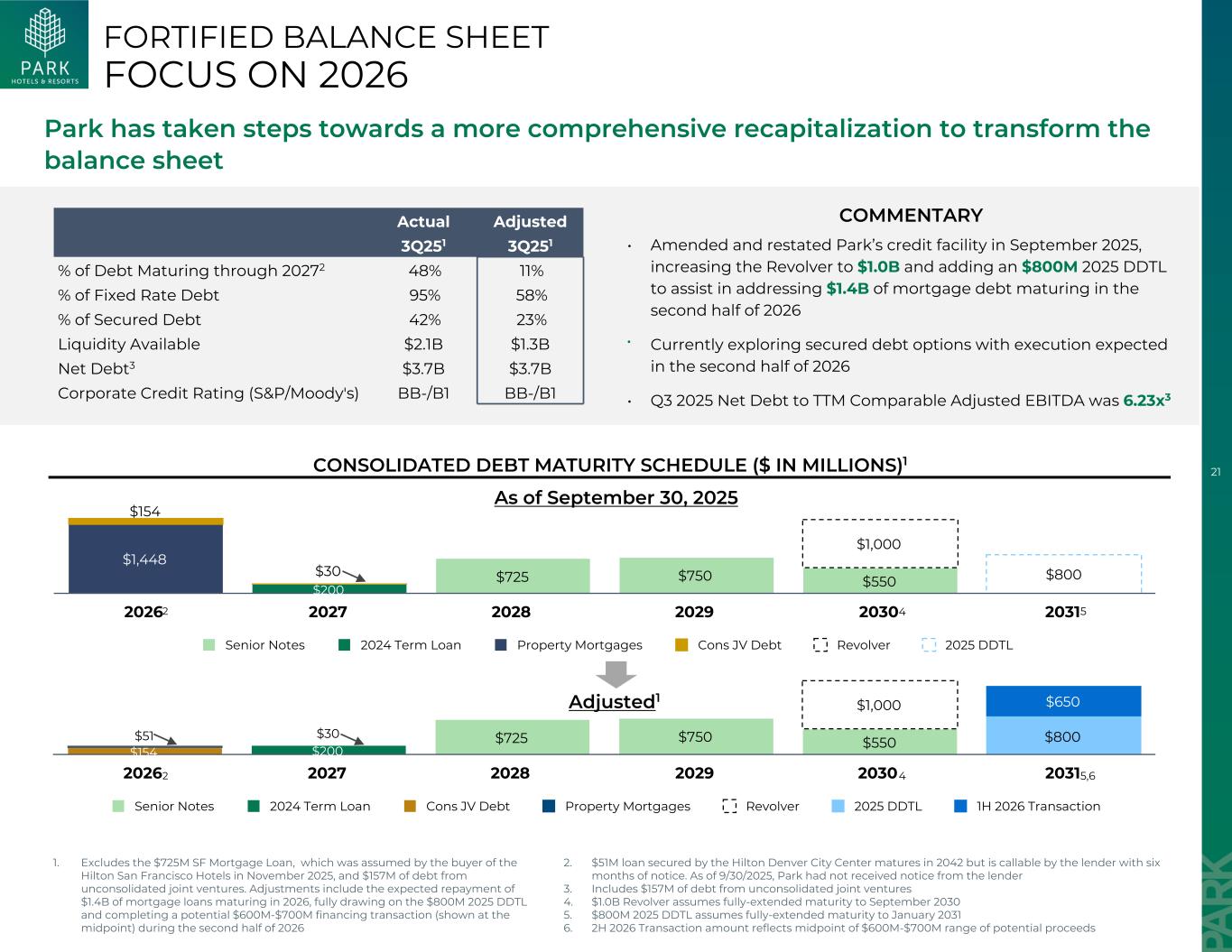 20 FORTIFIED BALANCE SHEET WITH A PLAN TO EXTEND NEAR-TERM MATURITIES Park’s balance sheet remains strong with ample liquidity and improved financial flexibility for growth while providing protection during economic uncertainty ADJUSTED CONSOLIDATED DEBT MATURITY SCHEDULE ($ IN MILLIONS)1,2 1. Excludes the $725M SF Mortgage Loan, which was assumed by the buyer of the Hilton San Francisco Hotels in November 2025, and $157M of debt from unconsolidated joint ventures. Adjustments include the expected repayment of $1.4B of mortgage loans maturing in 2026, fully drawing on the $800M 2025 DDTL and completing a potential $600M-$700M financing transaction (shown at midpoint) during the second half of 2026 2. As of 9/30/2025, excludes principal payment amortization