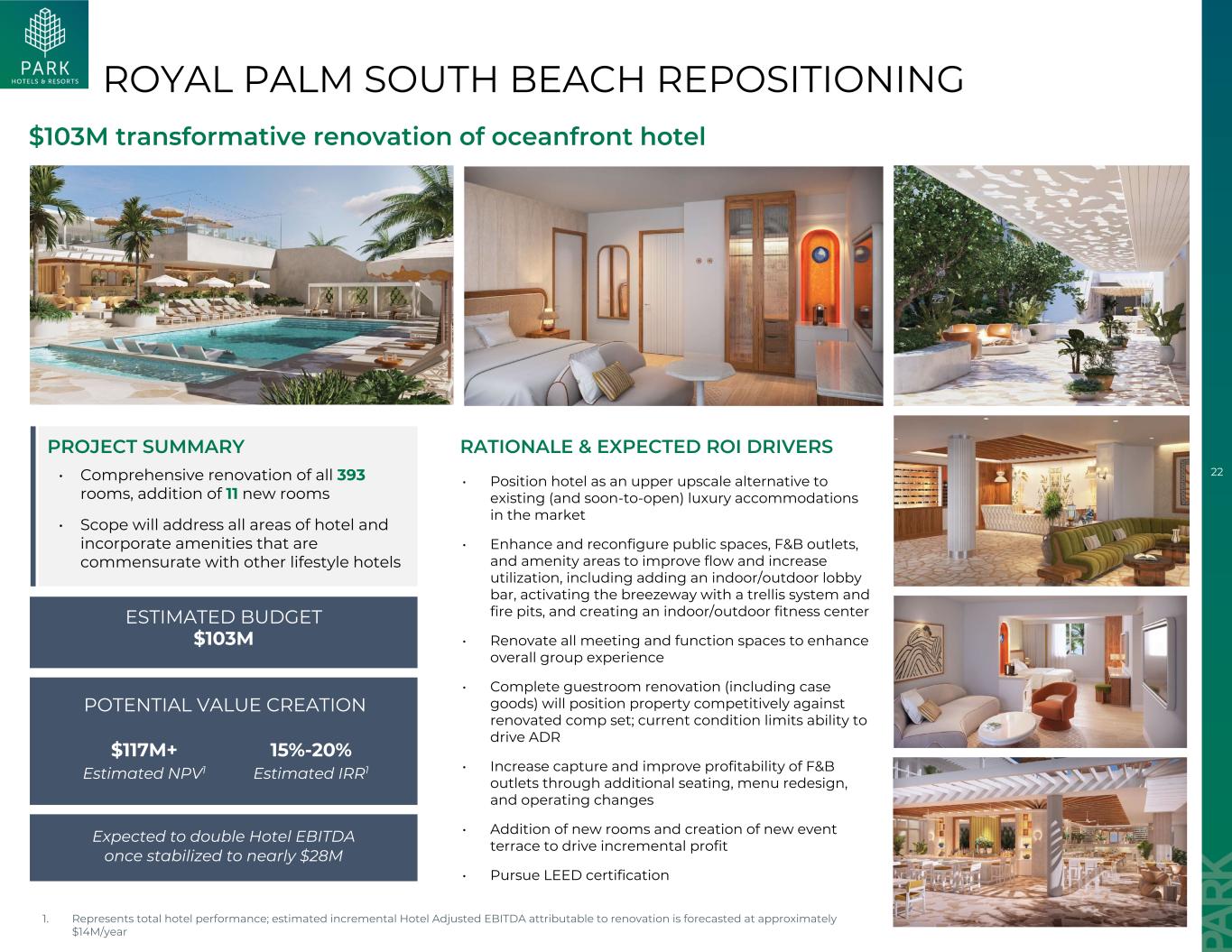 22 • Position hotel as an upper upscale alternative to existing (and soon-to-open) luxury accommodations in the market • Enhance and reconfigure public spaces, F&B outlets, and amenity areas to improve flow and increase utilization, including adding an indoor/outdoor lobby bar, activating the breezeway with a trellis system and fire pits, and creating an indoor/outdoor fitness center • Renovate all meeting and function spaces to enhance overall group experience • Complete guestroom renovation (including case goods) will position property competitively against renovated comp set; current condition limits ability to drive ADR • Increase capture and improve profitability of F&B outlets through additional seating, menu redesign, and operating changes • Addition of new rooms and creation of new event terrace to drive incremental profit • Pursue LEED certification $103M transformative renovation of oceanfront hotel RATIONALE & EXPECTED ROI DRIVERS ROYAL PALM SOUTH BEACH REPOSITIONING PROJECT SUMMARY • Comprehensive renovation of all 393 rooms, addition of 11 new rooms • Scope will address all areas of hotel and incorporate amenities that are commensurate with other lifestyle hotels 1. Represents total hotel performance; estimated incremental Hotel Adjusted EBITDA attributable to renovation is forecasted at approximately $14M/year POTENTIAL VALUE CREATION $117M+ Estimated NPV1 15%-20% Estimated IRR1 ESTIMATED BUDGET $103M Expected to double Hotel EBITDA once stabilized to nearly $28M