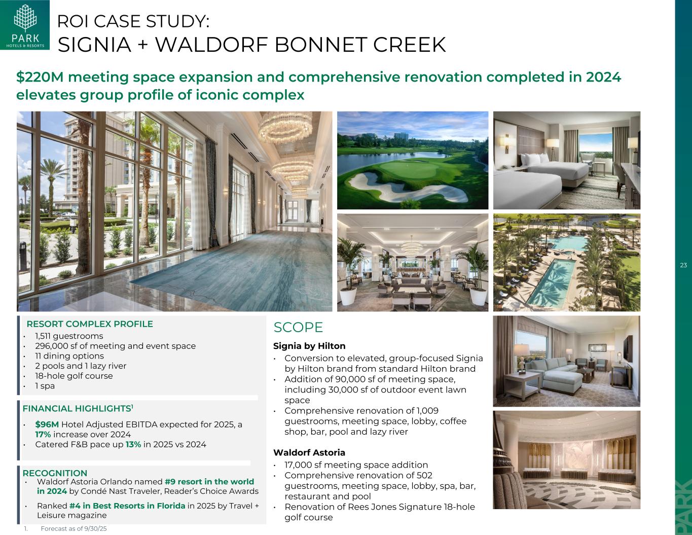 23 Signia by Hilton • Conversion to elevated, group-focused Signia by Hilton brand from standard Hilton brand • Addition of 90,000 sf of meeting space, including 30,000 sf of outdoor event lawn space • Comprehensive renovation of 1,009 guestrooms, meeting space, lobby, coffee shop, bar, pool and lazy river Waldorf Astoria • 17,000 sf meeting space addition • Comprehensive renovation of 502 guestrooms, meeting space, lobby, spa, bar, restaurant and pool • Renovation of Rees Jones Signature 18-hole golf course ROI CASE STUDY: $220M meeting space expansion and comprehensive renovation completed in 2024 elevates group profile of iconic complex SCOPE SIGNIA + WALDORF BONNET CREEK FINANCIAL HIGHLIGHTS1 RESORT COMPLEX PROFILE • 1,511 guestrooms • 296,000 sf of meeting and event space • 11 dining options • 2 pools and 1 lazy river • 18-hole golf course • 1 spa 1. Forecast as of 9/30/25 • $96M Hotel Adjusted EBITDA expected for 2025, a 17% increase over 2024 • Catered F&B pace up 13% in 2025 vs 2024 • Waldorf Astoria Orlando named #9 resort in the world in 2024 by Condé Nast Traveler, Reader’s Choice Awards • Ranked #4 in Best Resorts in Florida in 2025 by Travel + Leisure magazine RECOGNITION