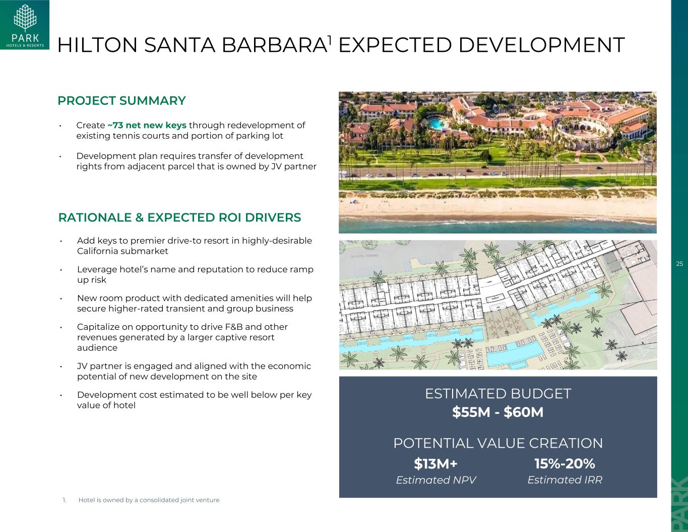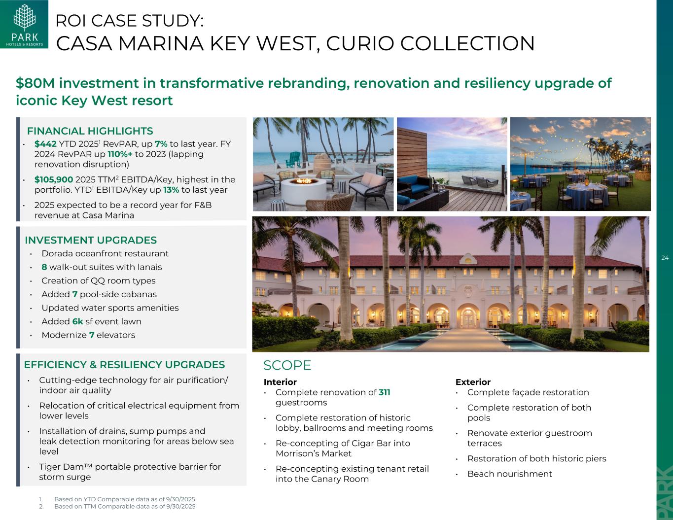 24 • Cutting-edge technology for air purification/ indoor air quality • Relocation of critical electrical equipment from lower levels • Installation of drains, sump pumps and leak detection monitoring for areas below sea level • Tiger Dam™ portable protective barrier for storm surge • Dorada oceanfront restaurant • 8 walk-out suites with lanais • Creation of QQ room types • Added 7 pool-side cabanas • Updated water sports amenities • Added 6k sf event lawn • Modernize 7 elevators ROI CASE STUDY: $80M investment in transformative rebranding, renovation and resiliency upgrade of iconic Key West resort EFFICIENCY & RESILIENCY UPGRADES FINANCIAL HIGHLIGHTS • $442 YTD 20251 RevPAR, up 7% to last year. FY 2024 RevPAR up 110%+ to 2023 (lapping renovation disruption) • $105,900 2025 TTM2 EBITDA/Key, highest in the portfolio. YTD1 EBITDA/Key up 13% to last year • 2025 expected to be a record year for F&B revenue at Casa Marina INVESTMENT UPGRADES Interior • Complete renovation of 311 guestrooms • Complete restoration of historic lobby, ballrooms and meeting rooms • Re-concepting of Cigar Bar into Morrison’s Market • Re-concepting existing tenant retail into the Canary Room SCOPE Exterior • Complete façade restoration • Complete restoration of both pools • Renovate exterior guestroom terraces • Restoration of both historic piers • Beach nourishment CASA MARINA KEY WEST, CURIO COLLECTION 1. Based on YTD Comparable data as of 9/30/2025 2. Based on TTM Comparable data as of 9/30/2025