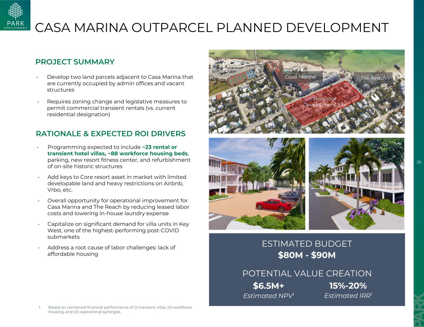 26 CASA MARINA OUTPARCEL PLANNED DEVELOPMENT • Develop two land parcels adjacent to Casa Marina that are currently occupied by admin offices and vacant structures • Requires zoning change and legislative measures to permit commercial transient rentals (vs. current residential designation) • Programming expected to include ~23 rental or transient hotel villas, ~88 workforce housing beds, parking, new resort fitness center, and refurbishment of on-site historic structures • Add keys to Core resort asset in market with limited developable land and heavy restrictions on Airbnb, Vrbo, etc. • Overall opportunity for operational improvement for Casa Marina and The Reach by reducing leased labor costs and lowering in-house laundry expense • Capitalize on significant demand for villa units in Key West, one of the highest-performing post-COVID submarkets • Address a root cause of labor challenges: lack of affordable housing PROJECT SUMMARY RATIONALE & EXPECTED ROI DRIVERS Potential Development Site Casa Marina The Reach 1. Based on combined financial performance of (i) transient villas, (ii) workforce housing, and (iii) operational synergies POTENTIAL VALUE CREATION $6.5M+ Estimated NPV1 15%-20% Estimated IRR1 ESTIMATED BUDGET $80M - $90M