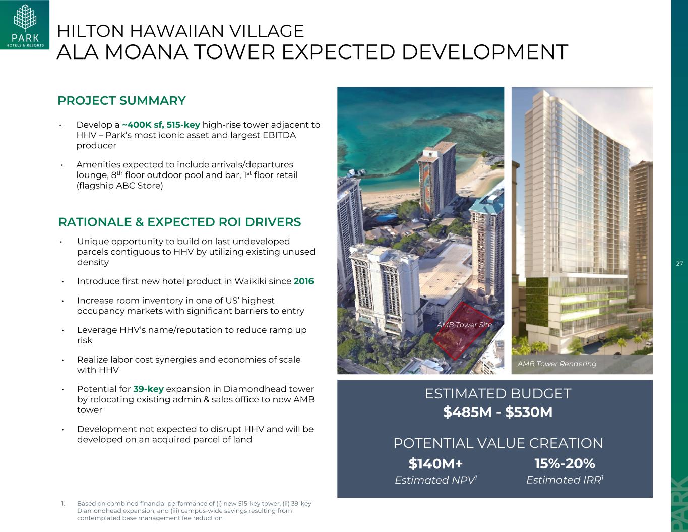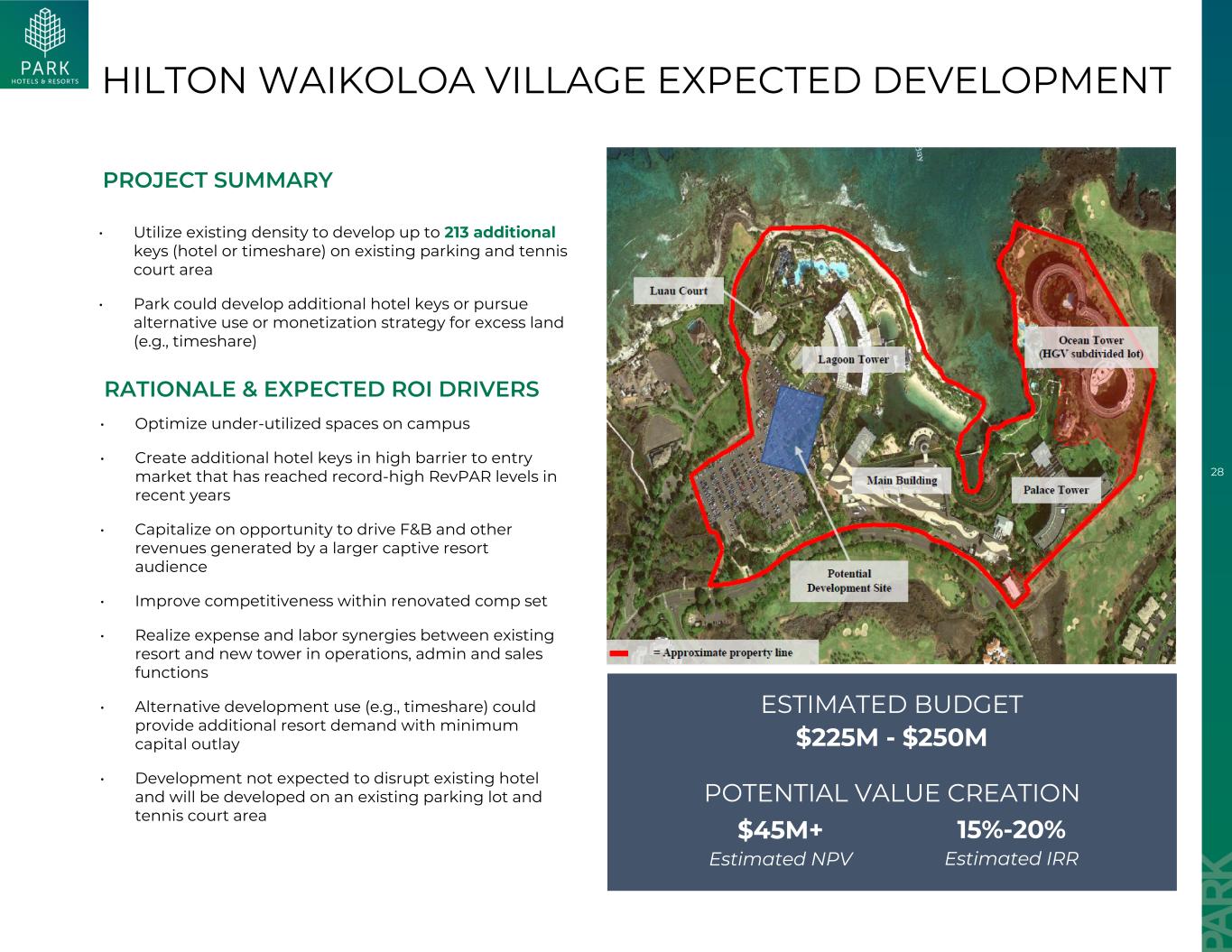 27 HILTON HAWAIIAN VILLAGE ALA MOANA TOWER EXPECTED DEVELOPMENT • Develop a ~400K sf, 515-key high-rise tower adjacent to HHV – Park’s most iconic asset and largest EBITDA producer • Amenities expected to include arrivals/departures lounge, 8th floor outdoor pool and bar, 1st floor retail (flagship ABC Store) • Unique opportunity to build on last undeveloped parcels contiguous to HHV by utilizing existing unused density • Introduce first new hotel product in Waikiki since 2016 • Increase room inventory in one of US’ highest occupancy markets with significant barriers to entry • Leverage HHV’s name/reputation to reduce ramp up risk • Realize labor cost synergies and economies of scale with HHV • Potential for 39-key expansion in Diamondhead tower by relocating existing admin & sales office to new AMB tower • Development not expected to disrupt HHV and will be developed on an acquired parcel of land PROJECT SUMMARY RATIONALE & EXPECTED ROI DRIVERS 1. Based on combined financial performance of (i) new 515-key tower, (ii) 39-key Diamondhead expansion, and (iii) campus-wide savings resulting from contemplated base management fee reduction AMB Tower Site AMB Tower Rendering POTENTIAL VALUE CREATION $140M+ Estimated NPV1 15%-20% Estimated IRR1 ESTIMATED BUDGET $485M - $530M