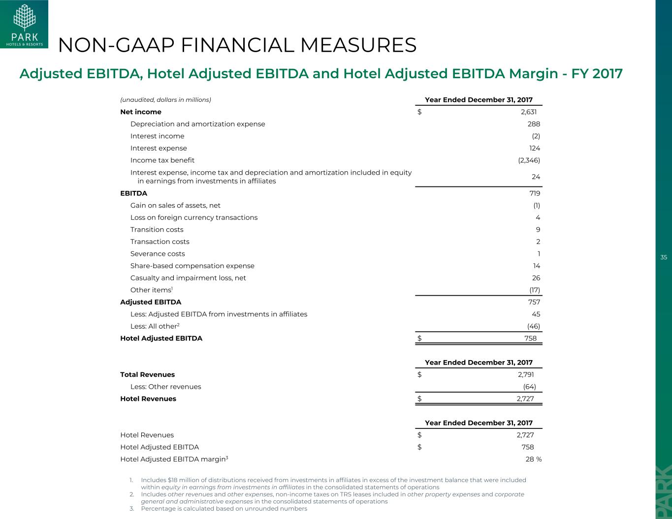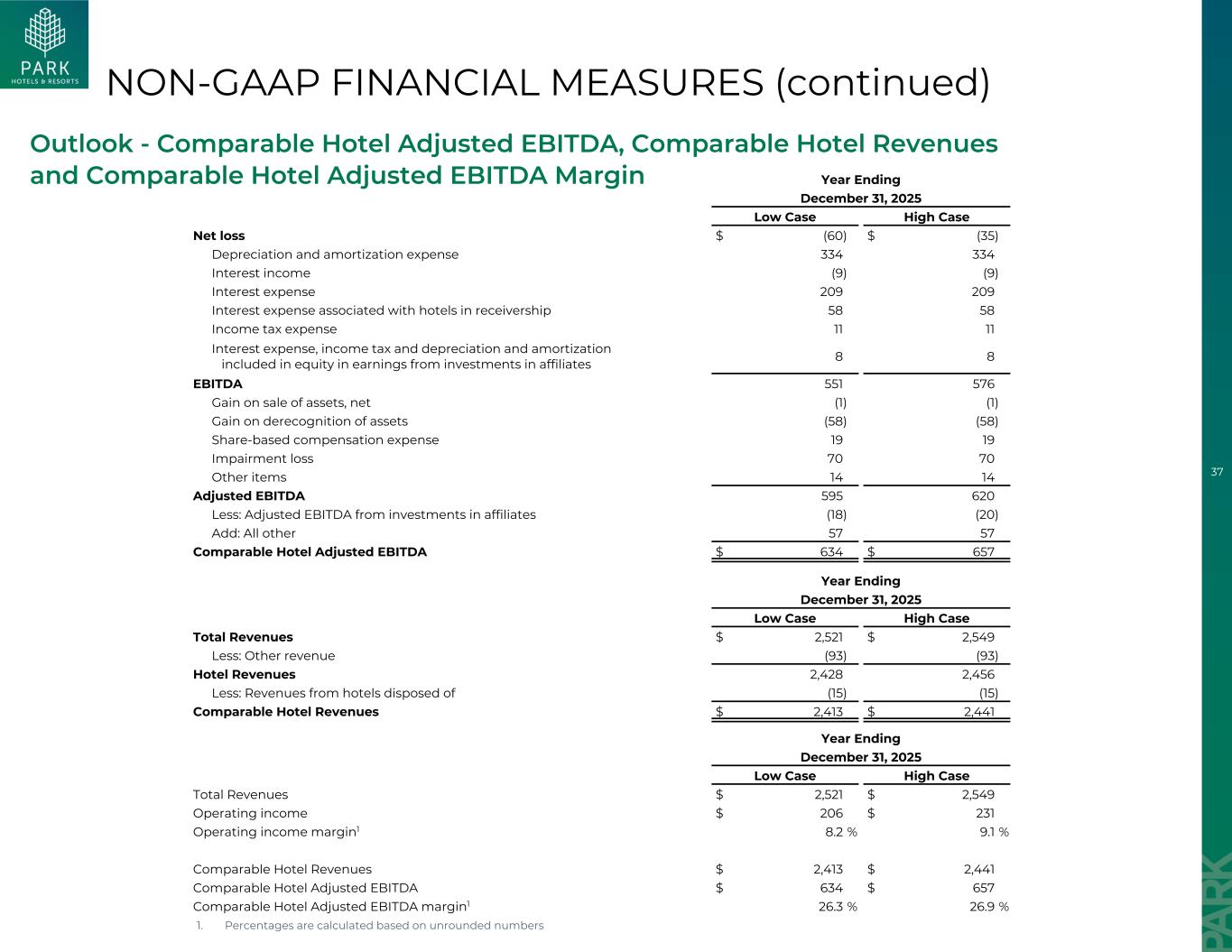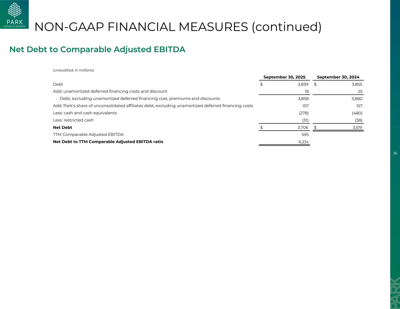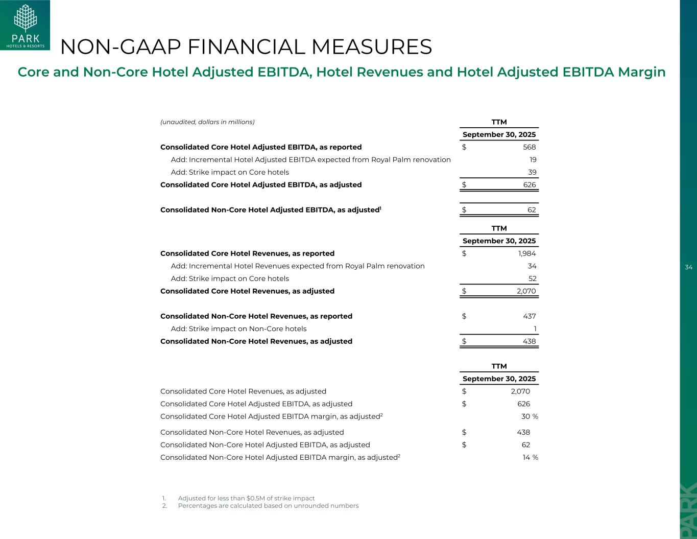 33 NON-GAAP FINANCIAL MEASURES Comparable, Core and Non-Core Adjusted EBITDA, Hotel Adjusted EBITDA and Hotel Revenues (unaudited, in millions) TTM Nine Months Ended Year Ended September 30, 2025 September 30, 2025 September 30, 2024 December 31, 2024 Net (loss) income $ — $ (73) $ 153 $ 226 Depreciation and amortization expense 334 269 192 257 Interest income (13) (8) (16) (21) Interest expense 211 158 161 214 Interest expense associated with hotels in receivership1 64 48 44 60 Income tax (benefit) expense (44) 8 (9) (61) Interest expense, income tax and depreciation and amortization included in equity in earnings from investments in affiliates 7 6 9 10 EBITDA 559 408 534 685 Gain on sales of assets, net2 (9) (1) (19) (27) Gain on derecognition of assets1 (64) (48) (44) (60) Share-based compensation expense 19 14 14 19 Impairment and casualty loss 71 70 13 14 Other items 19 14 16 21 Adjusted EBITDA 595 457 514 652 Less: Adjusted EBITDA from hotels disposed of — — (3) (3) Less: Adjusted EBITDA from investments in affiliates disposed of — — (2) (2) Comparable Adjusted EBITDA 595 457 509 647 Less: Adjusted EBITDA from investments in affiliates (20) (16) (17) (21) Add: All other3 55 42 41 54 Comparable Hotel Adjusted EBITDA, as reported 630 483 533 680 Less: Hotel Adjusted EBITDA from Non-Core hotels, as reported 62 48 63 77 Consolidated Core Hotel Adjusted EBITDA, as reported $ 568 $ 435 $ 470 $ 603 1. Represents accrued interest expense associated with the default of the SF Mortgage Loan, which was offset by a gain on derecognition for the corresponding increase of the contract asset on the condensed consolidated balance sheets, as Park expected to be released from this obligation upon final resolution with the lender. The SF Mortgage Loan was assumed by the buyer of the Hilton San Francisco Hotels when the hotels were sold in November 2025 by the court-appointed receiver 2. For 2024, includes a gain of $19 million on the sale of the Hilton La Jolla Torrey Pines included in equity in earnings from investments in affiliates in the condensed consolidated statements of operations 3. Includes other revenues and other expenses, non-income taxes on TRS leases included in other property expenses and corporate general and administrative expenses in the condensed consolidated statements of operations (unaudited, in millions) TTM Nine Months Ended Year Ended September 30, 2025 September 30, 2025 September 30, 2024 December 31, 2024 Total Revenues $ 2,537 $ 1,912 $ 1,974 $ 2,599 Less: Other Revenues (90) (68) (64) $ (86) Less: Revenues from hotels disposed of (26) (16) (48) $ (58) Comparable Hotel Revenues, as reported 2,421 1,828 1,862 2,455 Less: Hotel Revenues from Non-Core hotels, as reported (437) (329) (340) (448) Consolidated Core Hotel Revenues, as reported $ 1,984 $ 1,499 $ 1,522 $ 2,007